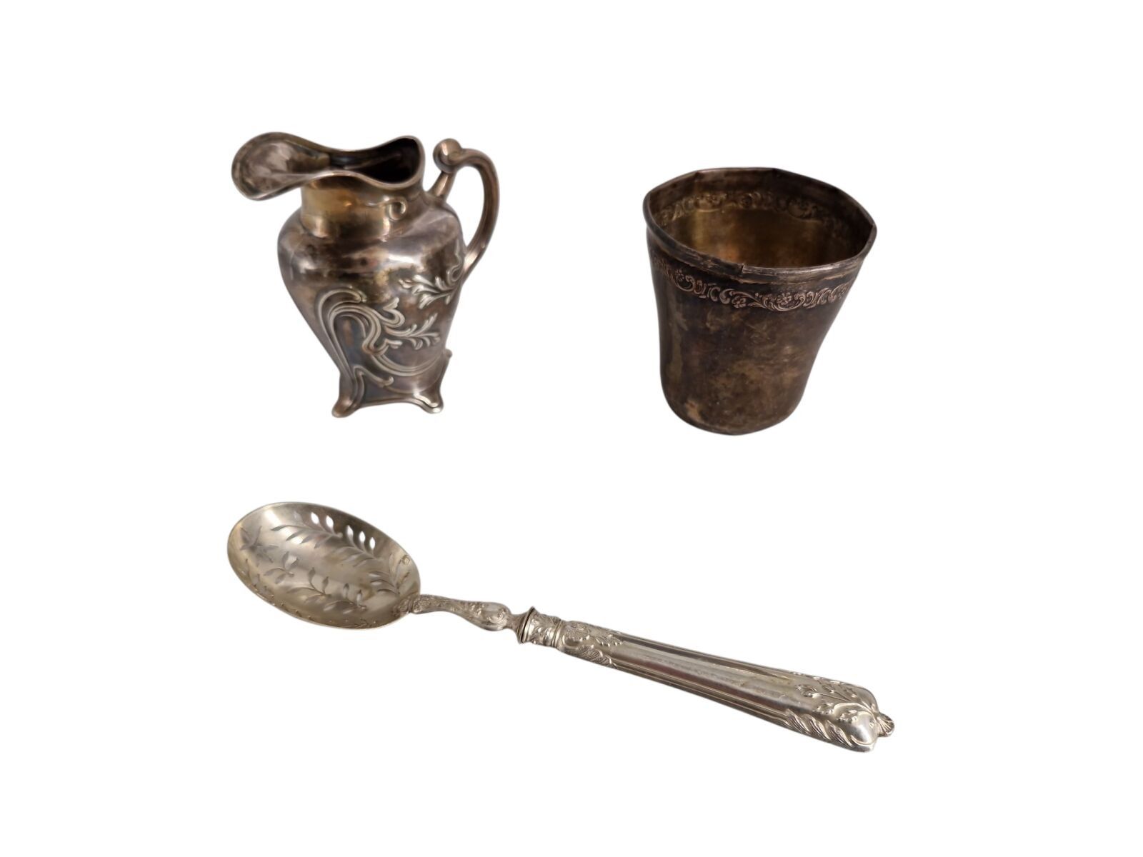 Lot en argent comprenant : crémier, timbale (bosses) Poids : 135 gr Joint une cuillère à saupudrer. poids brut : 30 gr