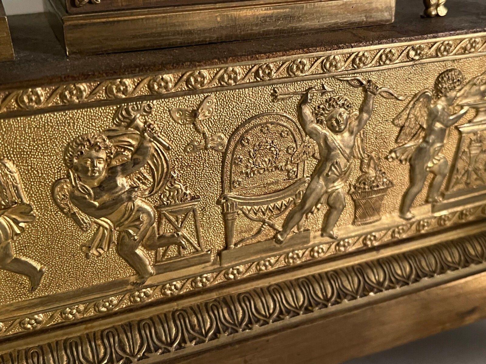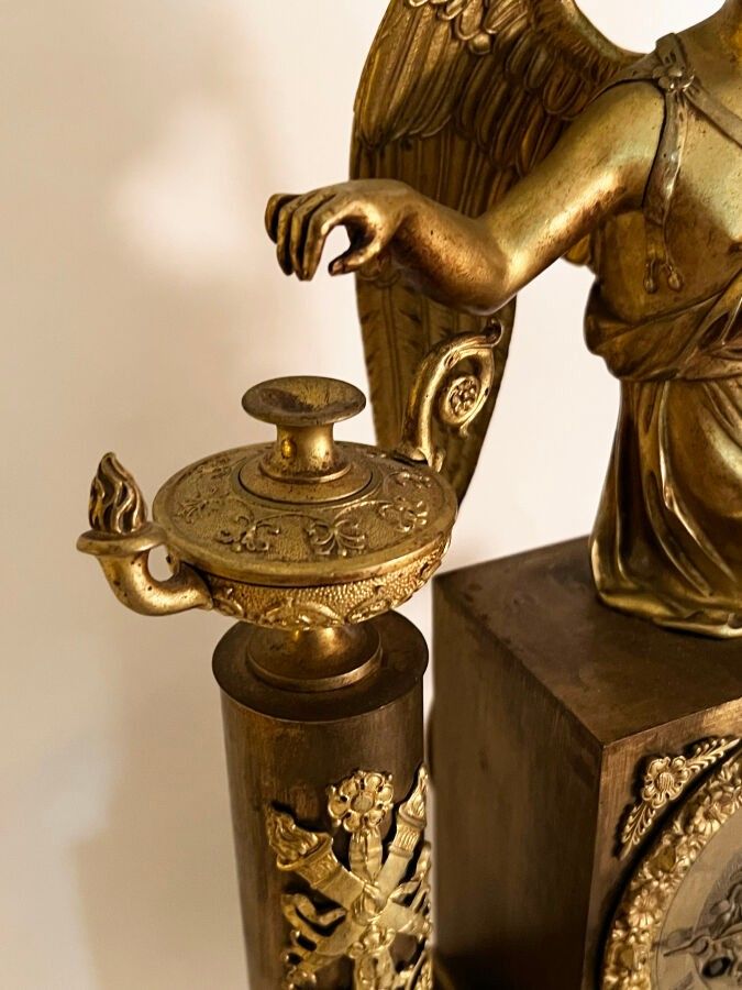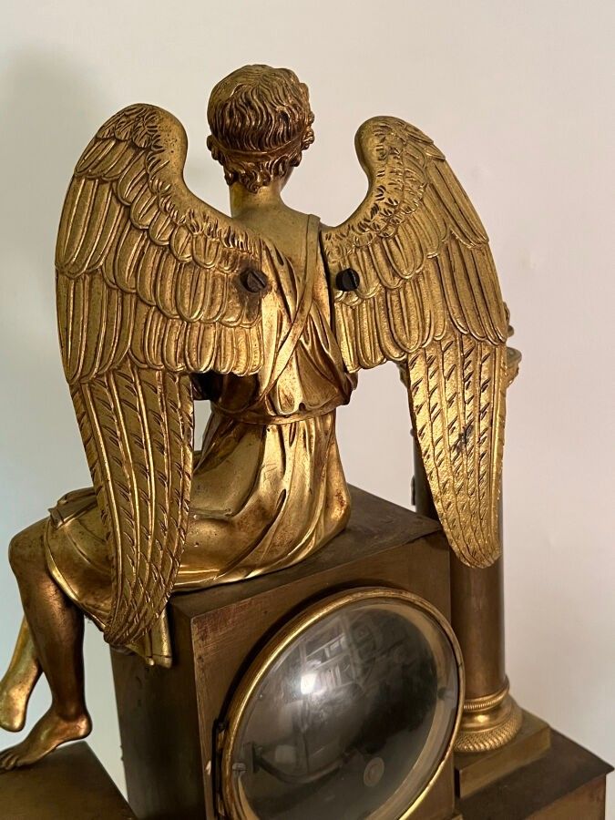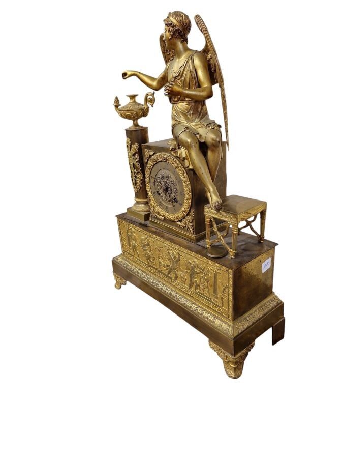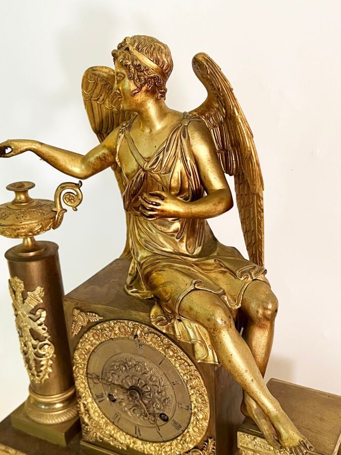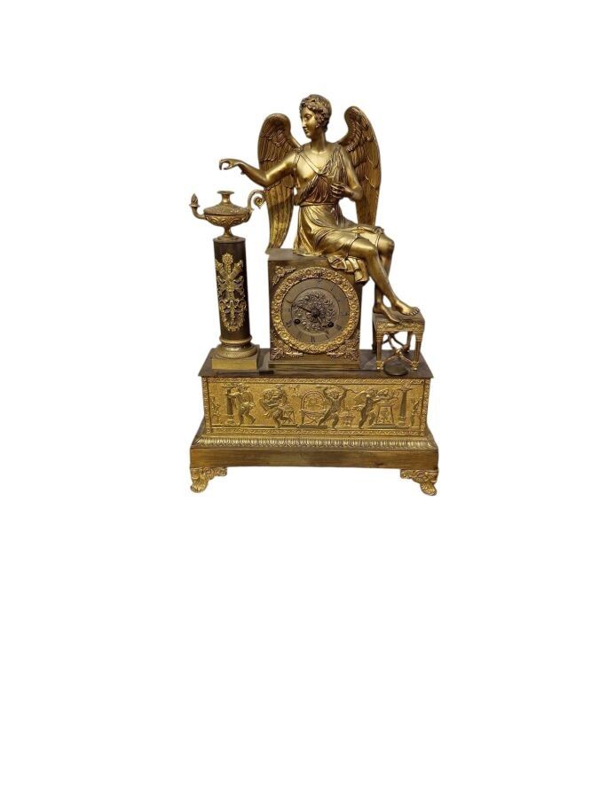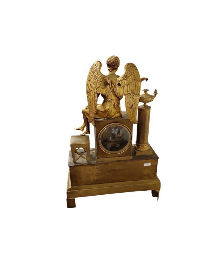 Pendule en bronze ciselé et doré à décor d'un ange assis vêtue à l'antique les pieds posés sur un tabouret flanqué d'une colonne surmontée d'une lampe à huile, la base rectangulaire ornée d'une frise d'angelots, frise de feuilles d'eau, l'ensemble reposant sur quatre patins, Epoque Restauration. H. : 47 cm ; L. : 32,5 cm (manque probablement un attribut, manque le timbre, usures)