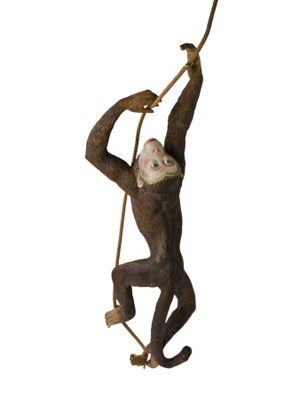 Grand singe en biscuit de porcelaine polychrome, suspendu à …