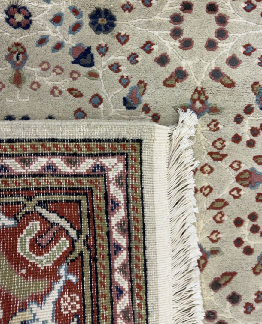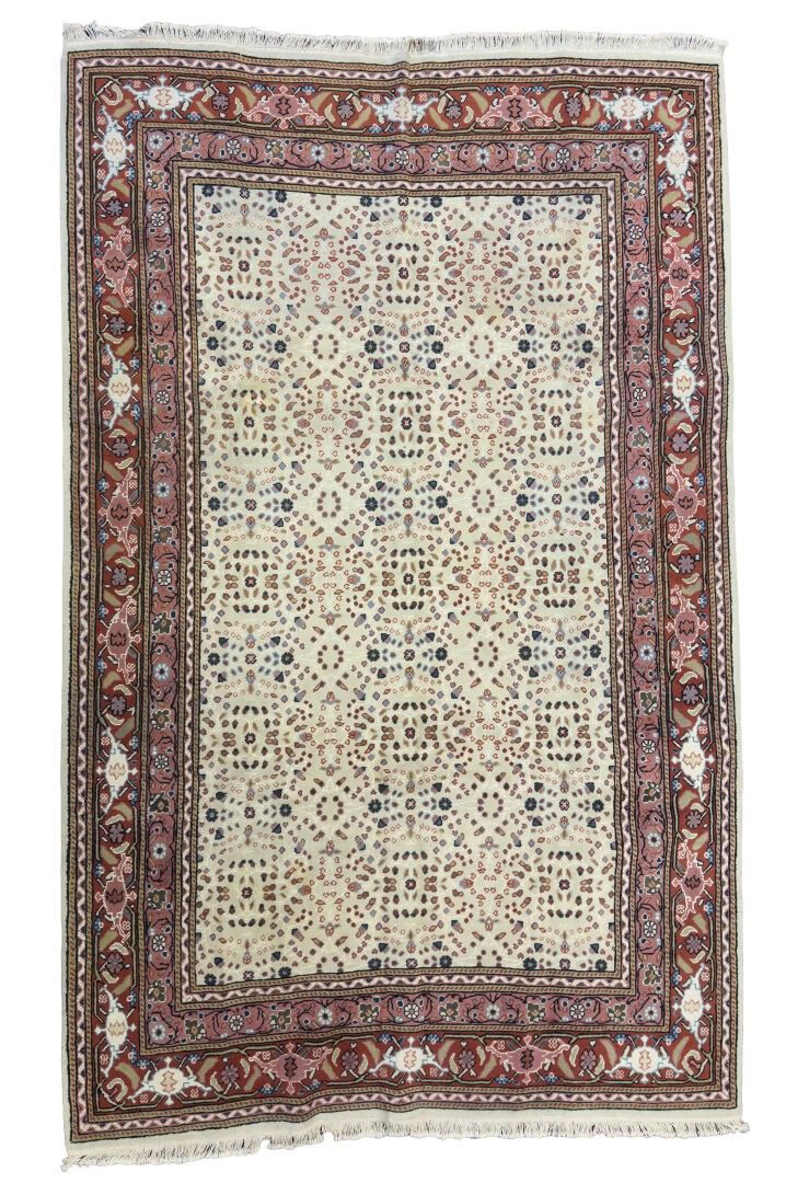 Tapis en laine, nouée à la main, à décor de semis de fleurs sur fond ivoire. L'ensemble cerné par de multiples bordures géométriques florales stylisées en polychromie.