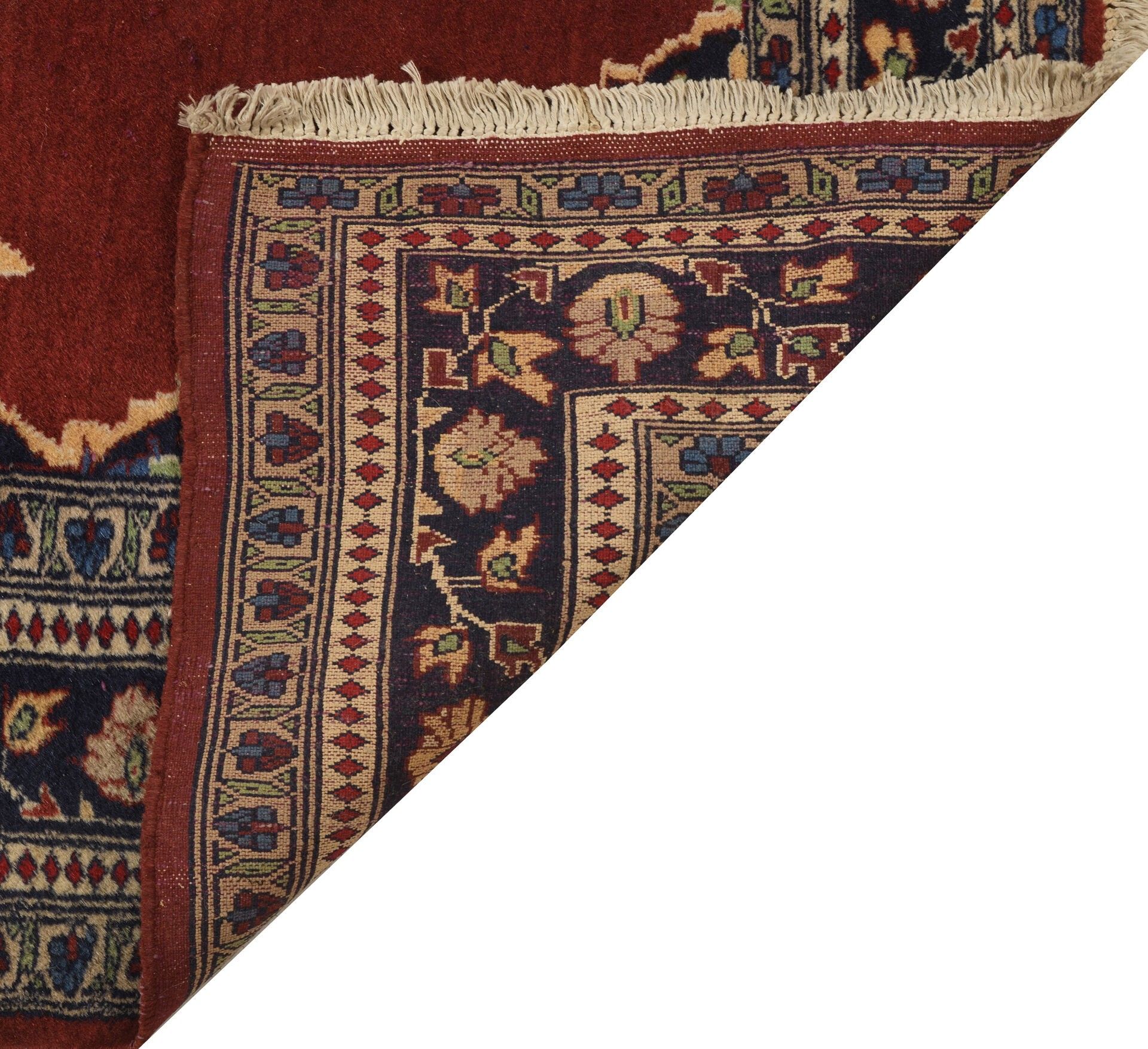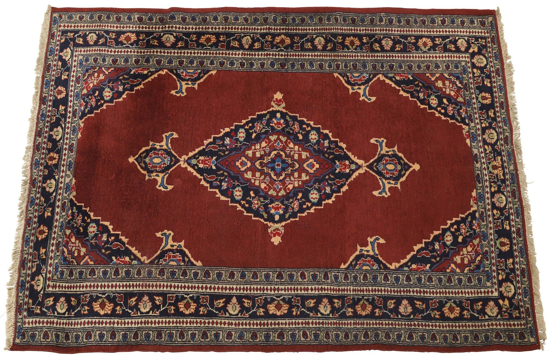 Tapis en laine, noué à la main, à décor d'une rosace centrale sur fond rouge encadrée de quatre écoinçons et plusieurs bordures sur fond bleu marine.