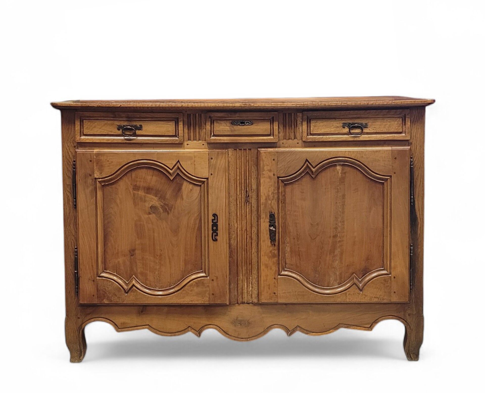 BUFFET en merisier et en noyer mouluré et sculpté, ouvre par trois tiroirs en ceinture et par deux vantaux séparés par un faux dormant cannelé, repose sur des pieds cambrés.