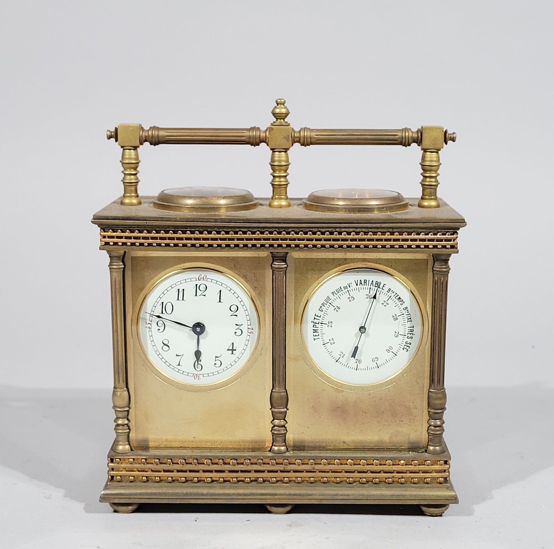 PENDULE d'officier en laiton doré avec baromètre et boussole, les cadrans émaillés.