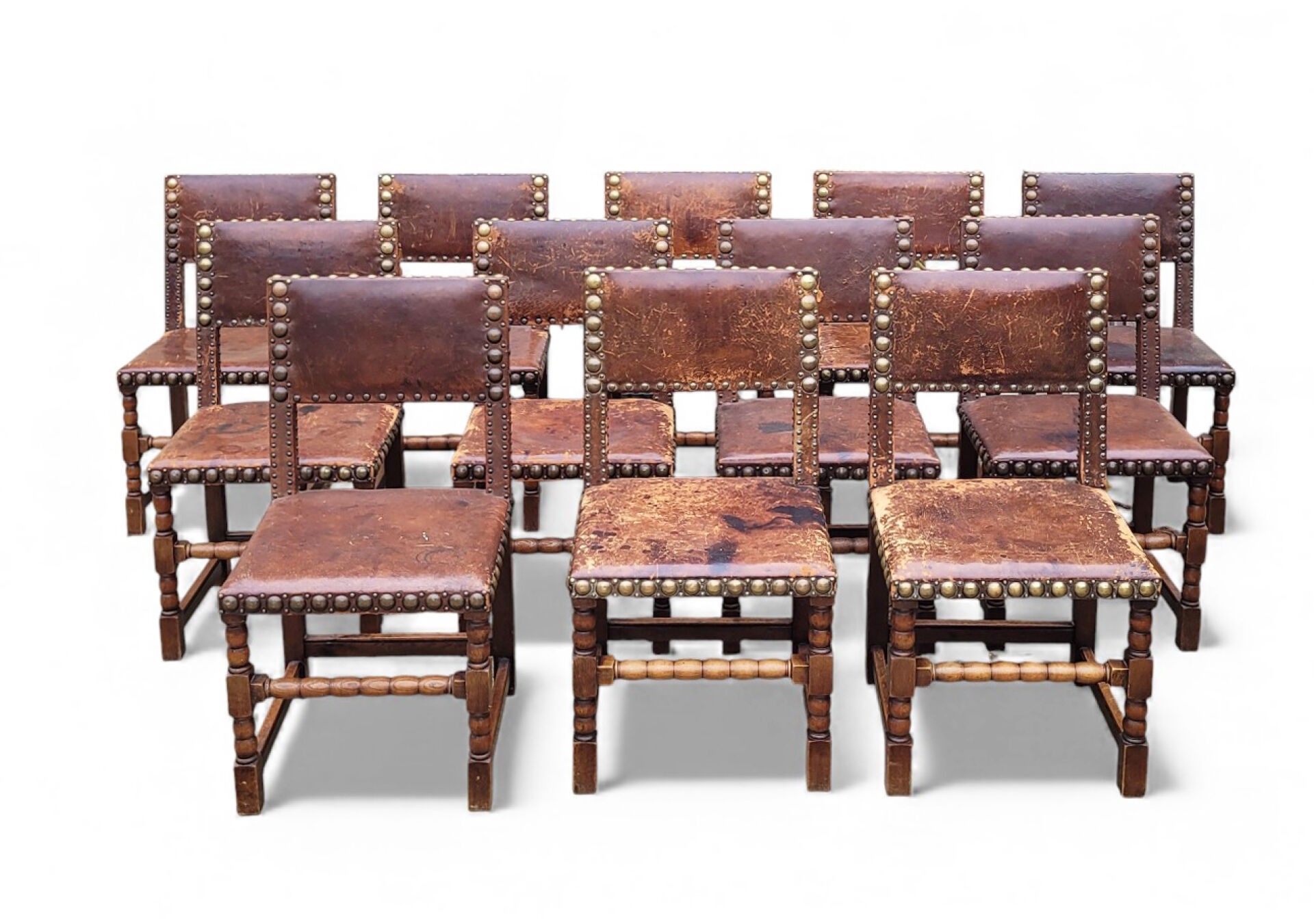 SUITE DE DOUZE CHAISES à dossier droit en cuir clouté, piète…