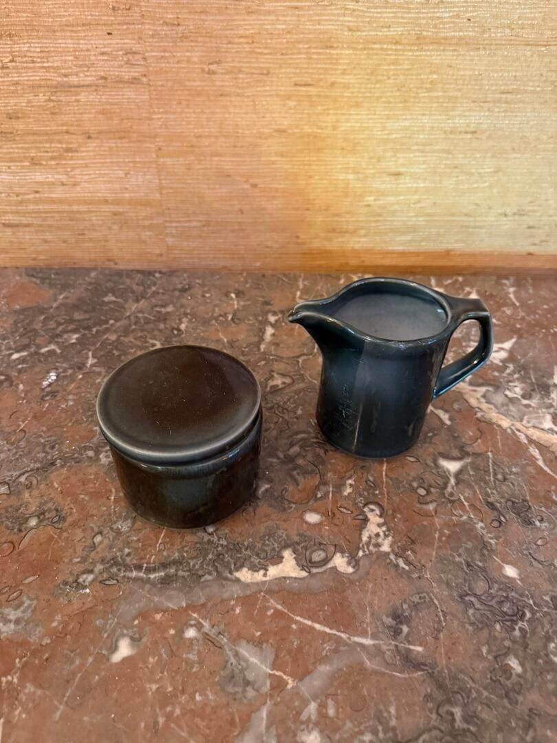 Pot à lait et sucrier couvert en porcelaine émaillée irisée vert-bleu.