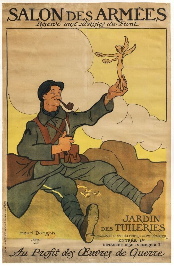 Henri Dangon () - Salon des armées, réservé aux artistes du front. 1917. Imprimeur Chachoin, Paris. 120x78cm. Affiche originale, lithographie, entoilée. Condition B+, manques marginaux restaurés. Un jeune poilu sculpte une victoire, rappellent l'omni présence de l'art populaire dans les tranches lors de la Première Guerre Mondiale. Le salon avait lieu au Jardin des Tuileries. Porte un tampon de la Xème armée.