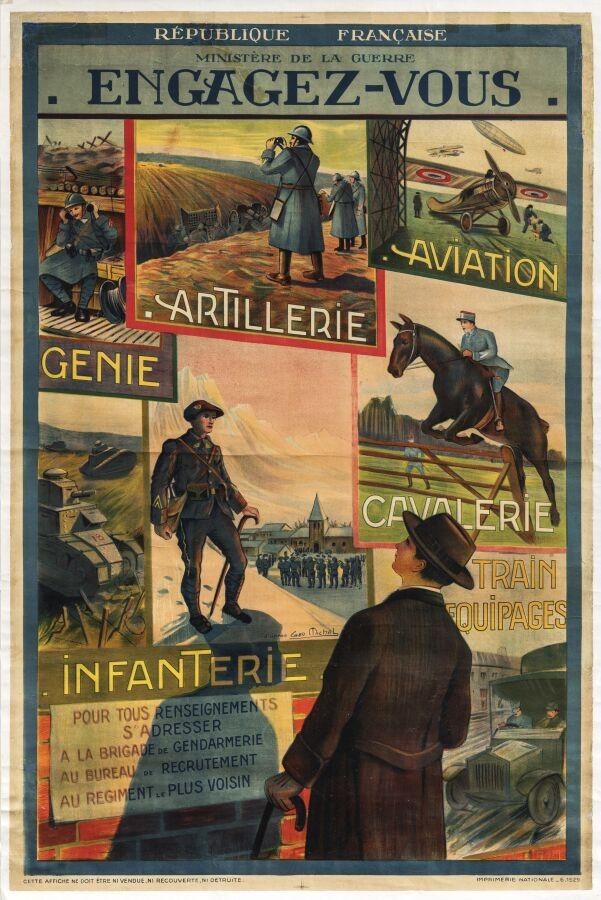 Georges Dreyfus dit Geo Michel (1883-1985) - Ministère de la guerre, engagez-vous. 1929. Imprimerie nationale. 120x79cm. Affiche originale, lithographie, entoilée. Condition A-, traces de déchirures marginales, certaines avec petits manques restaurés. Toute l'armée (de terre) française en une image. Avec le génie, l'artillerie, l'aviation tout juste née, la cavalerie, l'infanterie, même les chasseurs alpins et les ambulancier mis en scène dans une image, promesse d'avenir offert au jeune passant qui contemple cette mise en abyme d'affiches. Rare affiche.