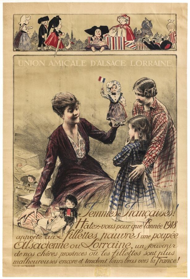 Henri Paul Royer (1869-1938) - Union amicale d'Alsace Lorraine. 1918. Imprimeur Lapina, Paris. 114x77cm. Affiche originale, lithographie, entoilée. Condition A- deux restauration dans la marge inférieure. Comme le rappelle le texte, cette association donnait des poupées aux jeunes filles pauvres victimes des maux de la Première Guerre Mondiale. On soulignera la subtile exacerbation des couleurs du drapeau français dans toute l'affiche.
