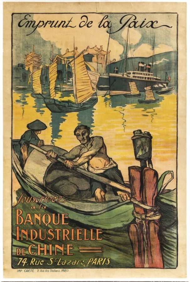 Anonyme - Emprunt de la Paix, banque industrielle de Chine. Circa 1920. Imprimeur Creté, Paris. 119x78cm. Affiche originale, lithographie, entoilée. Condition A-, petites perforations marginales. Une scène traditionnelle mettant en avant des pêcheurs alors qu'en arrière plan vogue un paquebot battant pavillon français.