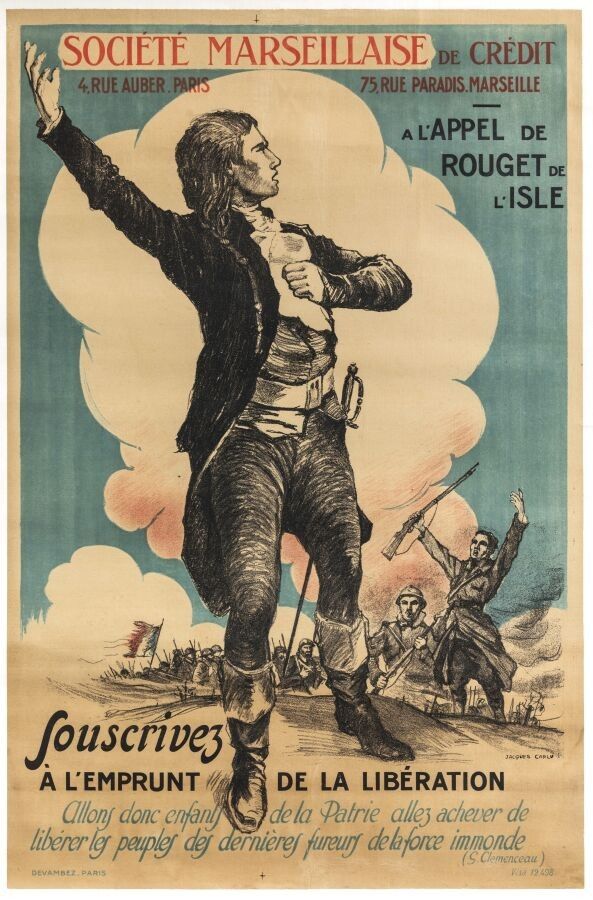 Jacques Carlu (1890-1976) - Société marseillaise de Crédit. Souscrivez à l'emprunt de la libération. 1918. Imprimeur Devambez. 120x79cm. Affiche originale, lithographie, entoilée. Condition B+, une déchirure. On nous présente Rouget de l'Isle, compositeur de l'hymne français, montrant la voie vers la victoire pour les soldats.