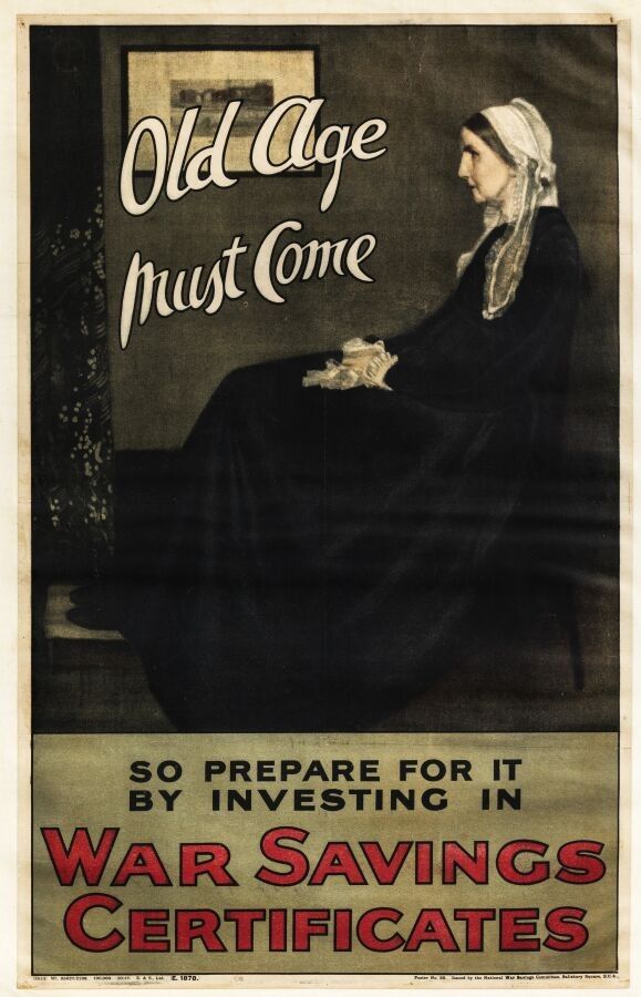 James Whistler (1834-1903) d'après - Old age must come. 1917. Imprimeur Eyre and Spottiswoode Ltd. 100x63cm. Affiche originale, offset et lithographie, entoilée. Condition A-, légères traces de plis d'origine, un manque dans la marge supérieure. Il s'agit d'une affiche anglaise. Sur le modèle des emprunts de guerre en France, au Royaume Uni cela prit le forme d'une épargne. L'affichiste évoque ici a vieillesse à travers un tableau iconique de son compatriote d'Angleterre, en signifiant que le futur commence aujourd'hui avec ce financement de la guerre.