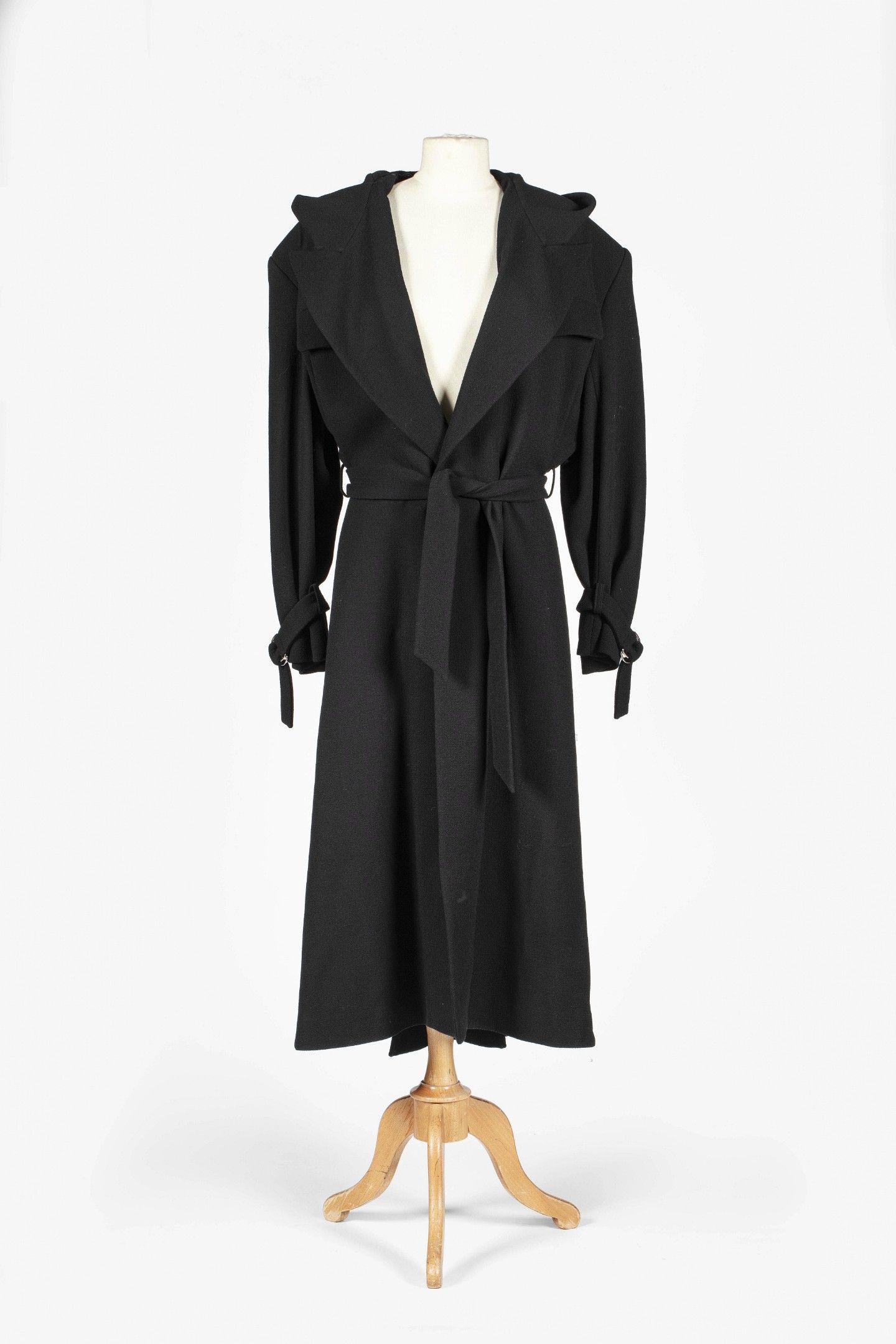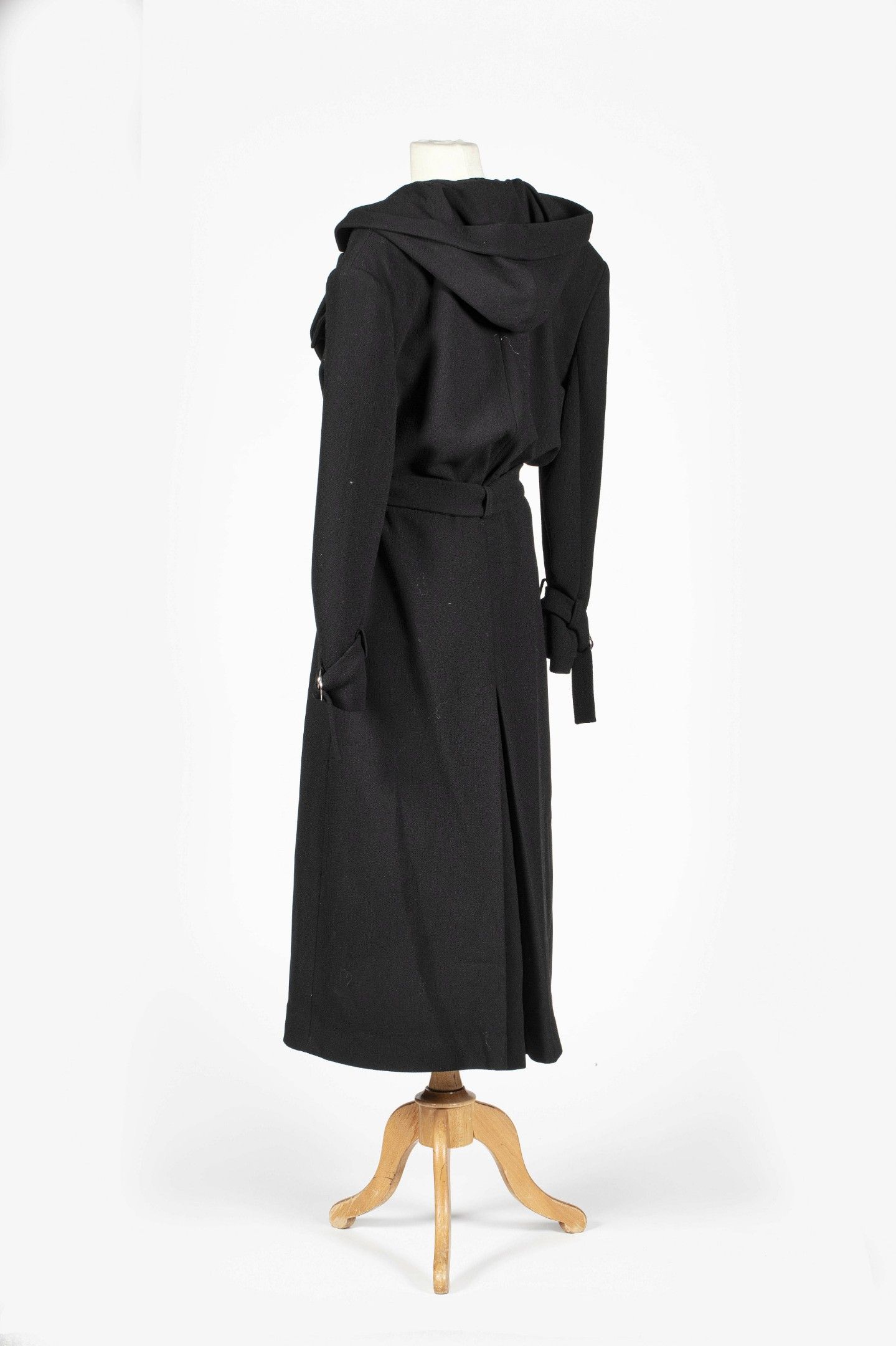 Alexandre VAUTHIER - PRET-A-PORTER : Manteau en drap de laine noir s, manches longues avec attaches au poignet, col cranté terminé par une capuche, fermeture sur le devant par une ceinture amovible, deux poches poitrine. Taille S / M - Bon état général.