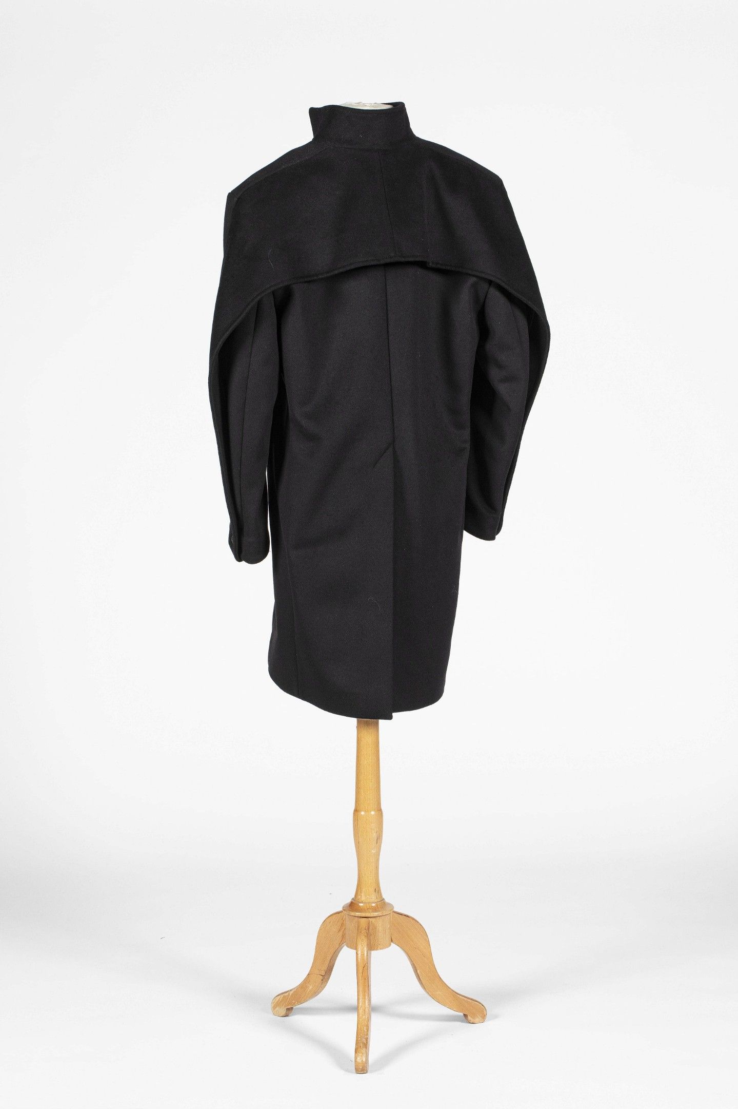 PRET A PORTER : Manteau en drap de laine noir façon officier, manches longues, col montant, fermeture croisée sur le devant par dix boutons, deux poches plaquées à rabat. Taille M - Bon état.