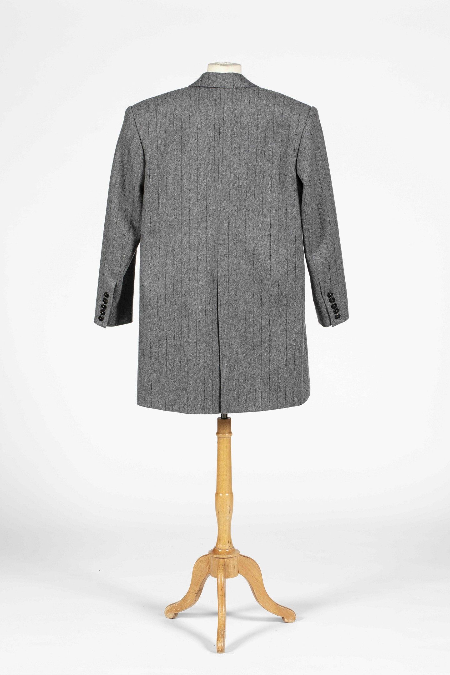 PRET A PORTER : Veste longue en drap de laine gris à rayures tennis blanches, manches longues, col cranté, fermeture simple sur le devant par un bouton, deux poches plaquées à rabat. Taille S / M - Bon état.