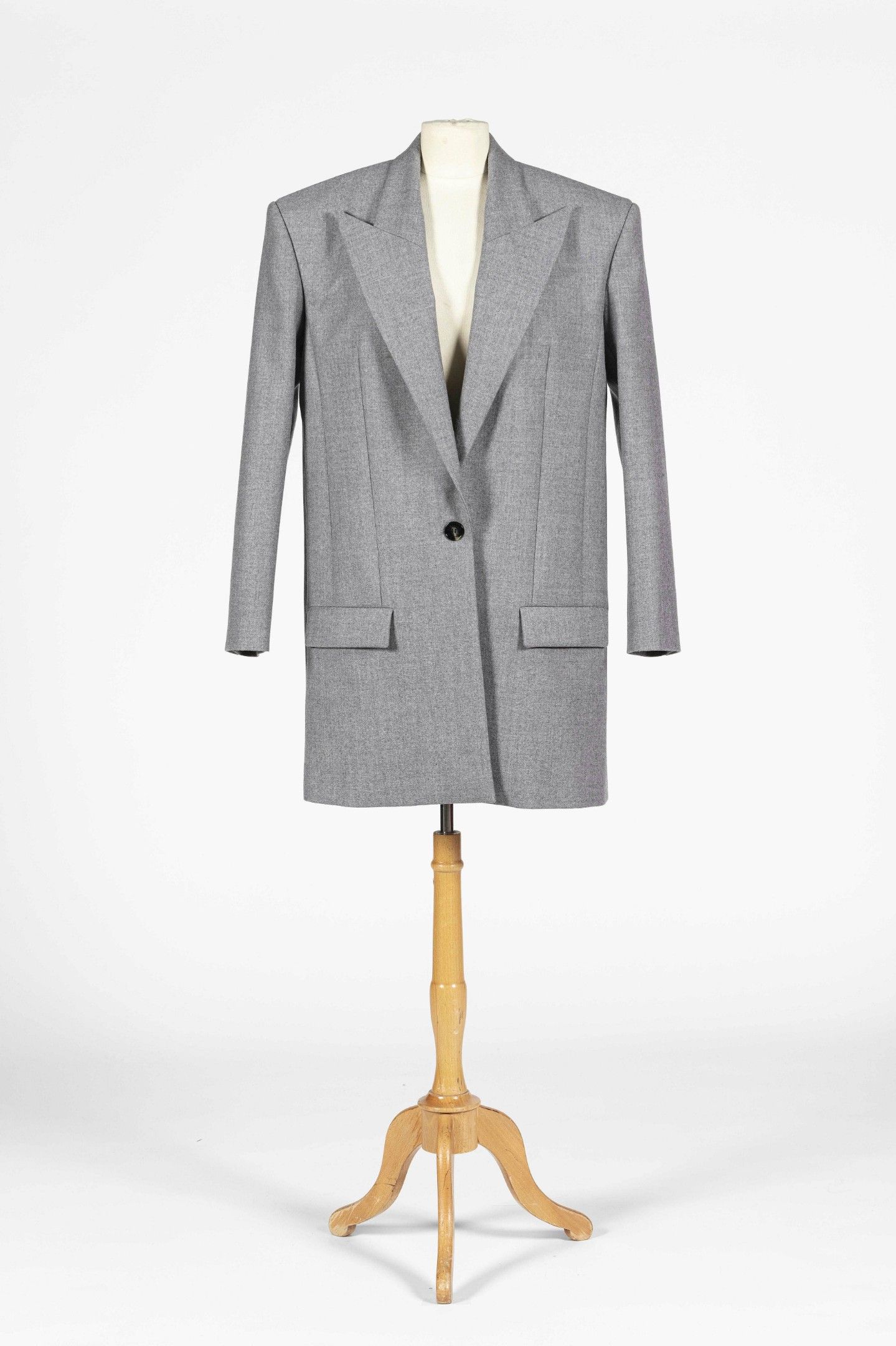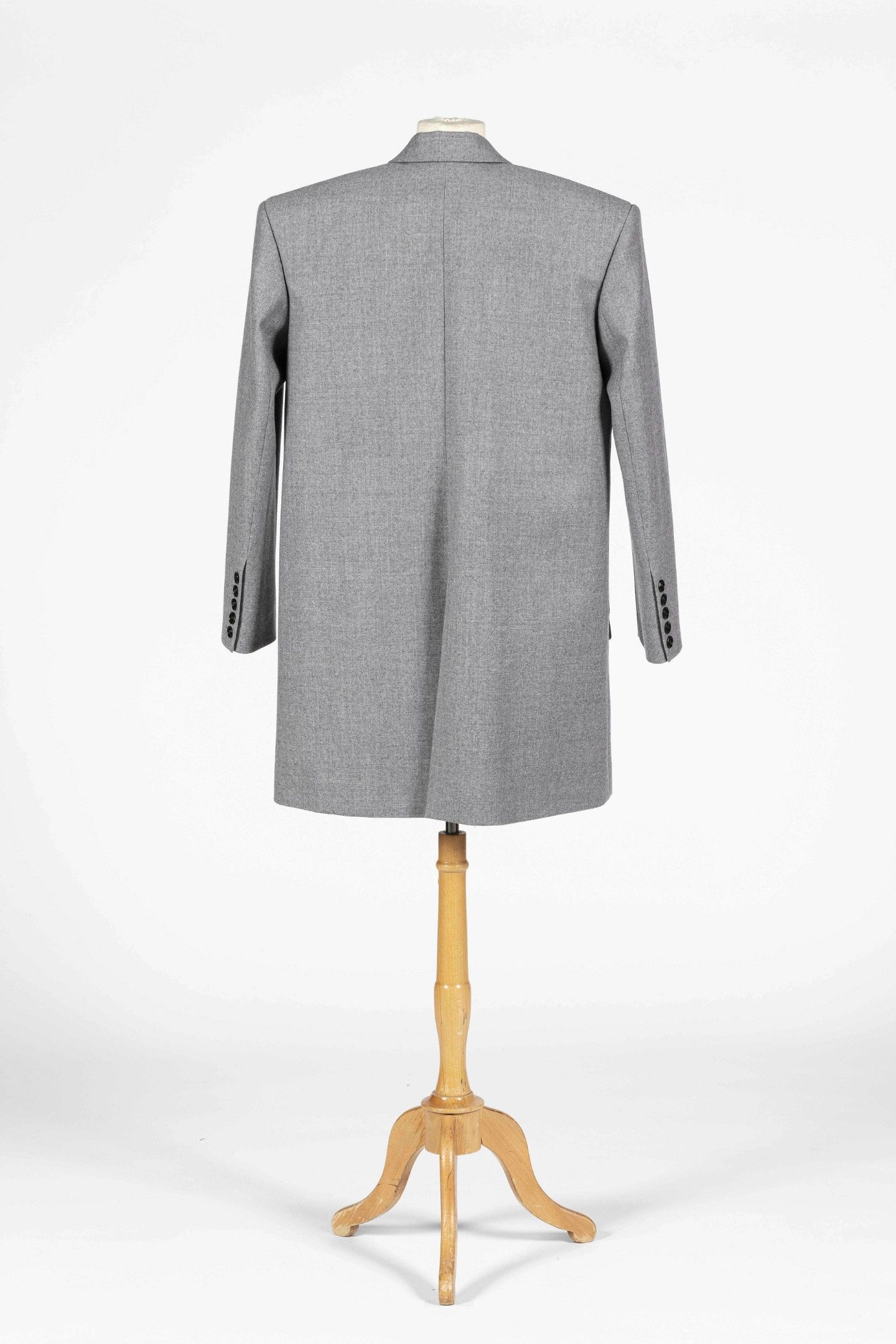 PRET A PORTER : Veste longue en drap de laine gris clair dans un style over size, manches longues col cranté, fermeture sur le devant par un bouton, deux poches plaquées à rabat. Taille unique. Taille M - Bon état.