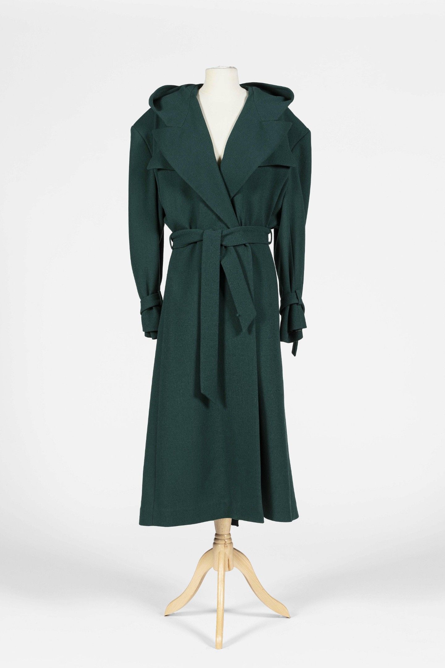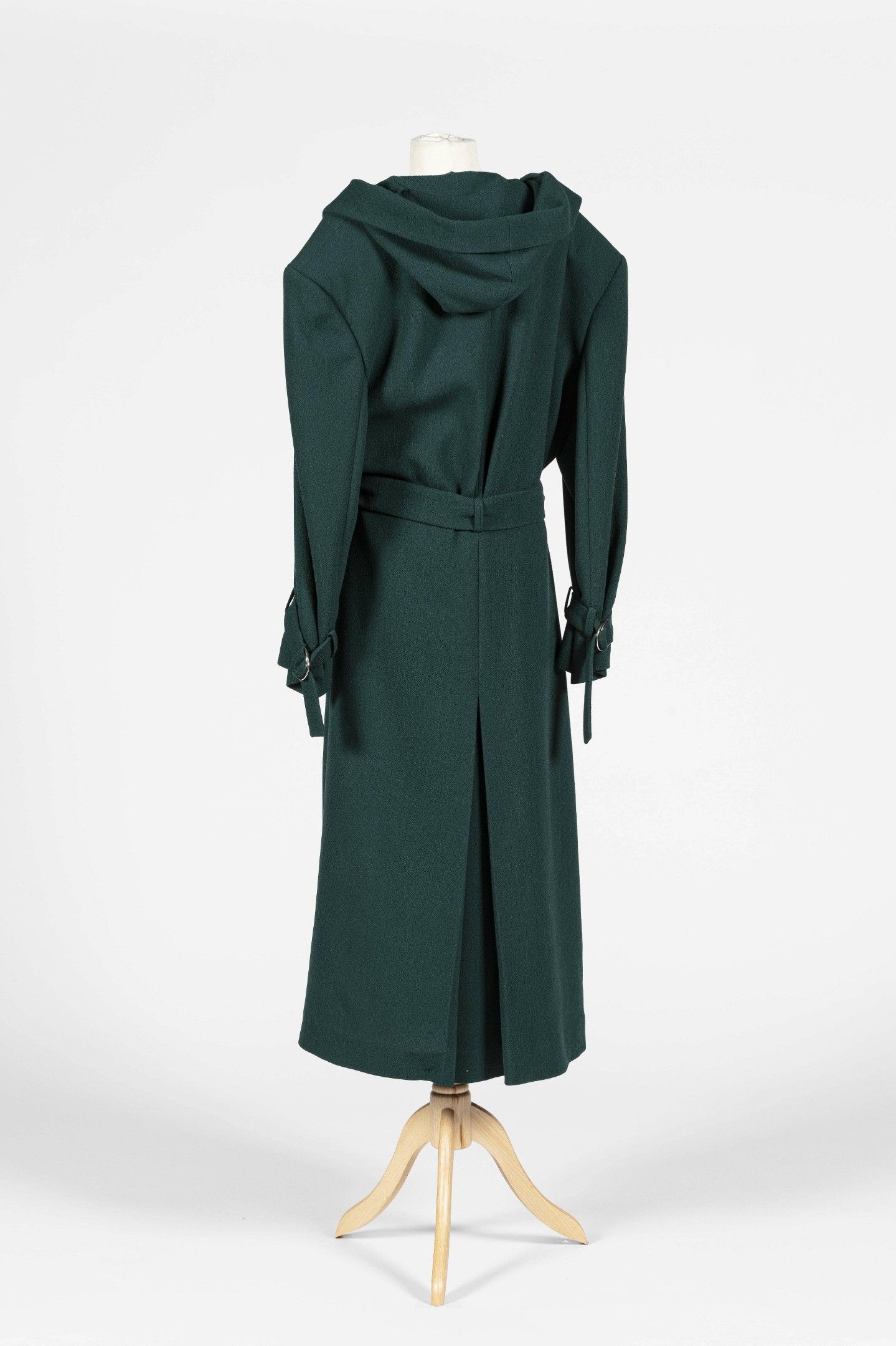 PRET A PORTER : Long manteau à capuche en drap de laine vert sapin, manches longues, col cranté, fermeture par une ceinture amovible dans le même tissu, poignets avec passants, poches plaquées poitrine. Taille unique - Bon état.