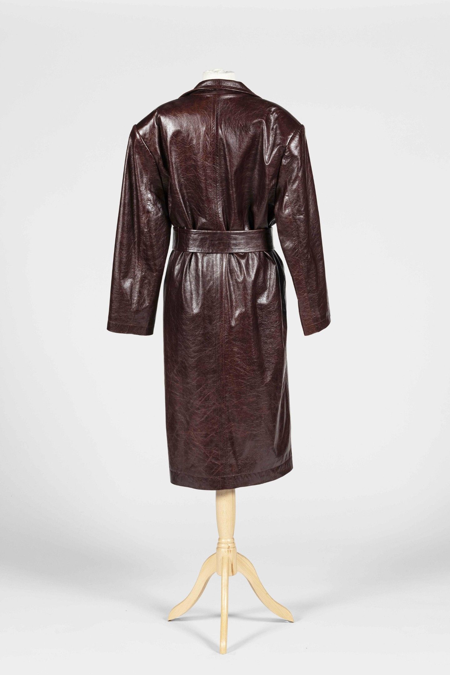 Manteau en éco cuir glacé de couleur Dark tabaco, manches longues, col cranté, fermeture par une ceinture amovible assortie, deux poches latérales. Taille unique - Bon état.