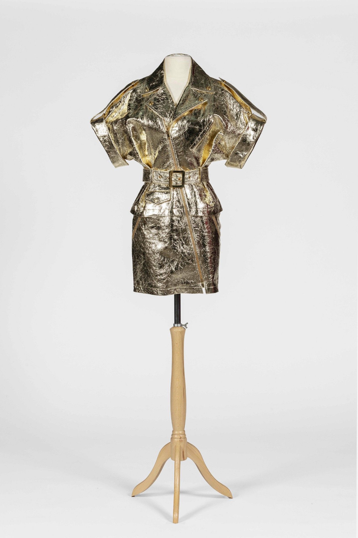 Robe façon Perfecto en cuir glacé craquelé doré, manches courtes, fermeture asymétrique sur le devant par un zip, poche zippée poitrine, ceinture amovible assortie, deux poches zippées dans le bas de la robe. Taille XS / S Bon état.