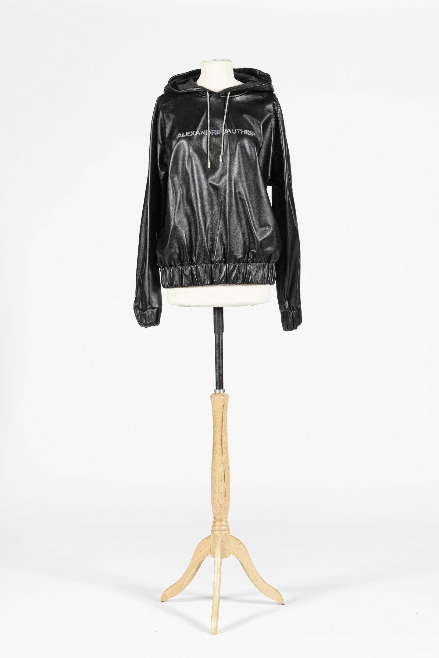 Un sweat, manches longues, col avec capuche, lettrages en petits cristaux de strass de Swarovski « Alexandre Vauthier », resserré dans le bas du sweat et au poignet. Taille S / M Bon état.