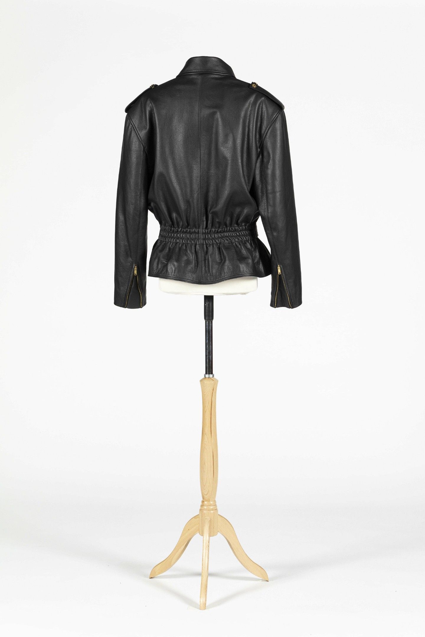 PRET-A-PORTER Veste Perfecto en cuir noir, manches longues, col cranté, fermeture sur le devant par un zip doré, une poche à rabat, deux poches zippées, taille resserrée par une fronce et une ceinture assortie. Taille S - Bon état.