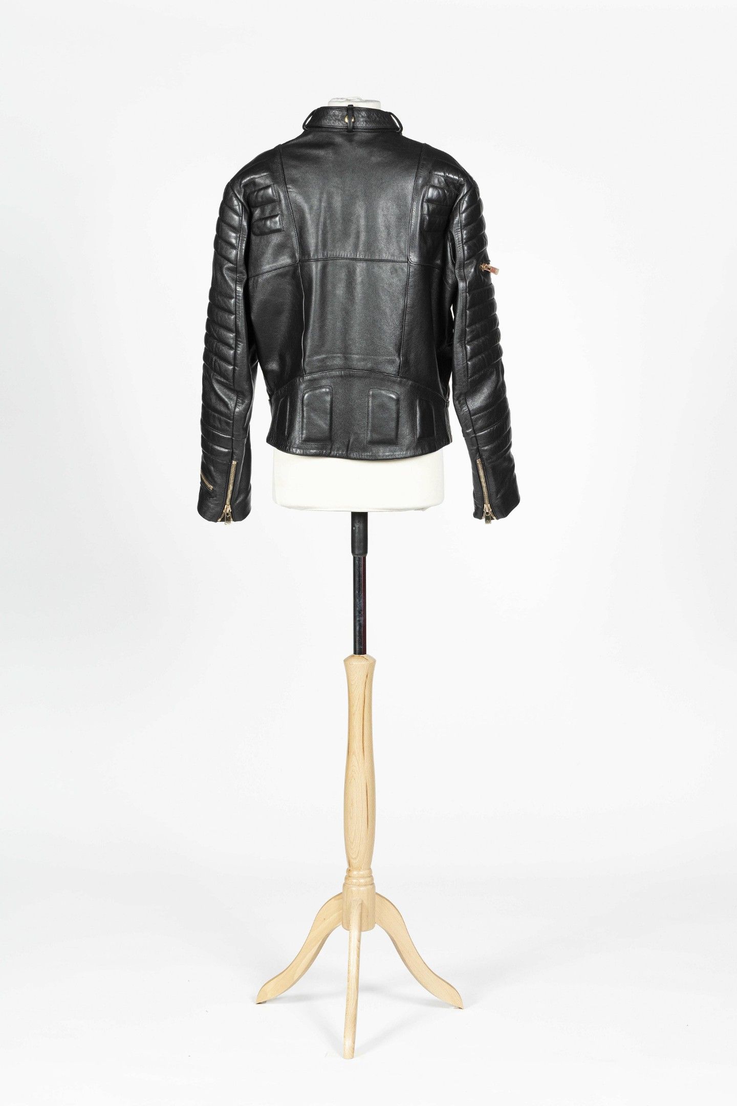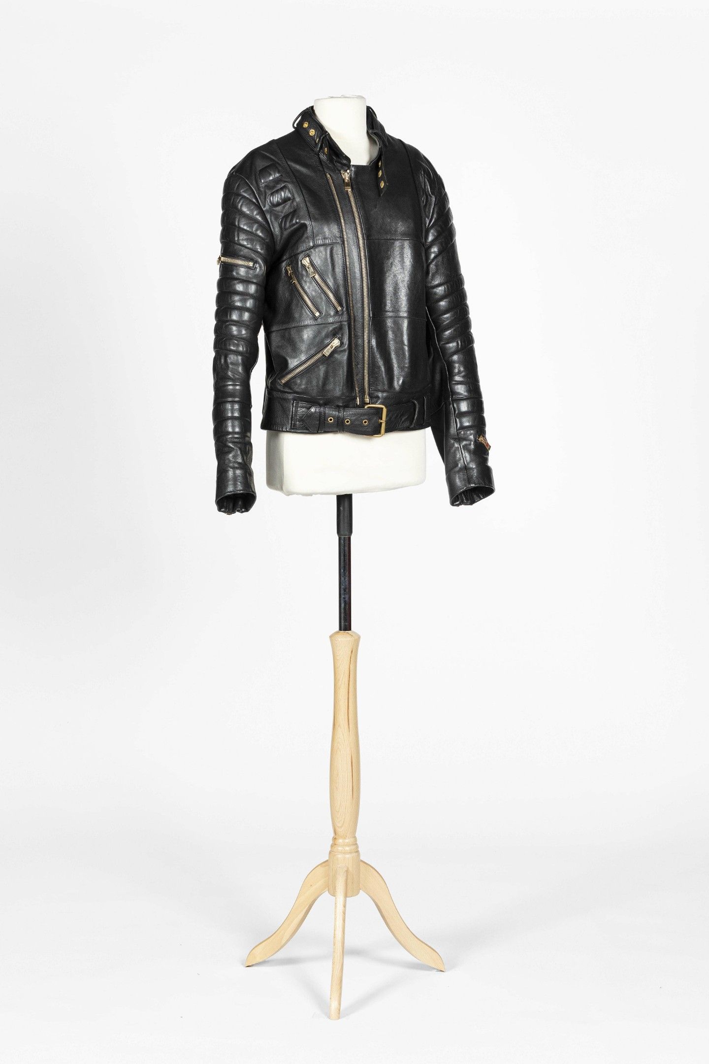 PRET-A-PORTER Blouson de biker en cuir noir, manches longues, col haut, fermeture par un double zip en métal doré et une ceinture assortie, trois poches zippées. Taille S - Bon état.