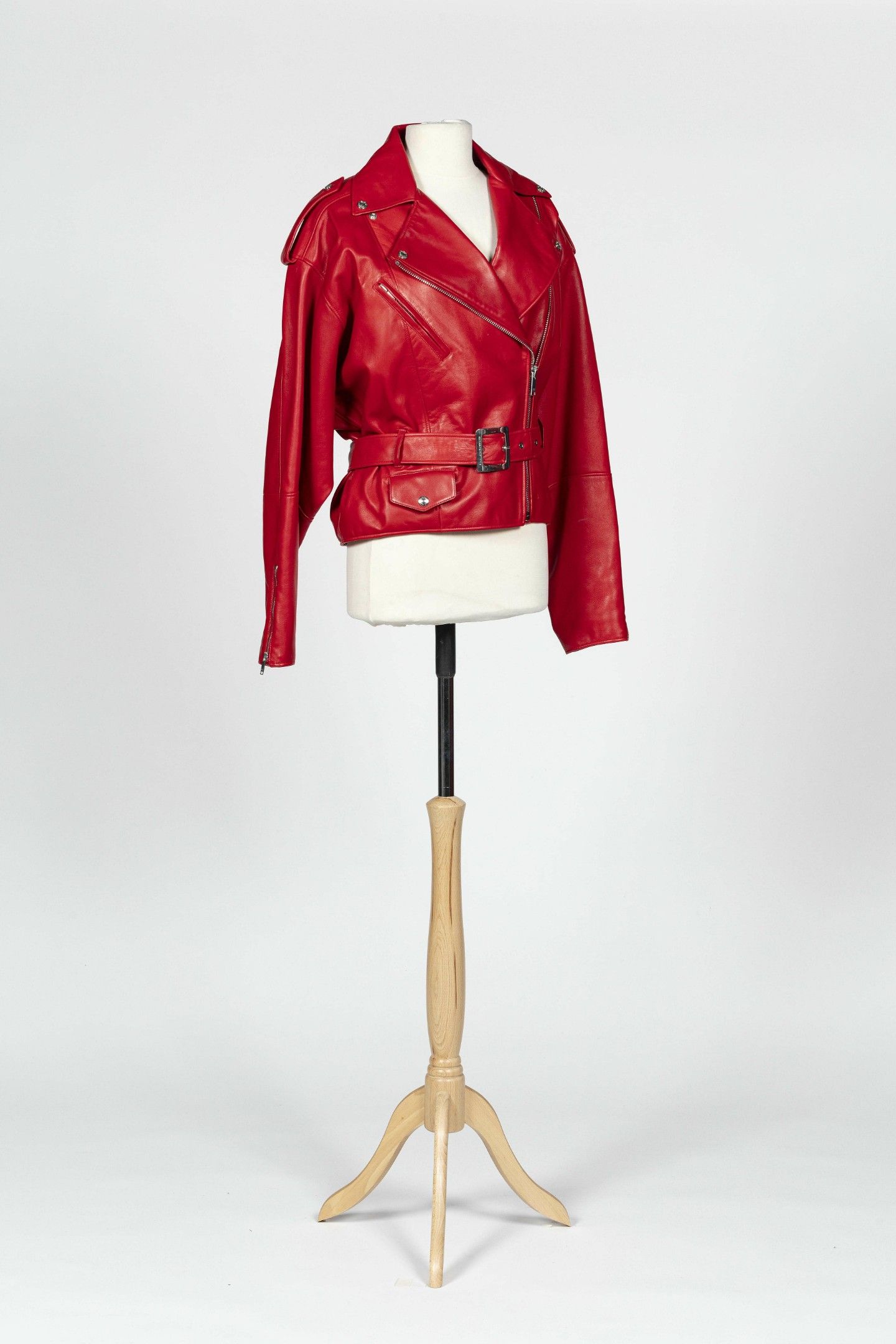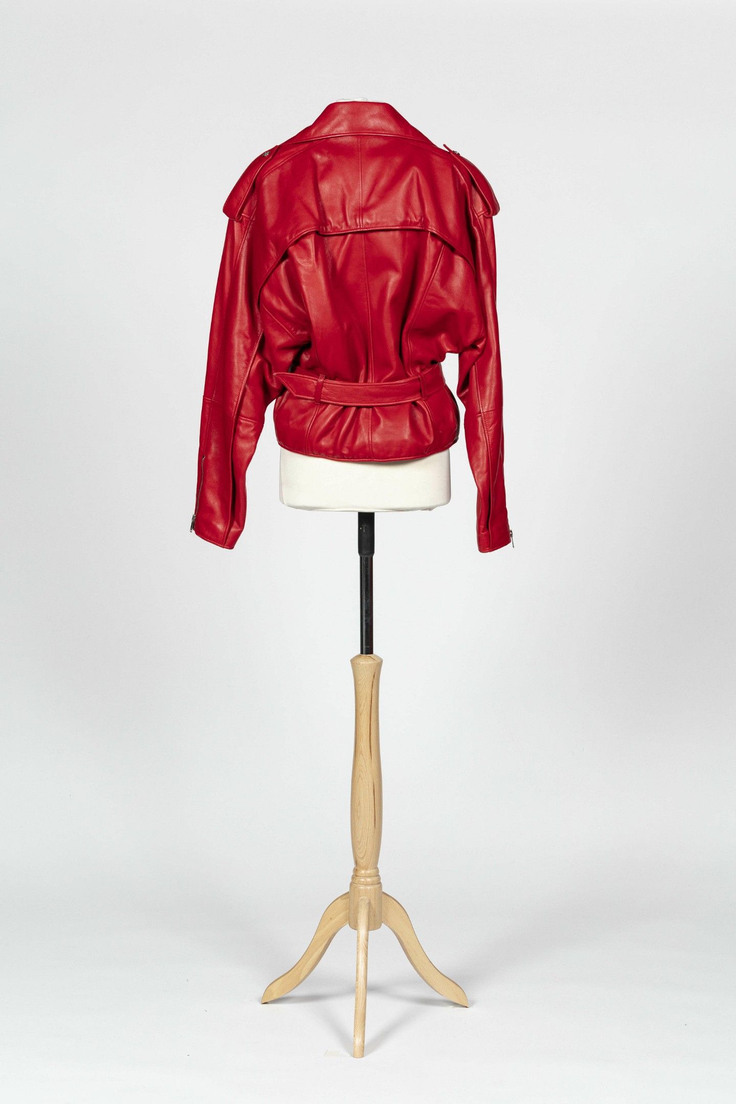 PRET-A-PORTER Perfecto en cuir rouge, manches longues, col cranté, fermeture asymétrique par un zip en métal argenté, une poche zippée poitrine, resserré à la taille par une ceinture amovible boucle argentée, petite poche à rabat dans le bas de la veste. Taille S - Bon état.