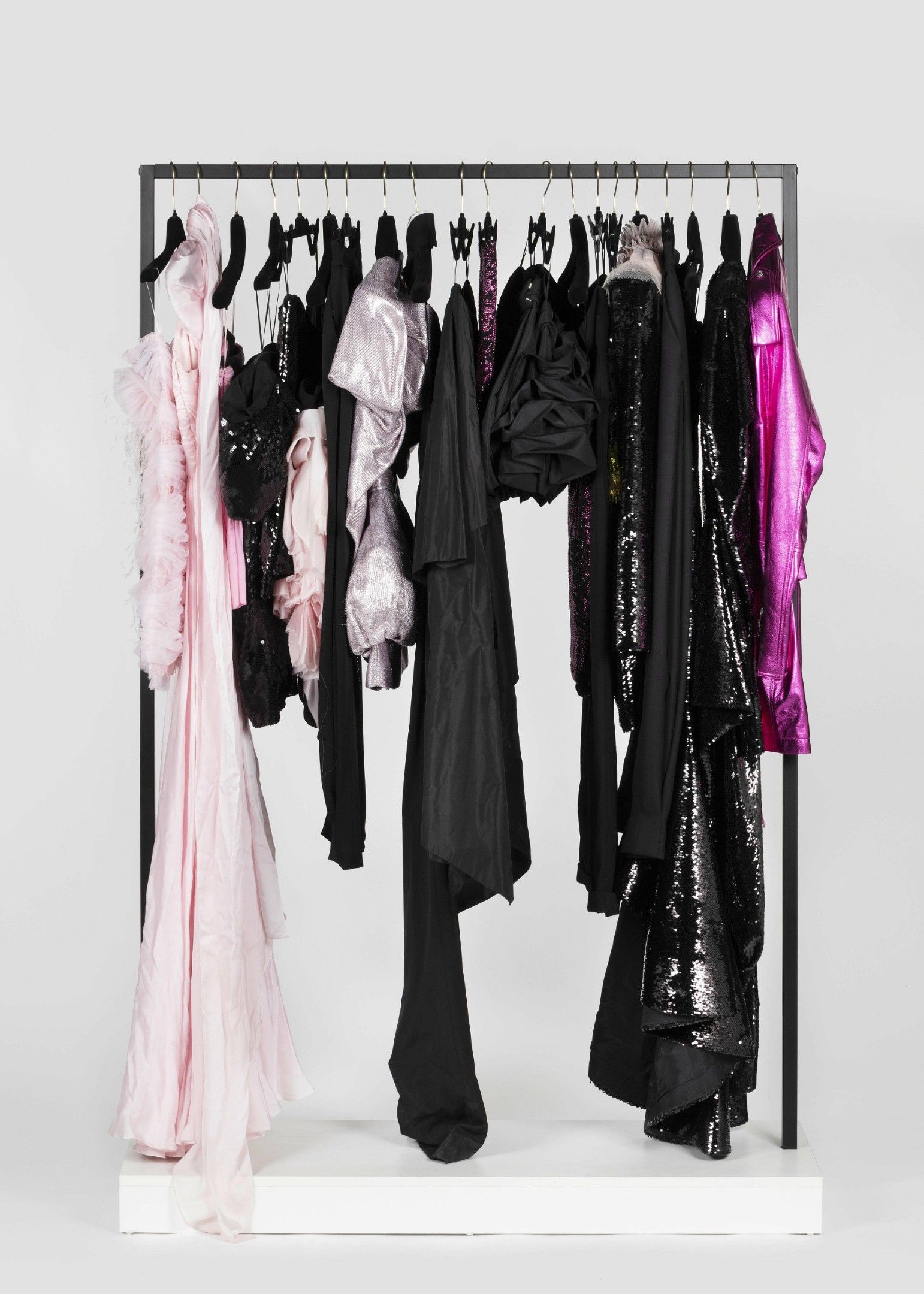 Portant de 20 Pièces comprenant Des robes surtout de soirée, vestes, pantalons et tops dans les tons de noir et rose, composées de matières précieuses (soie, crêpe, velours, satin, lurex, cuir, sequins, strass de Swarovski etc ) Taille S et XS pour les 20 pièces Bon état. Voir photos.