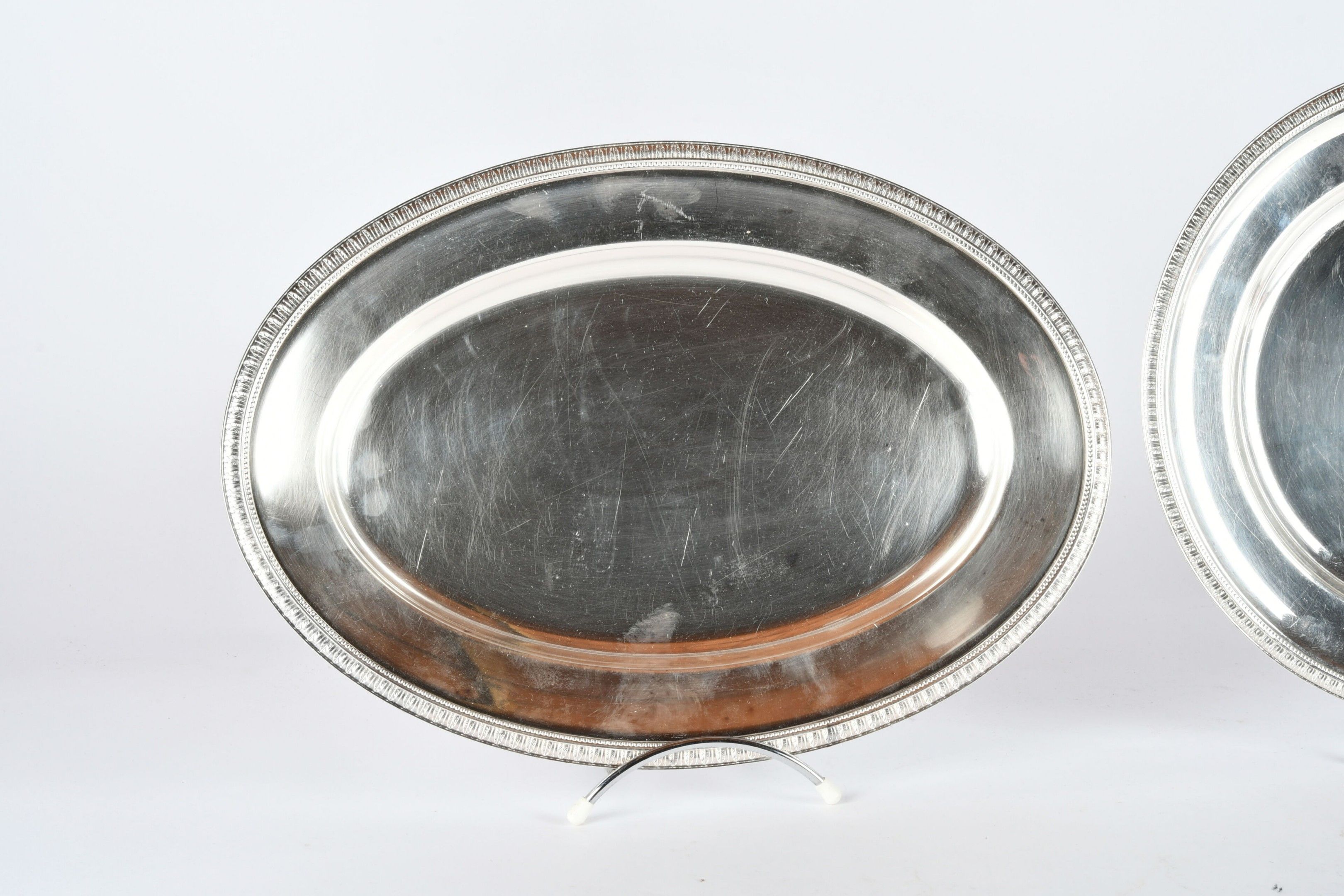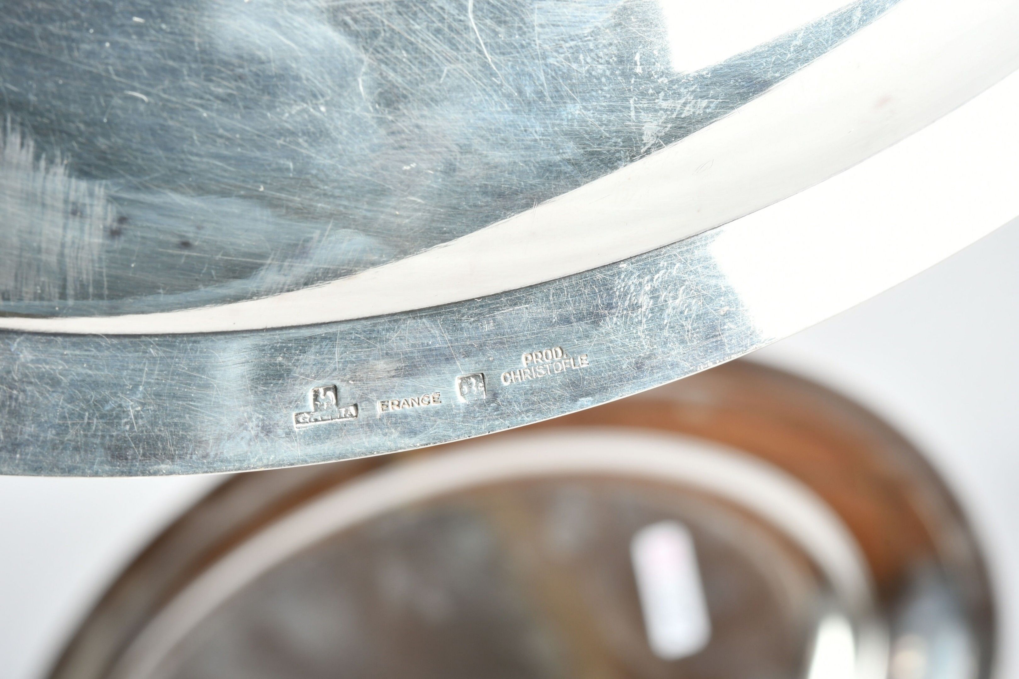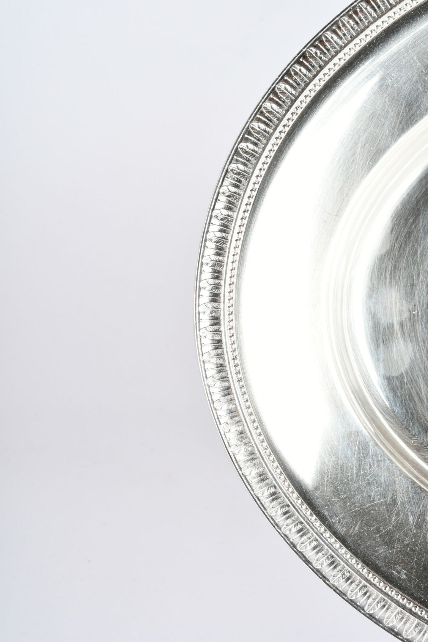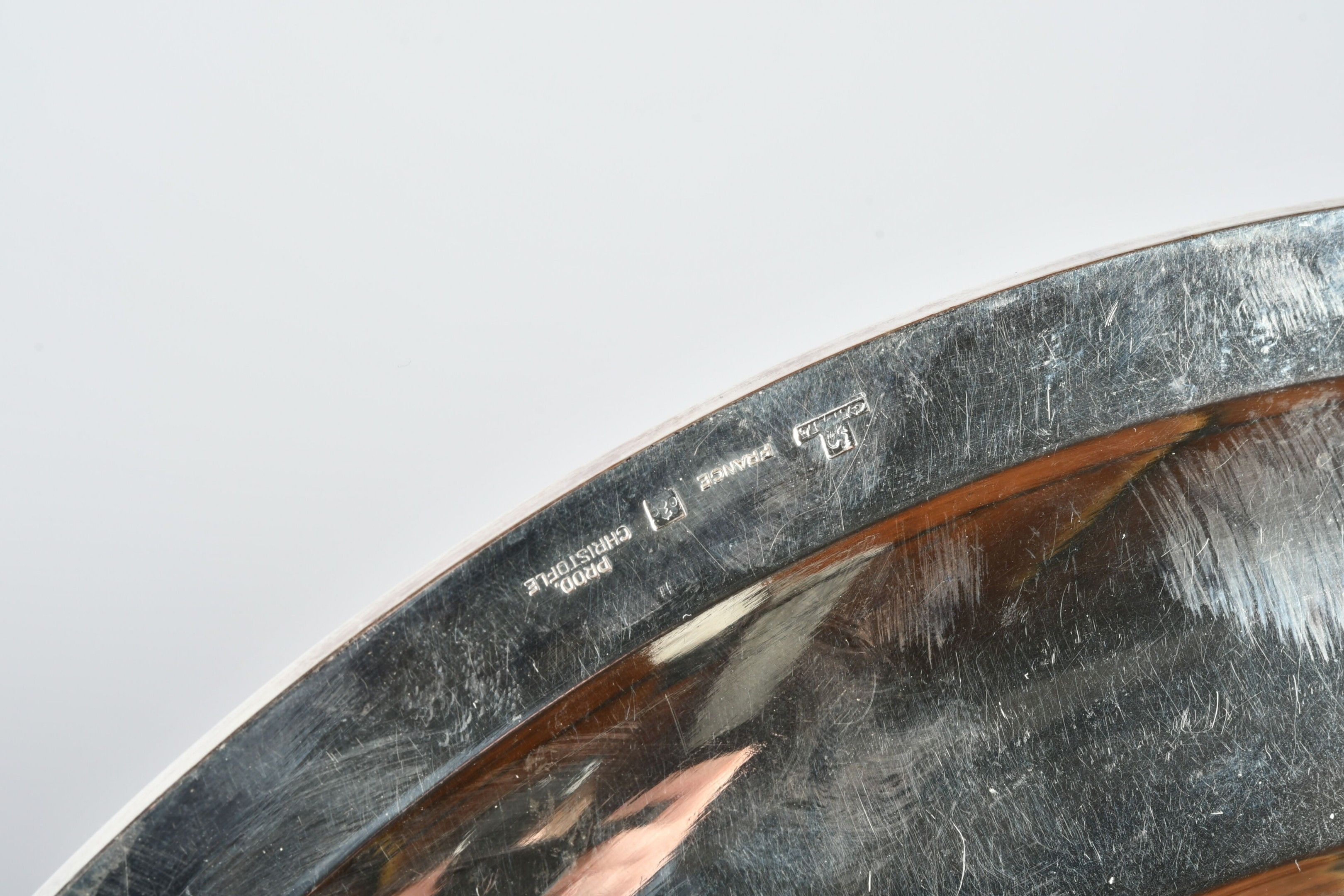 GALLIA (Production Christofle). Suite de deux plats en métal argenté à décor de feuilles d'eau, l'un ovale l'autre circulaire. L. 40 cm et Diam. 30,5 cm