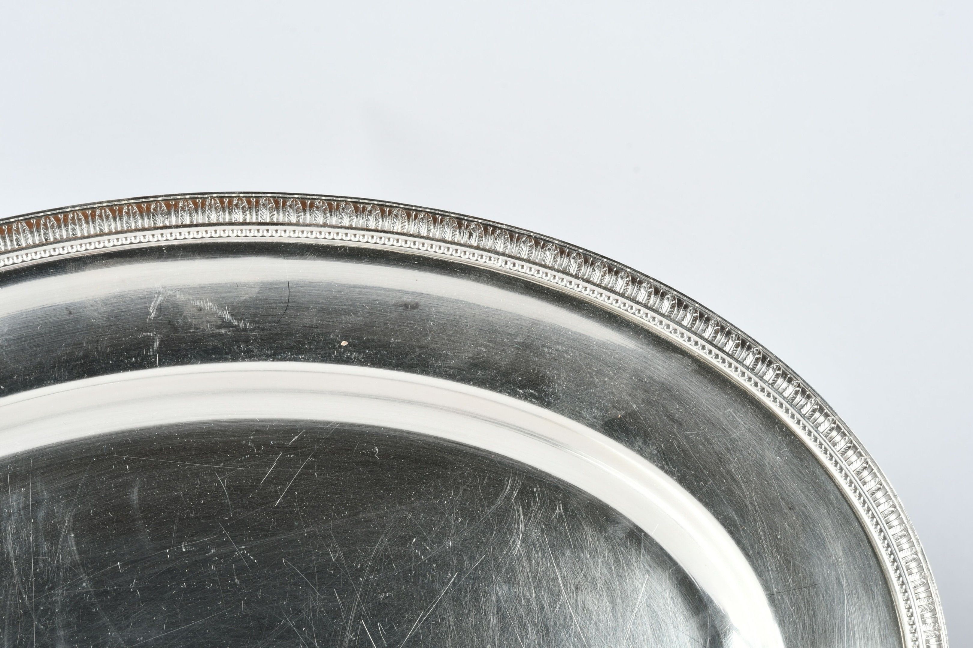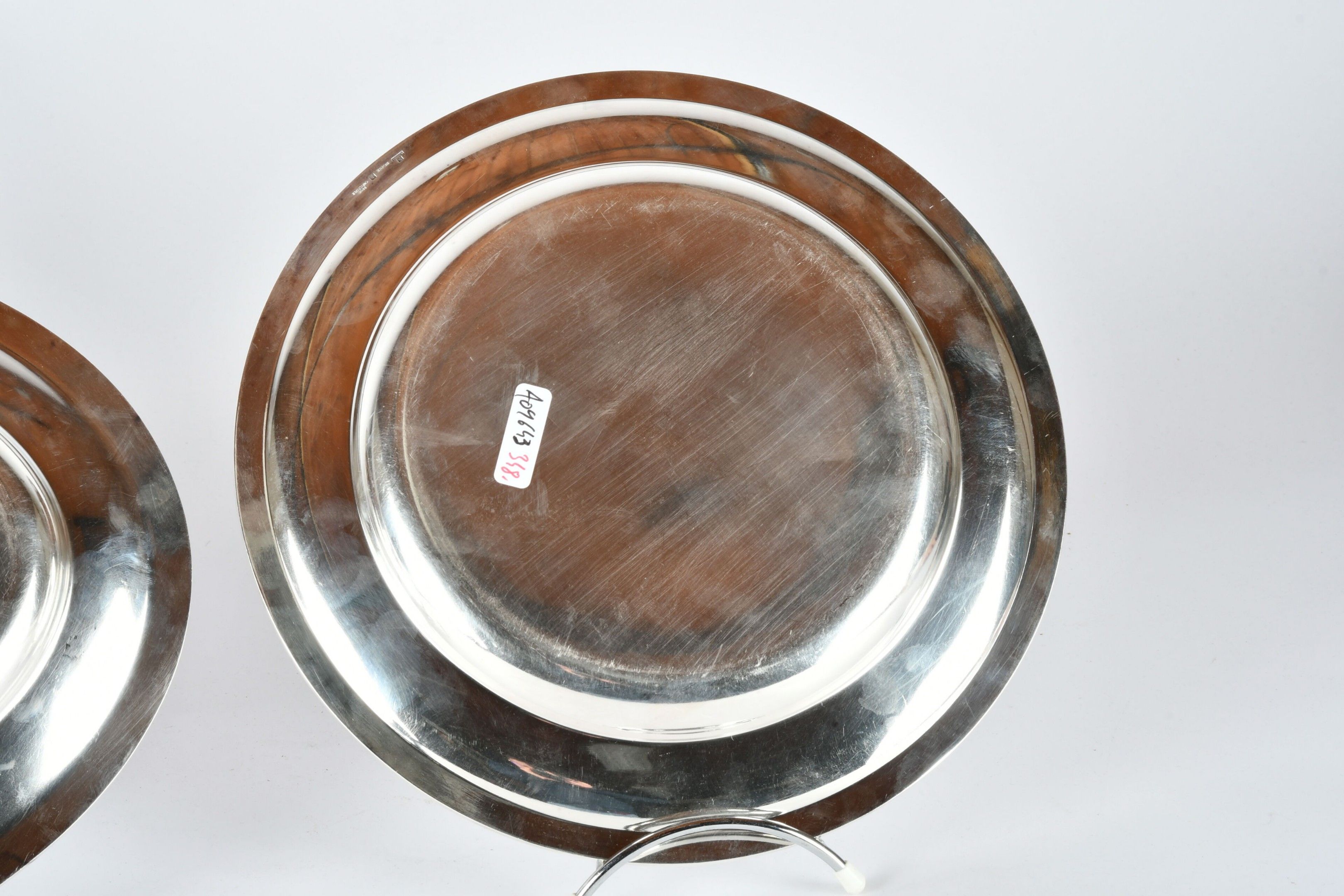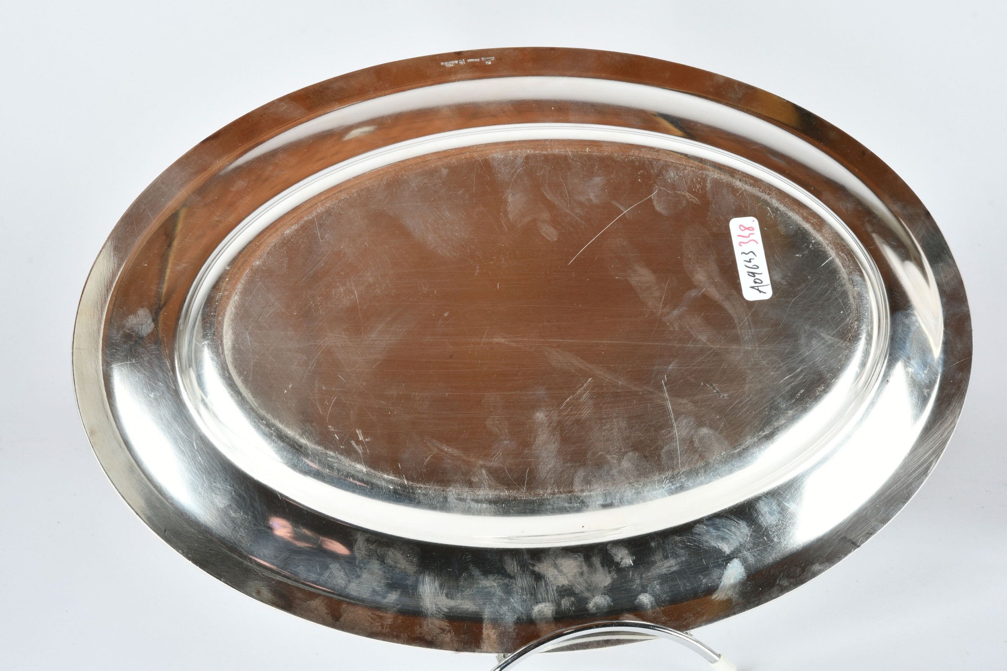GALLIA (Production Christofle). Suite de deux plats en métal argenté à décor de feuilles d'eau, l'un ovale l'autre circulaire. L. 40 cm et Diam. 30,5 cm