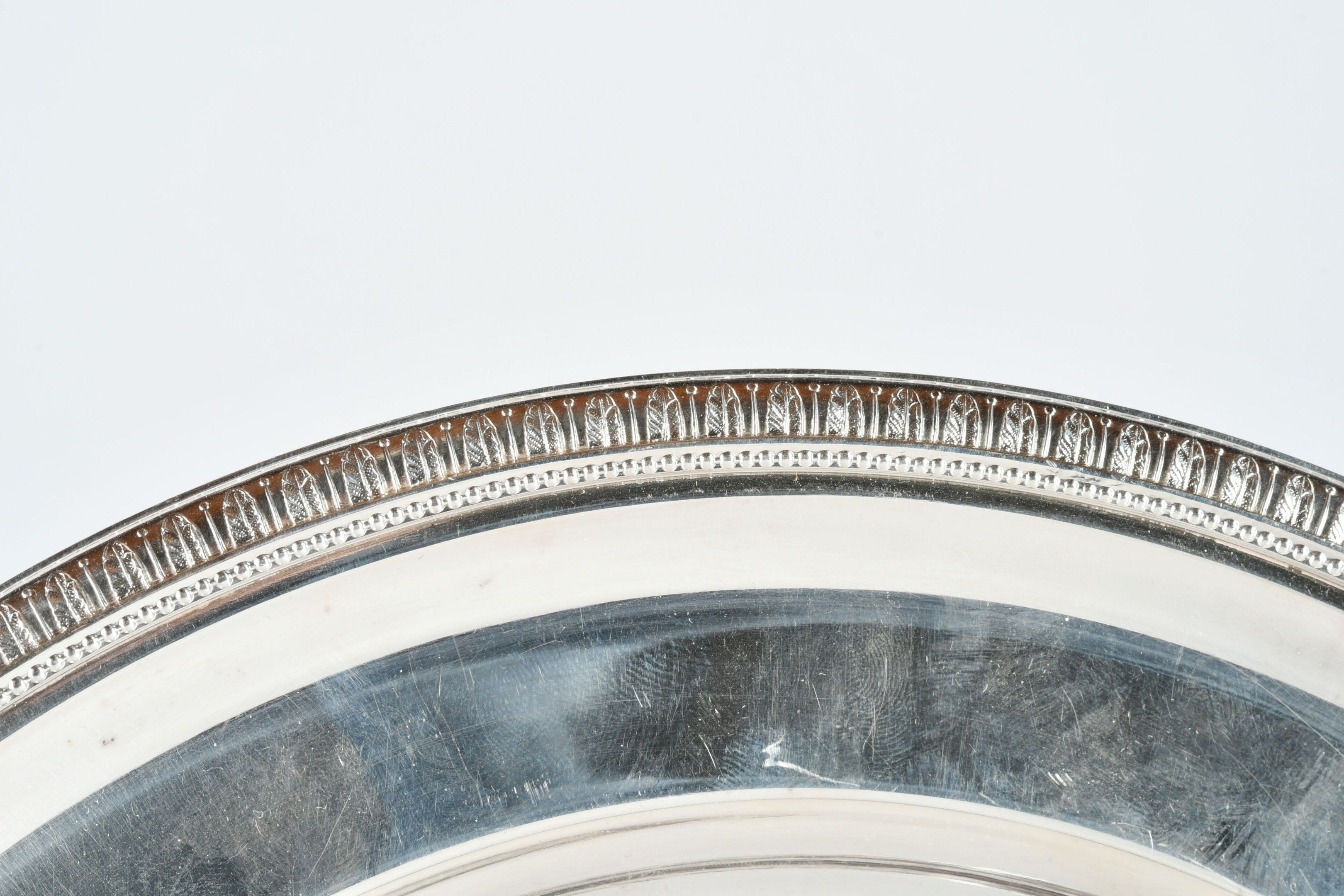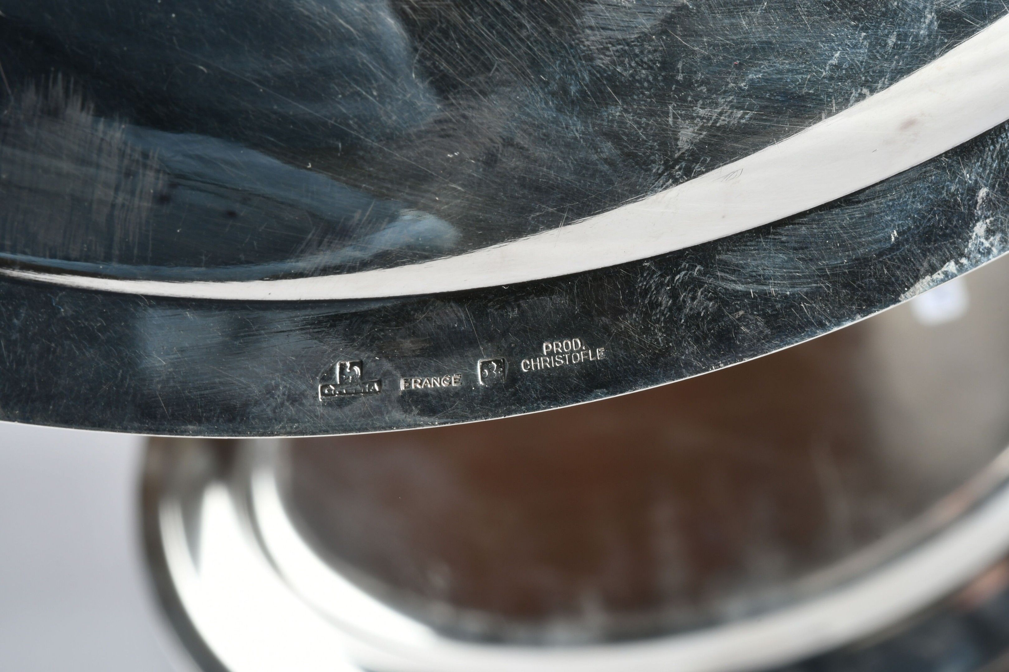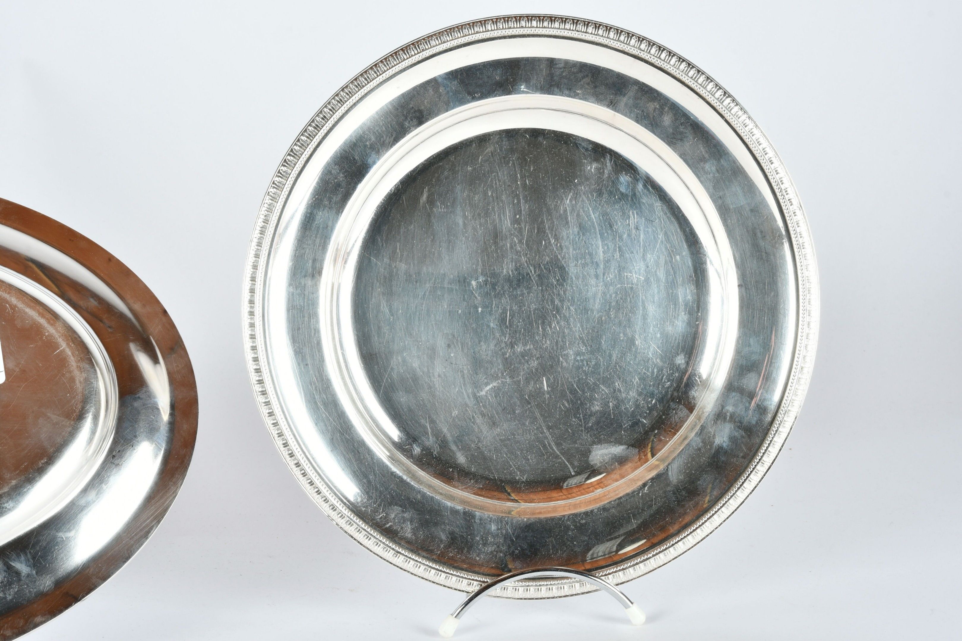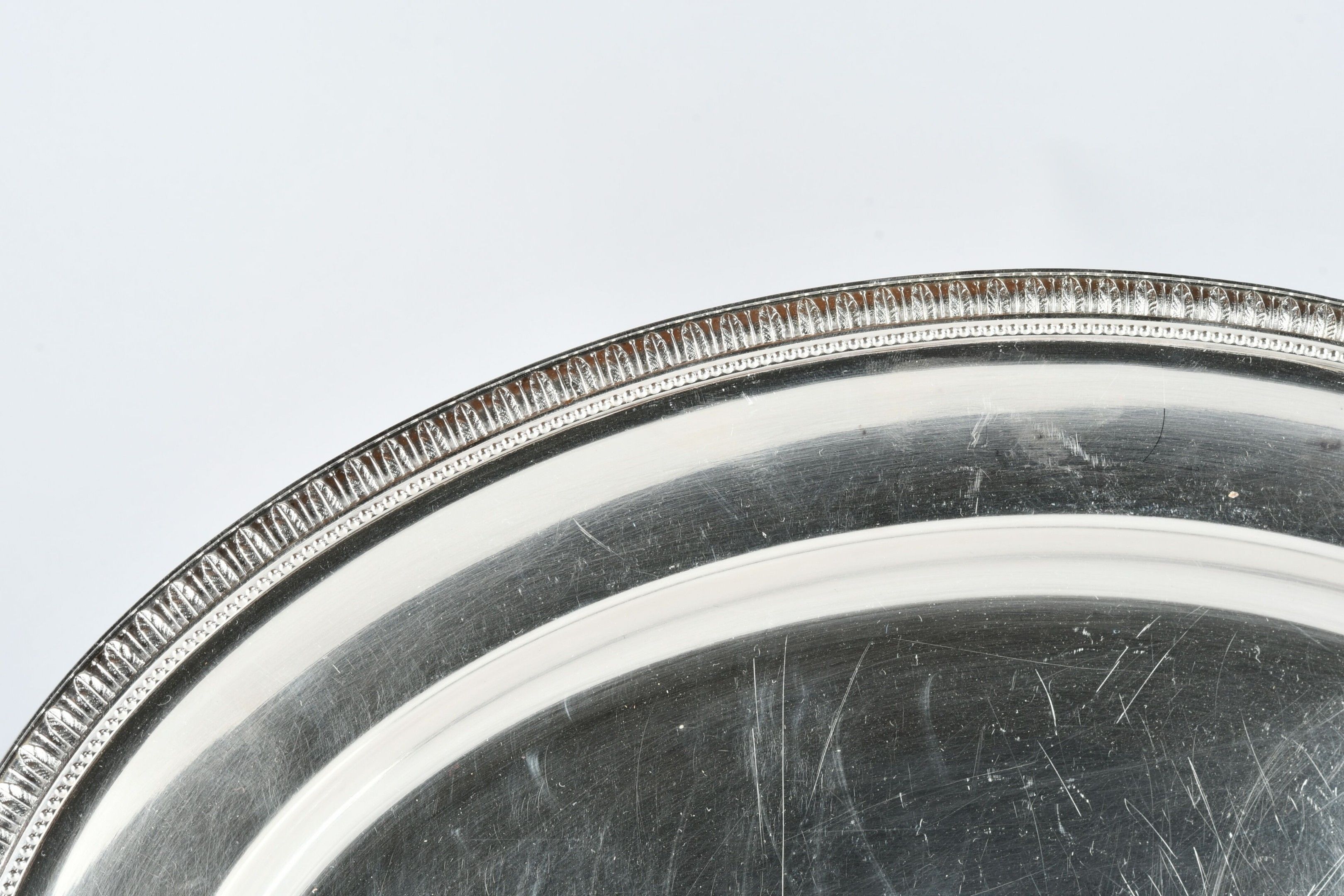 GALLIA (Production Christofle). Suite de deux plats en métal argenté à décor de feuilles d'eau, l'un ovale l'autre circulaire. L. 40 cm et Diam. 30,5 cm
