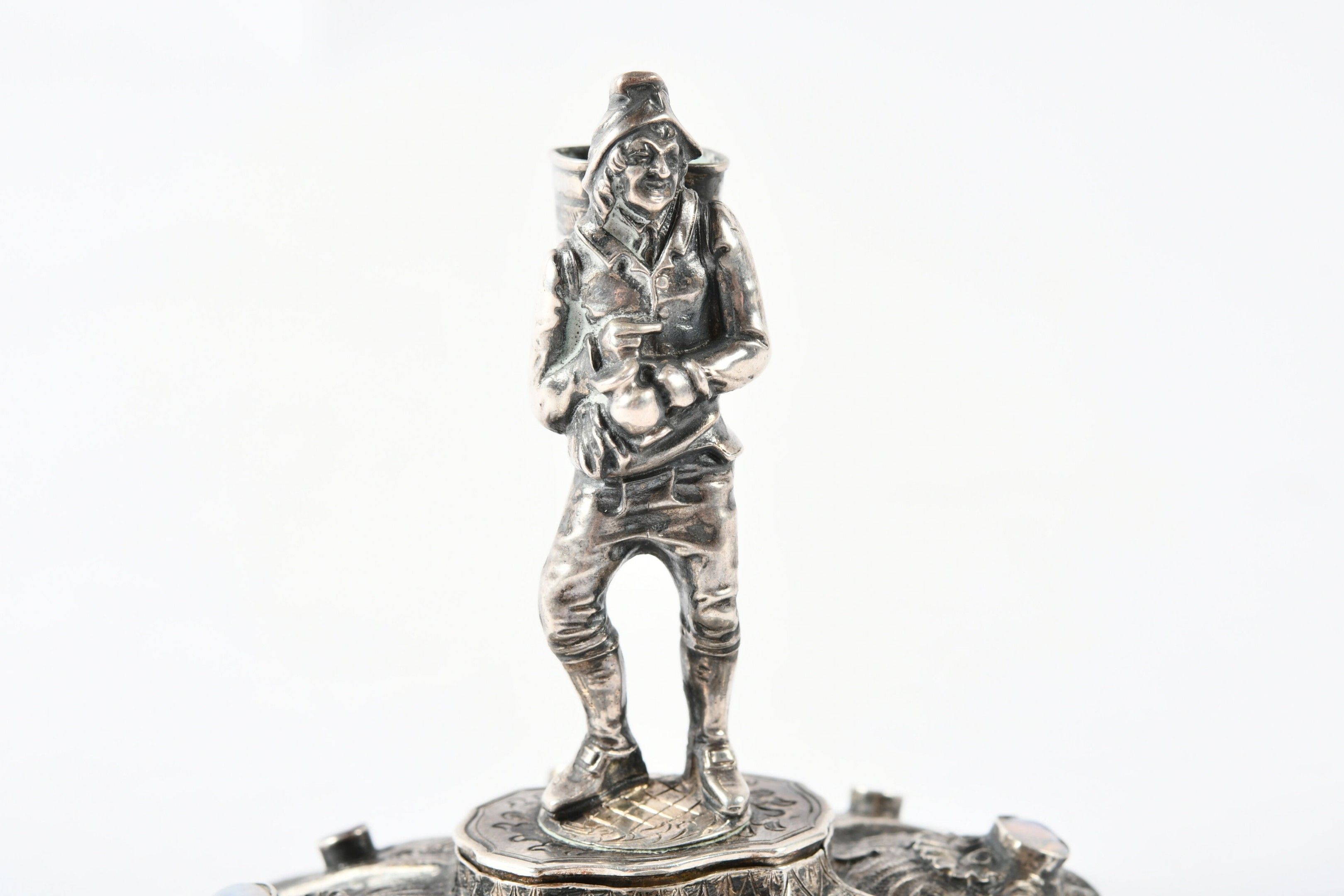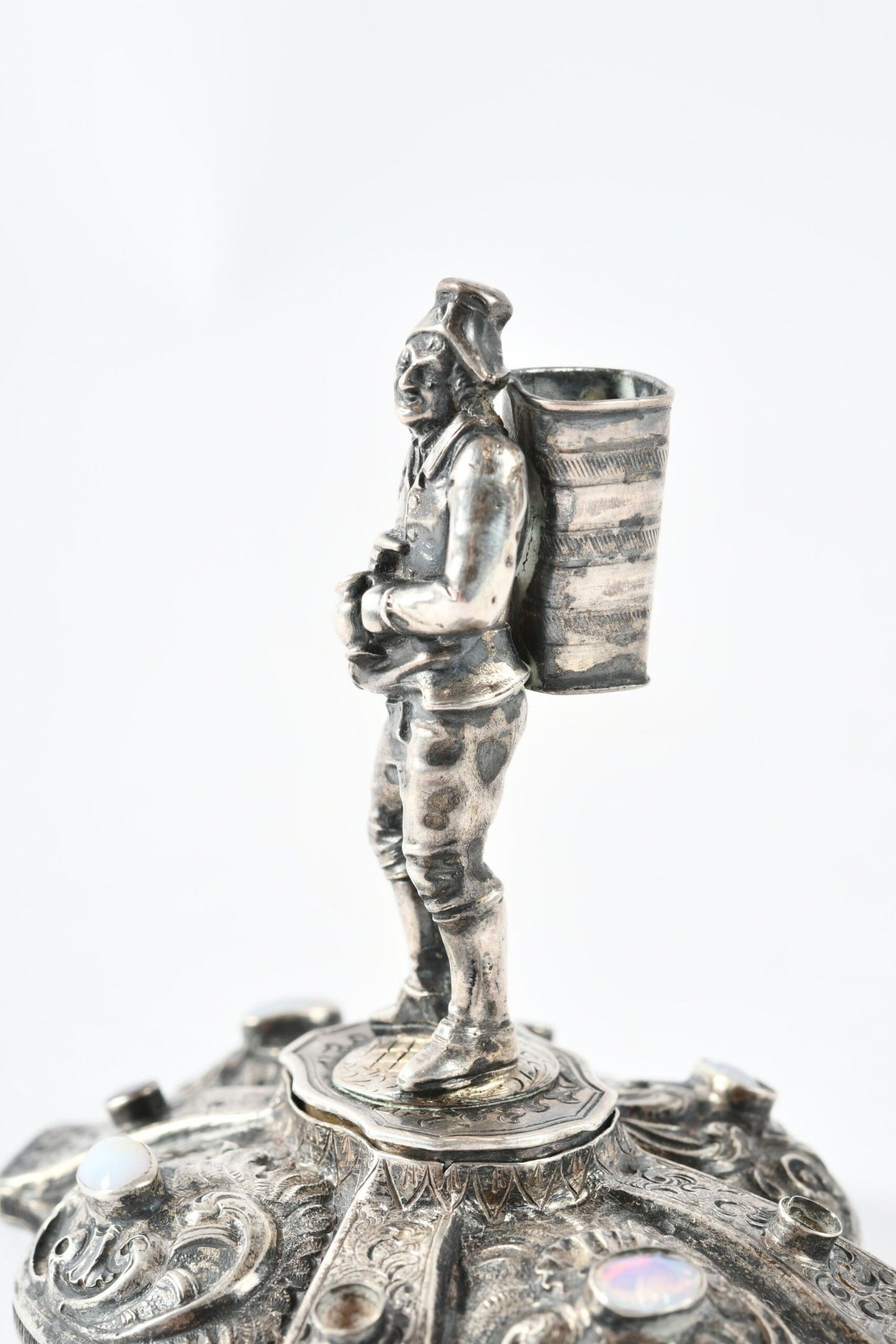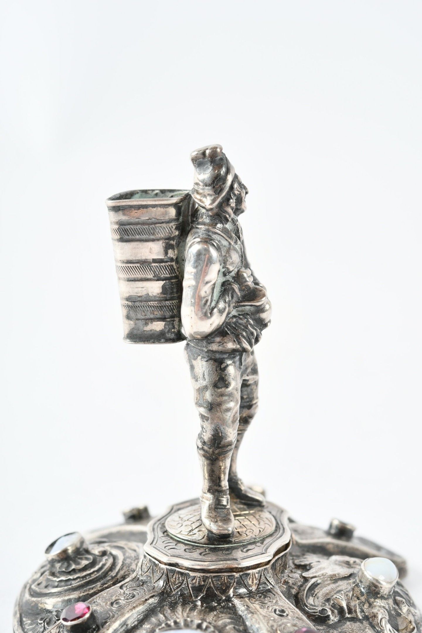 CACHET et son SUPPORT (?) en argent à décor d'une statuette à sujet d'un colporteur couvrant une base à riche décor gravé et sertie de pierreries formant réceptacle. Travail étranger vers 1800. H. 8 - L. 8,2 cm - Poids brut : 149 g. (Reste de cire ou de résine séchée à l'intérieur du cachet et de la base, manque deux pierres, absence de sceau sous le personnage)