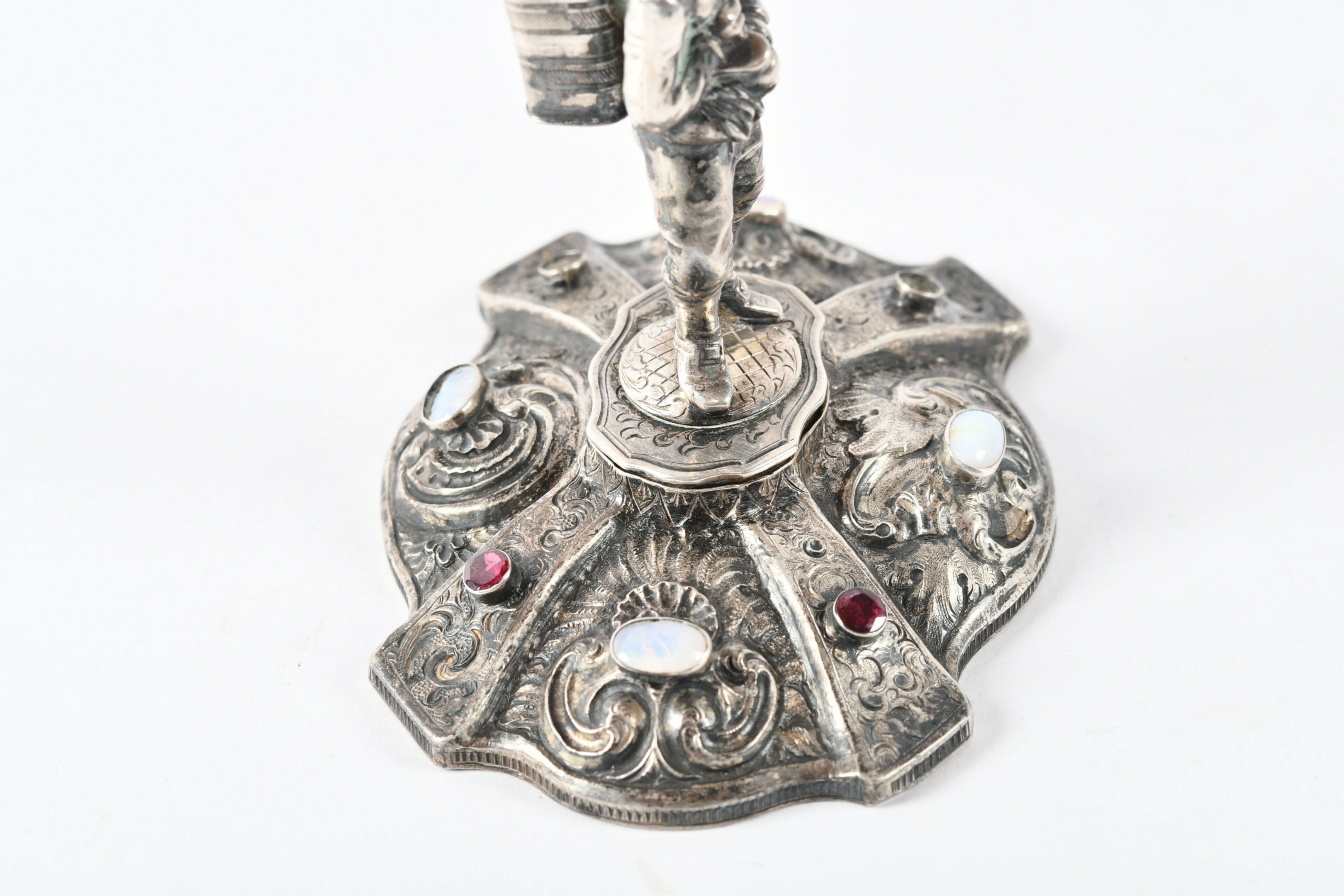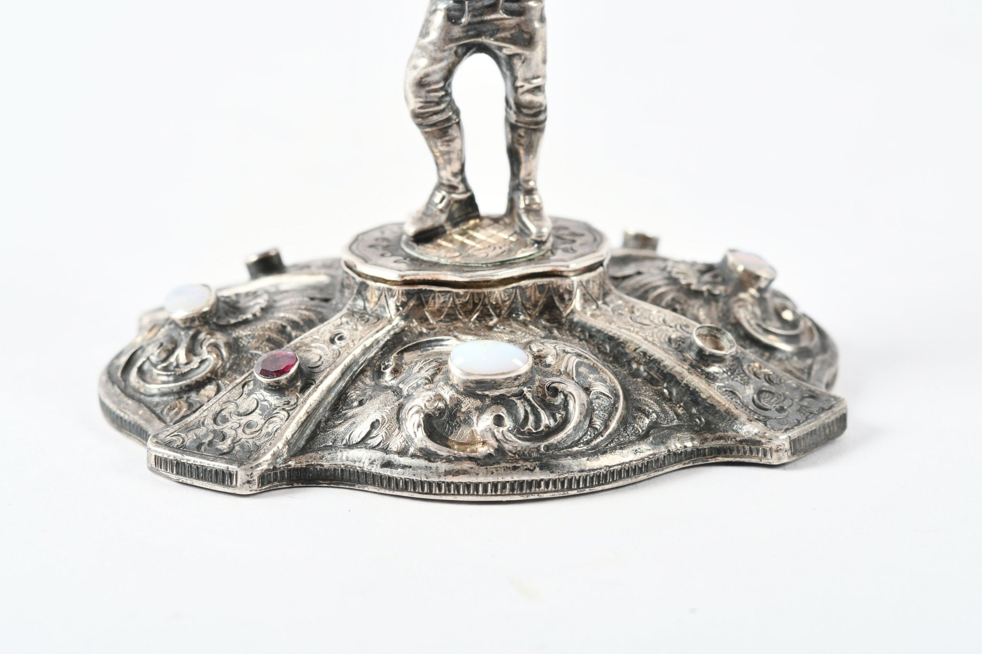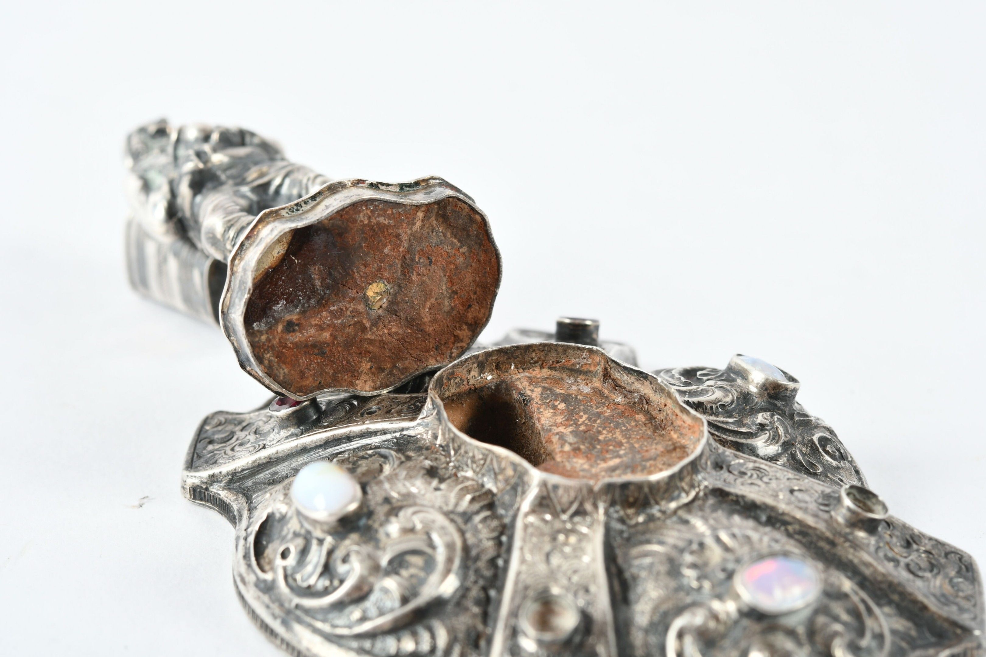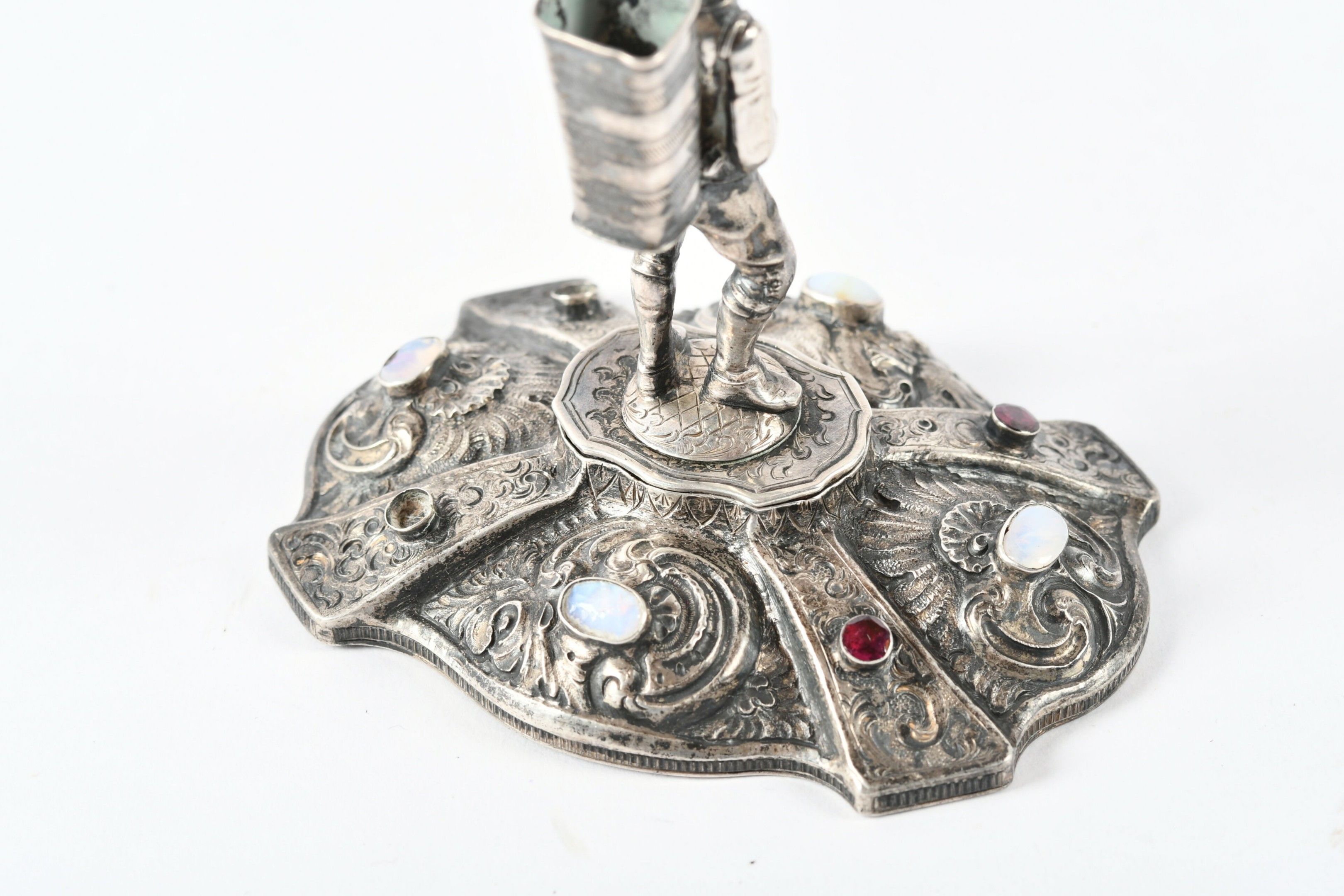 CACHET et son SUPPORT (?) en argent à décor d'une statuette à sujet d'un colporteur couvrant une base à riche décor gravé et sertie de pierreries formant réceptacle. Travail étranger vers 1800. H. 8 - L. 8,2 cm - Poids brut : 149 g. (Reste de cire ou de résine séchée à l'intérieur du cachet et de la base, manque deux pierres, absence de sceau sous le personnage)