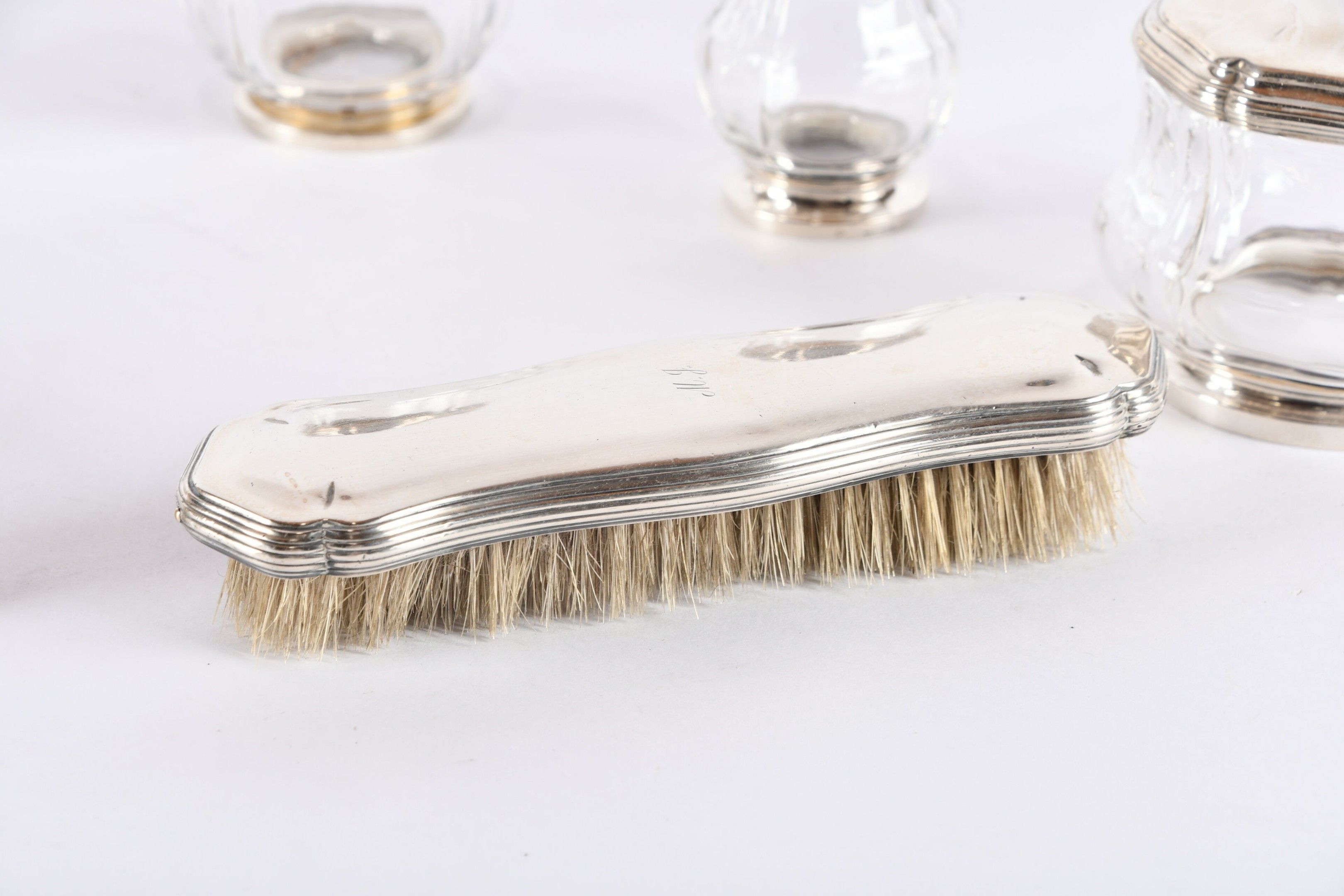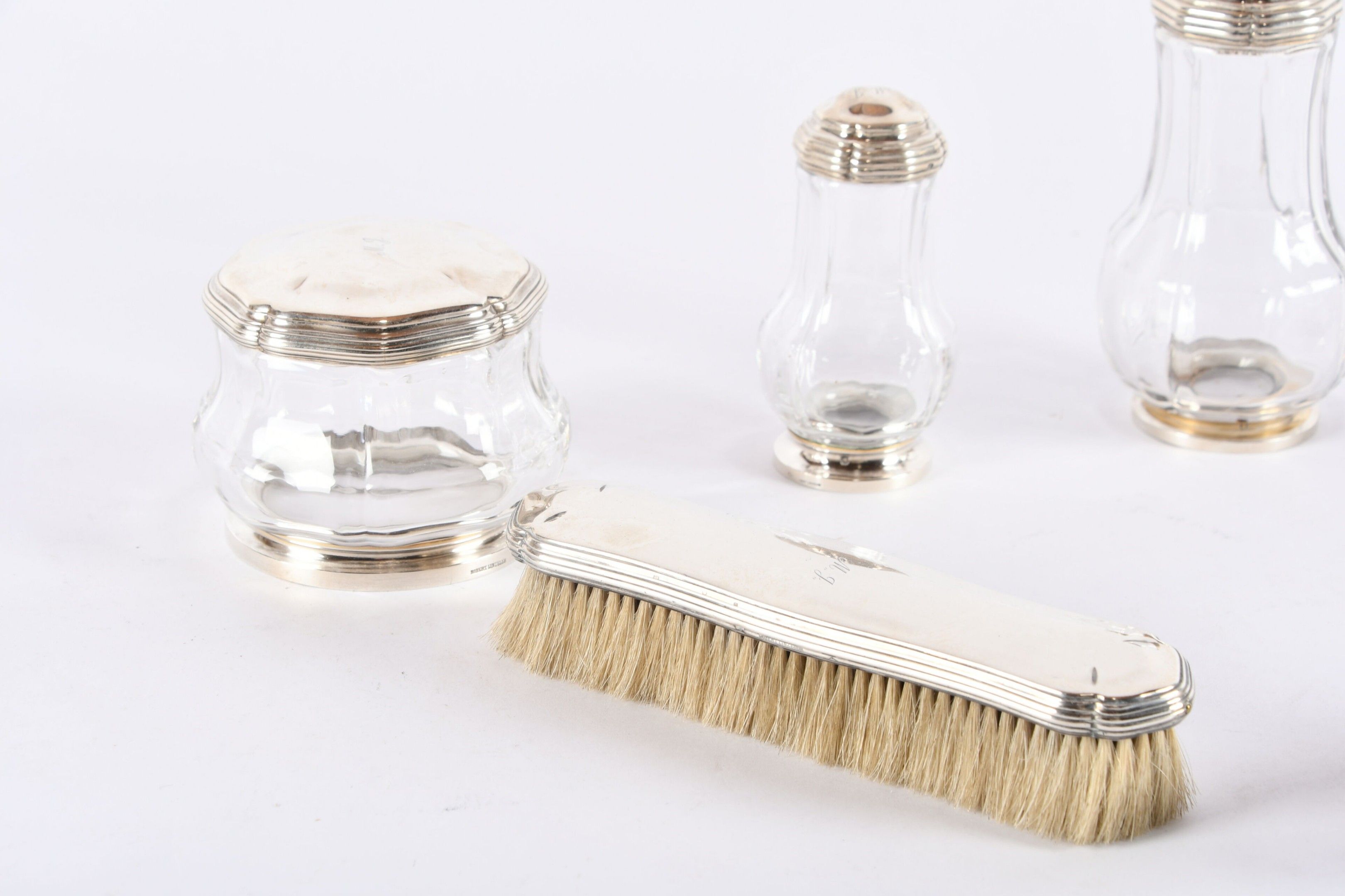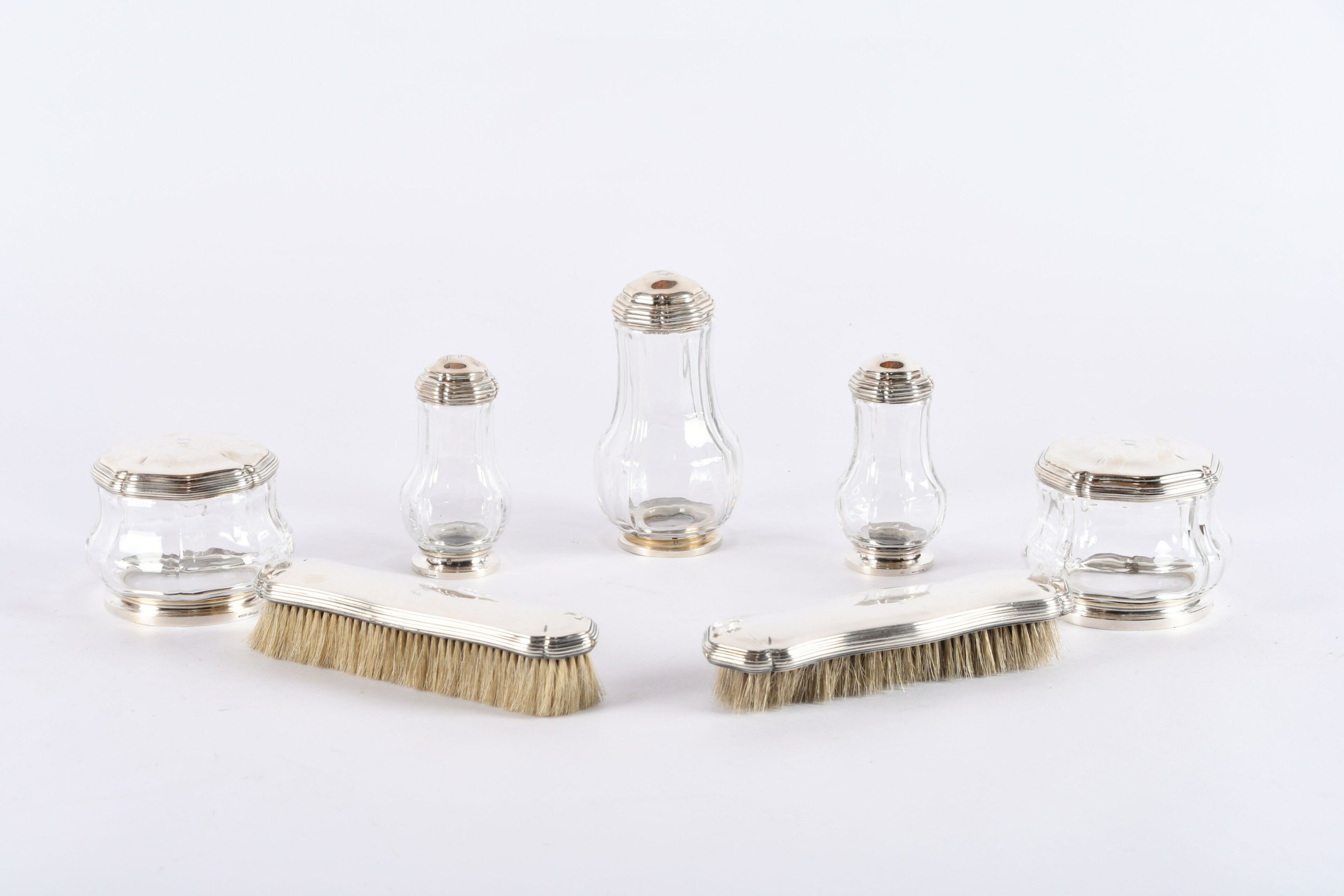 ROBERT LINZELER PARIS. Garniture de toilette en cristal de forme balustre à riche monture d'argent, monogrammée MJ comprenant : Un grand flacon (petite égrénure sur le corps), une paire de plus petits ; une paire de poudriers et deux brosses. Signatures et poinçons du maître sur chaque pièce. Poids des cinq couvercles : 390 g