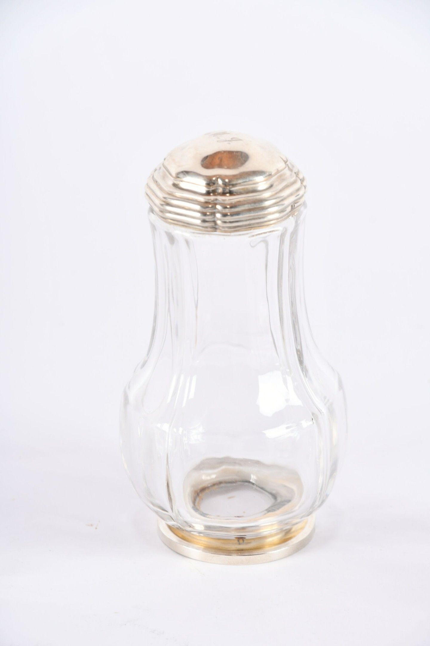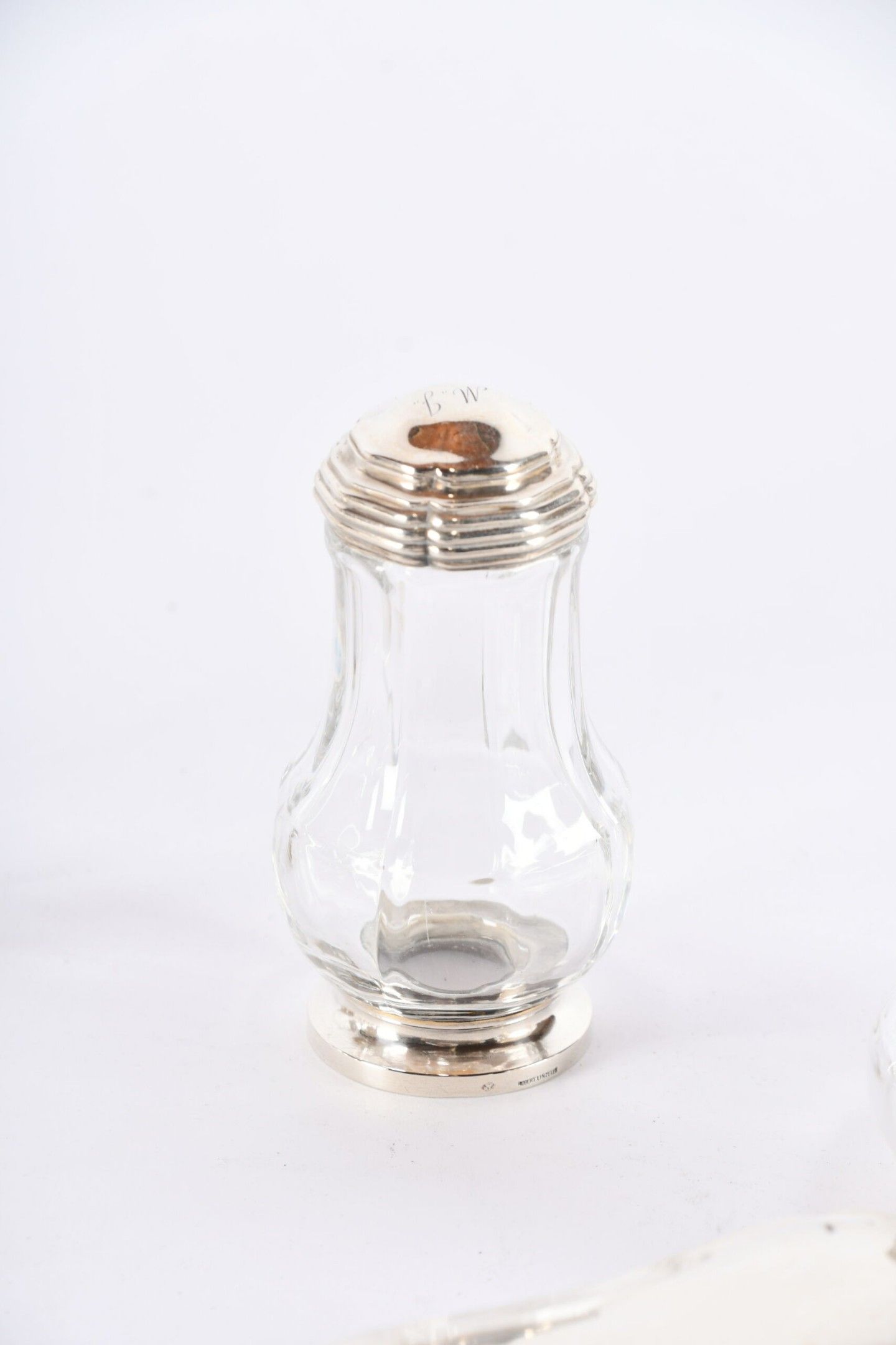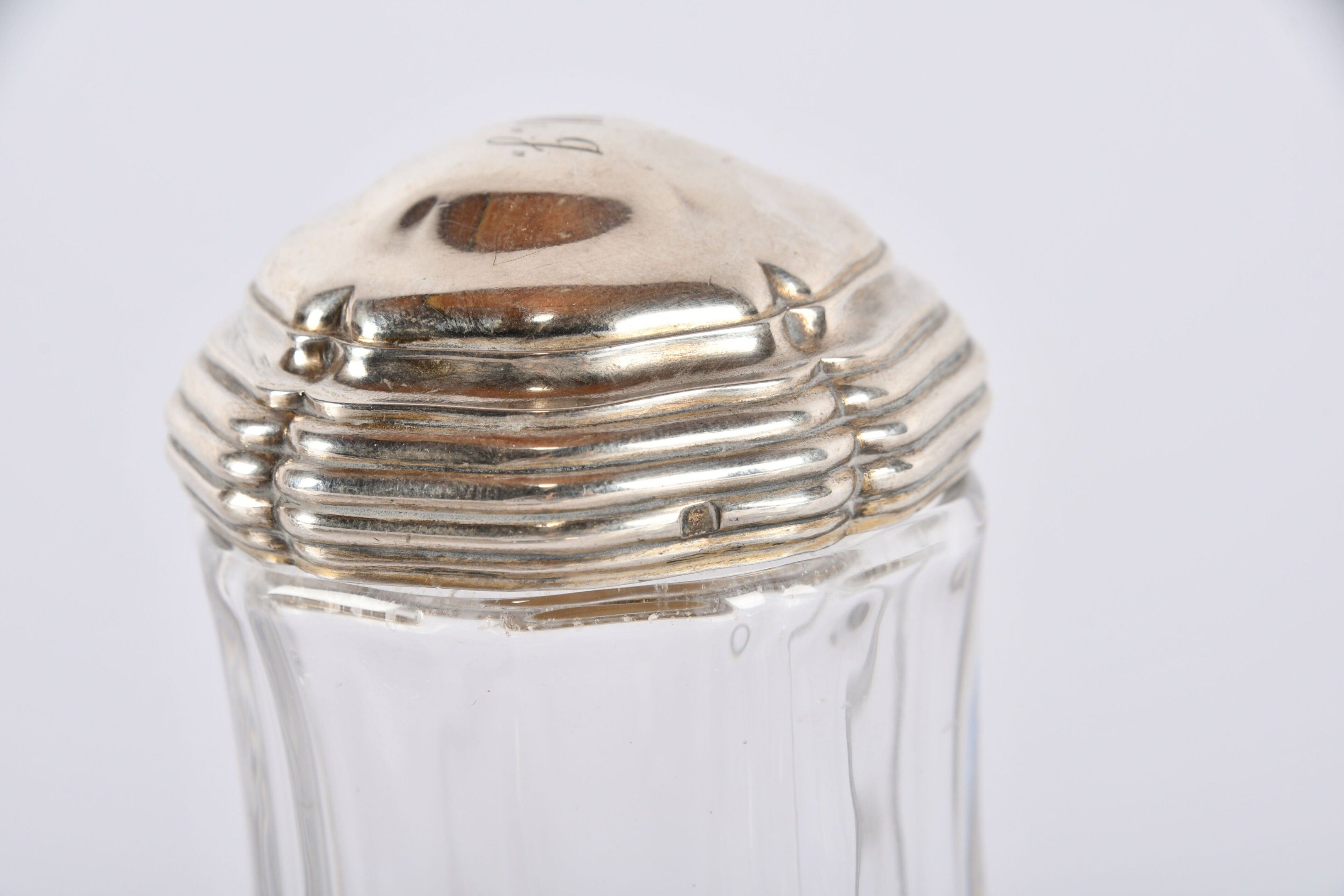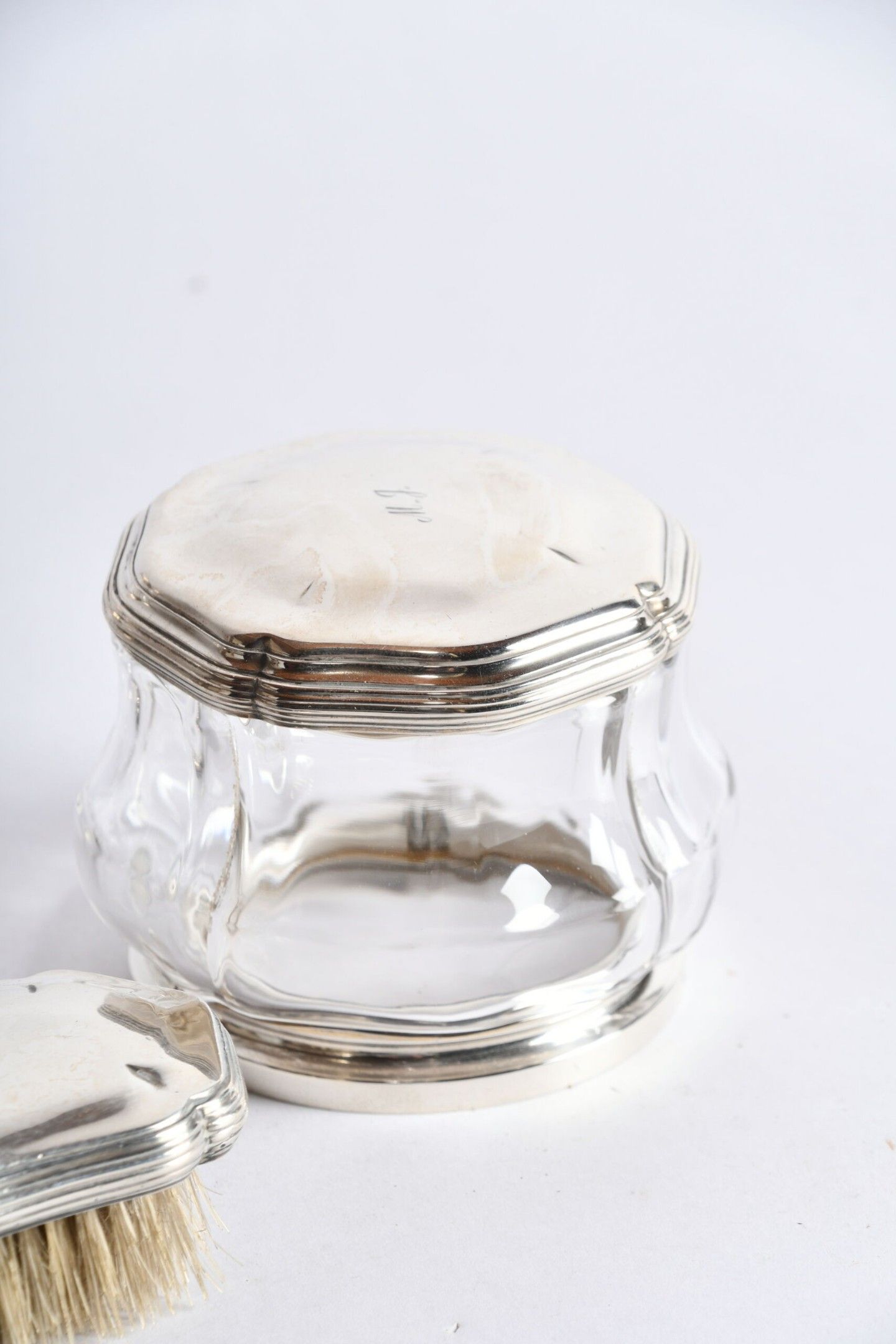 ROBERT LINZELER PARIS. Garniture de toilette en cristal de forme balustre à riche monture d'argent, monogrammée MJ comprenant : Un grand flacon (petite égrénure sur le corps), une paire de plus petits ; une paire de poudriers et deux brosses. Signatures et poinçons du maître sur chaque pièce. Poids des cinq couvercles : 390 g