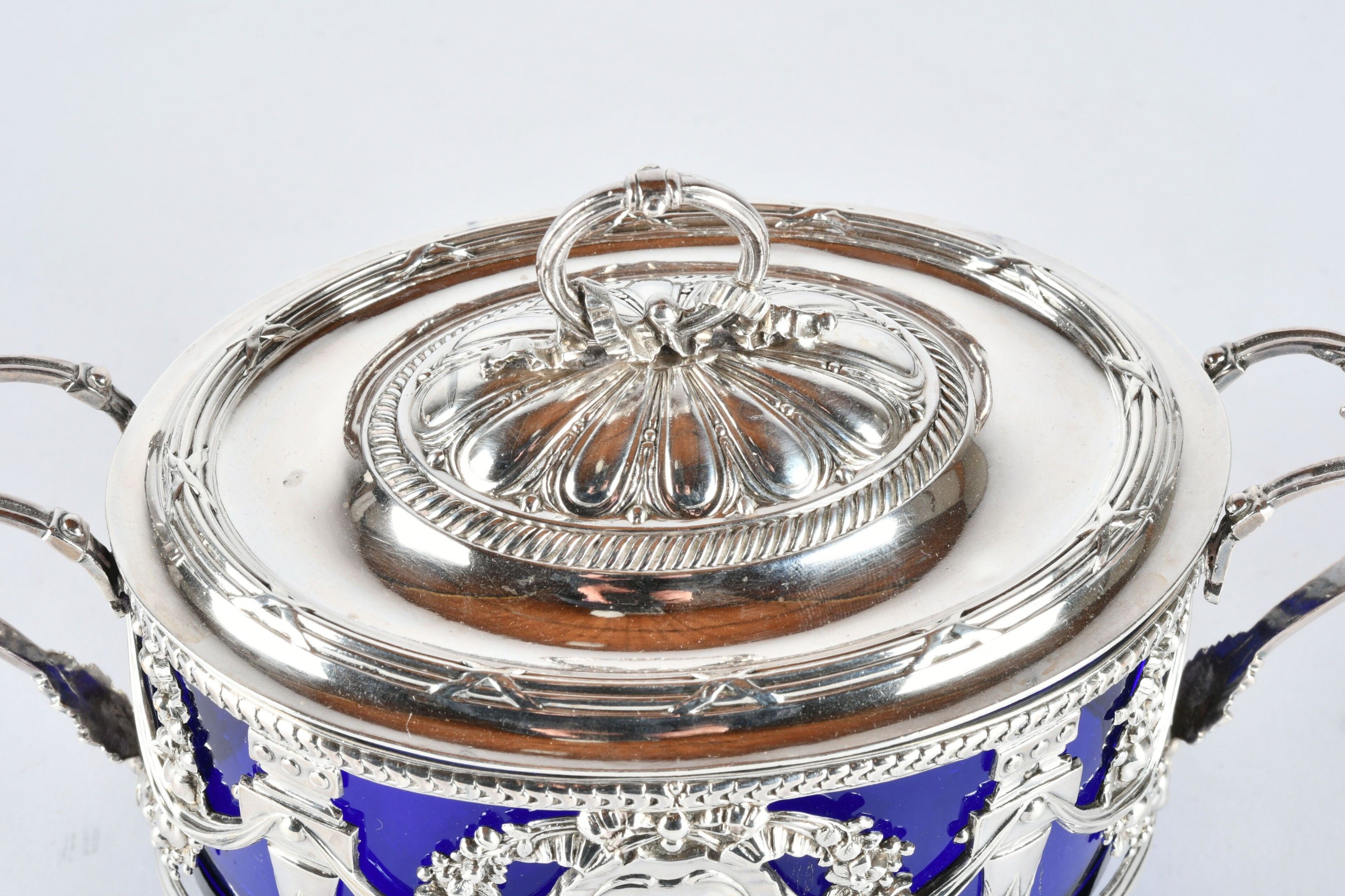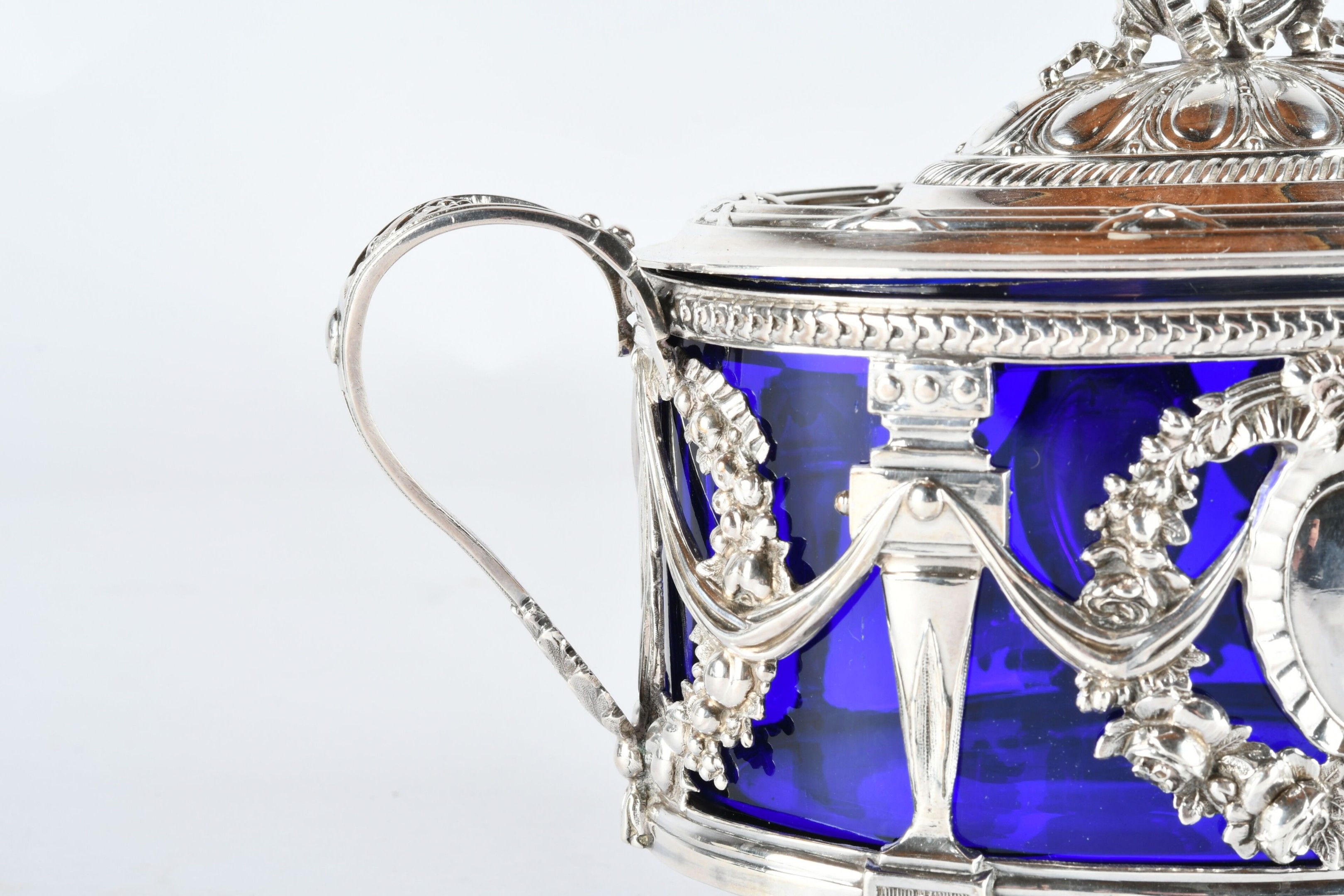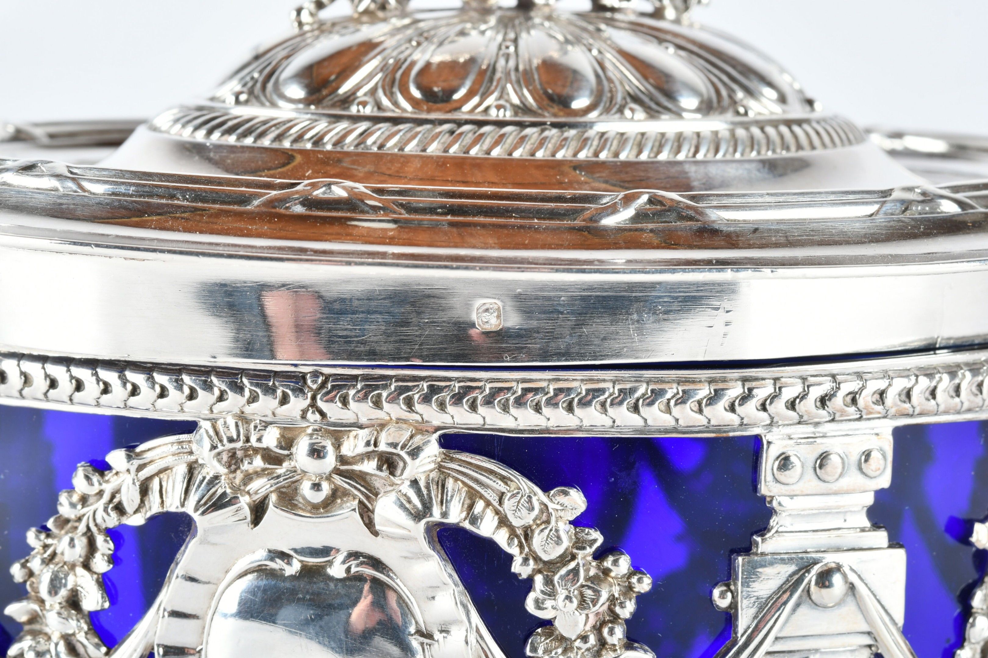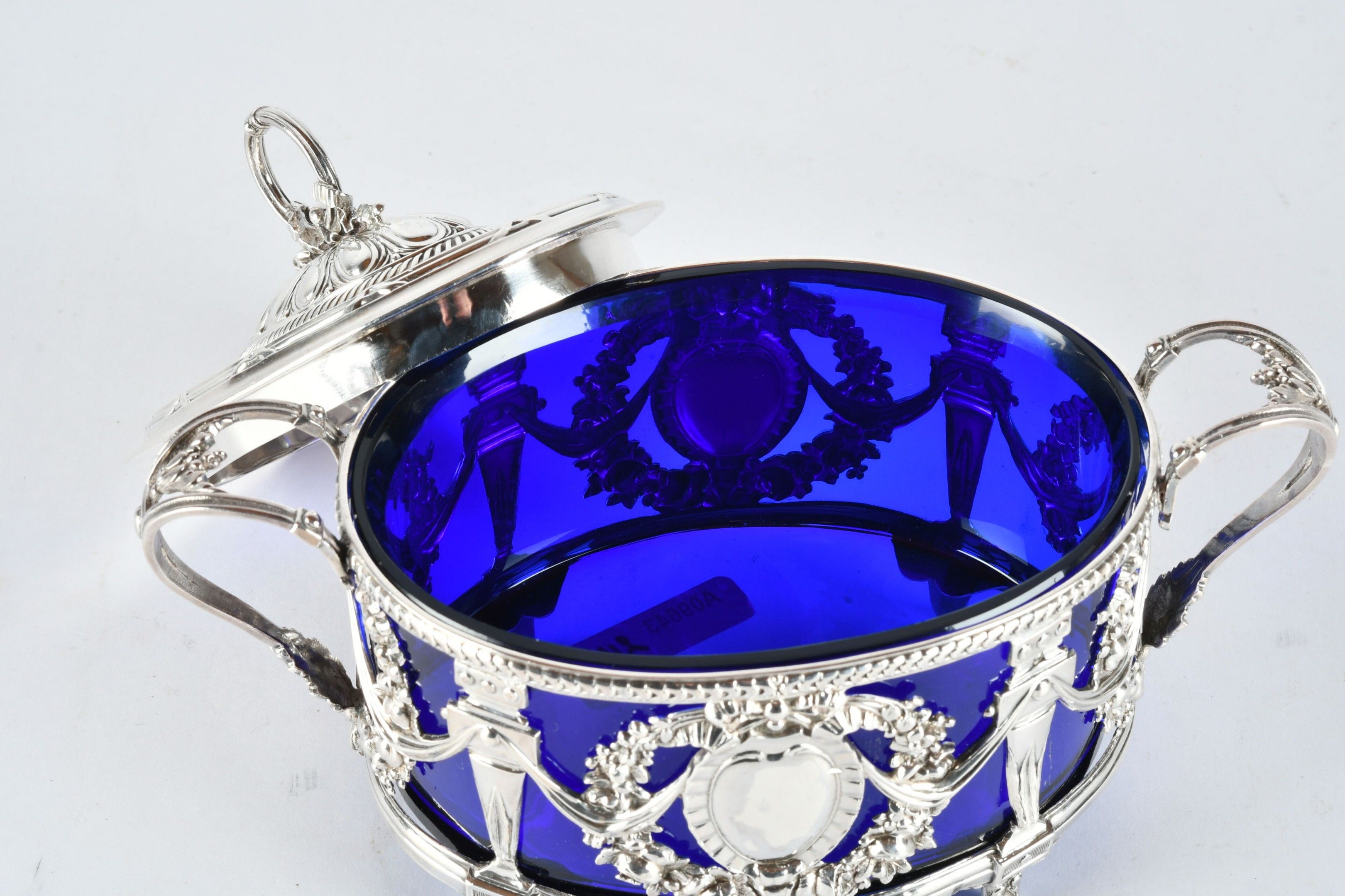 SUCRIER couvert ovale à anses en argent à décor néoclassique ajouré de médaillon et drapé. Intérieur de verre bleu. Poinçon de Boulenger. Style Louis XVI. (petits chocs) H. 14 - L. 21 cm - Poids d'argent : 330 g