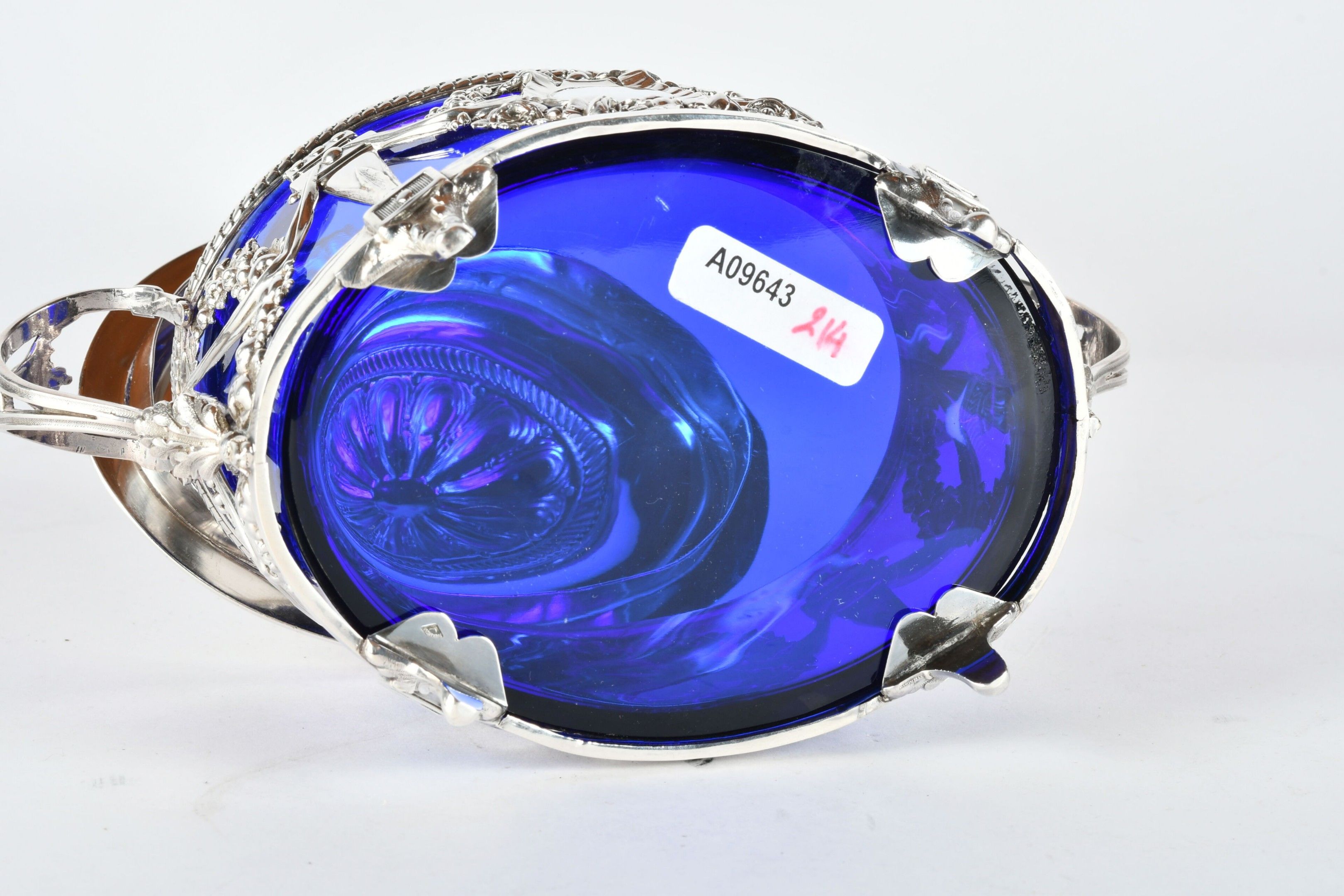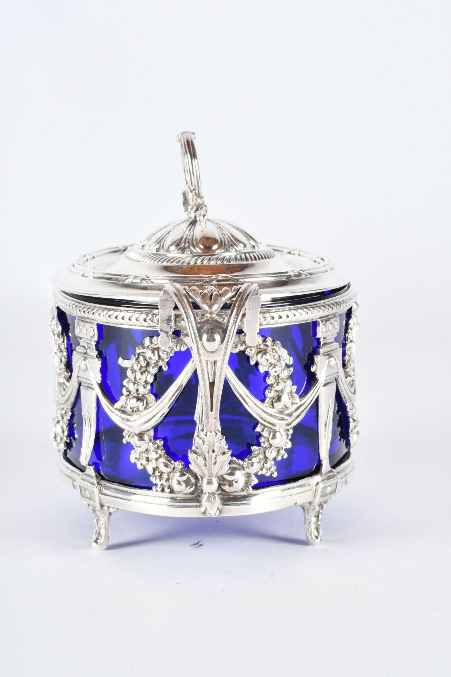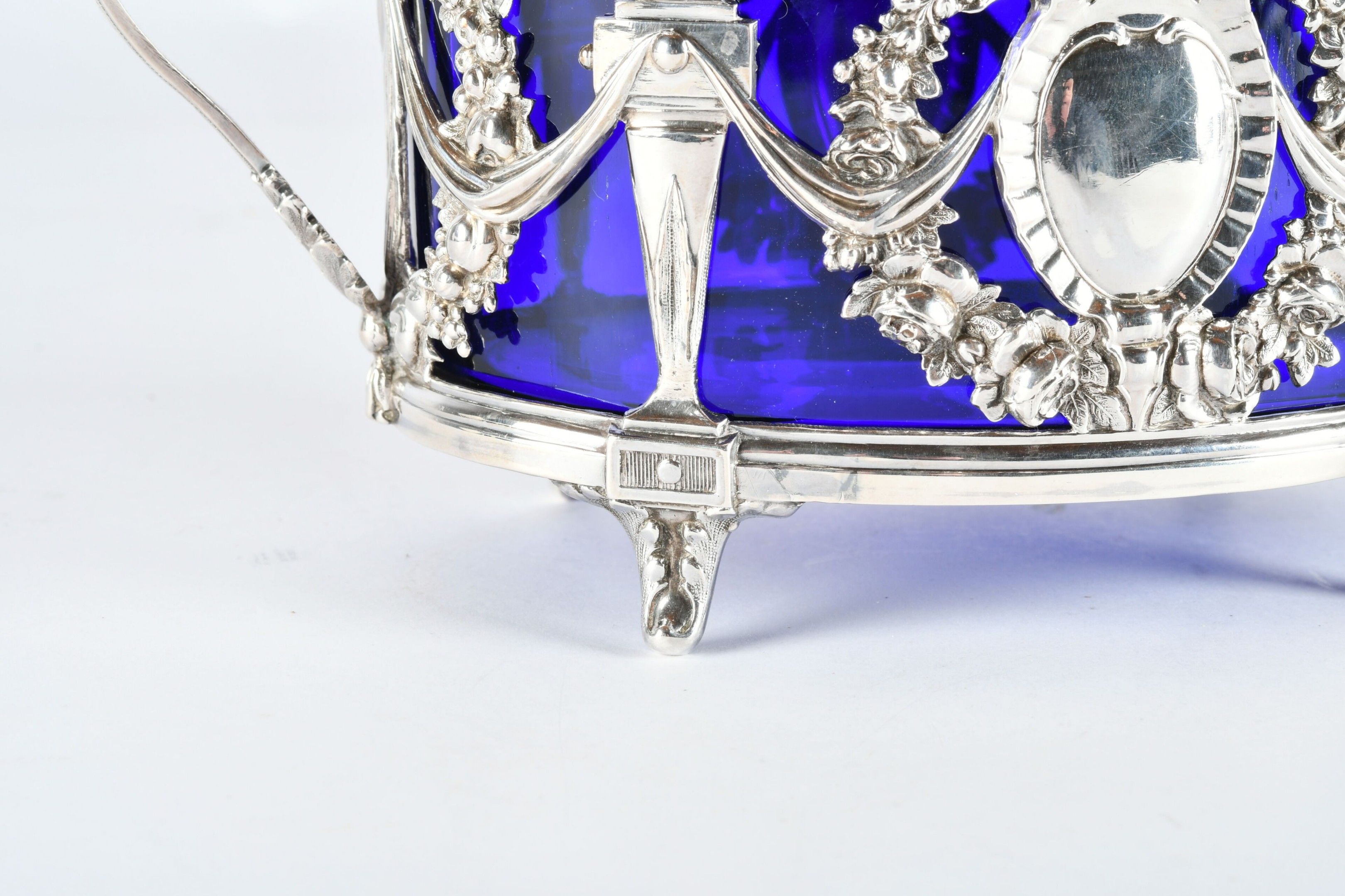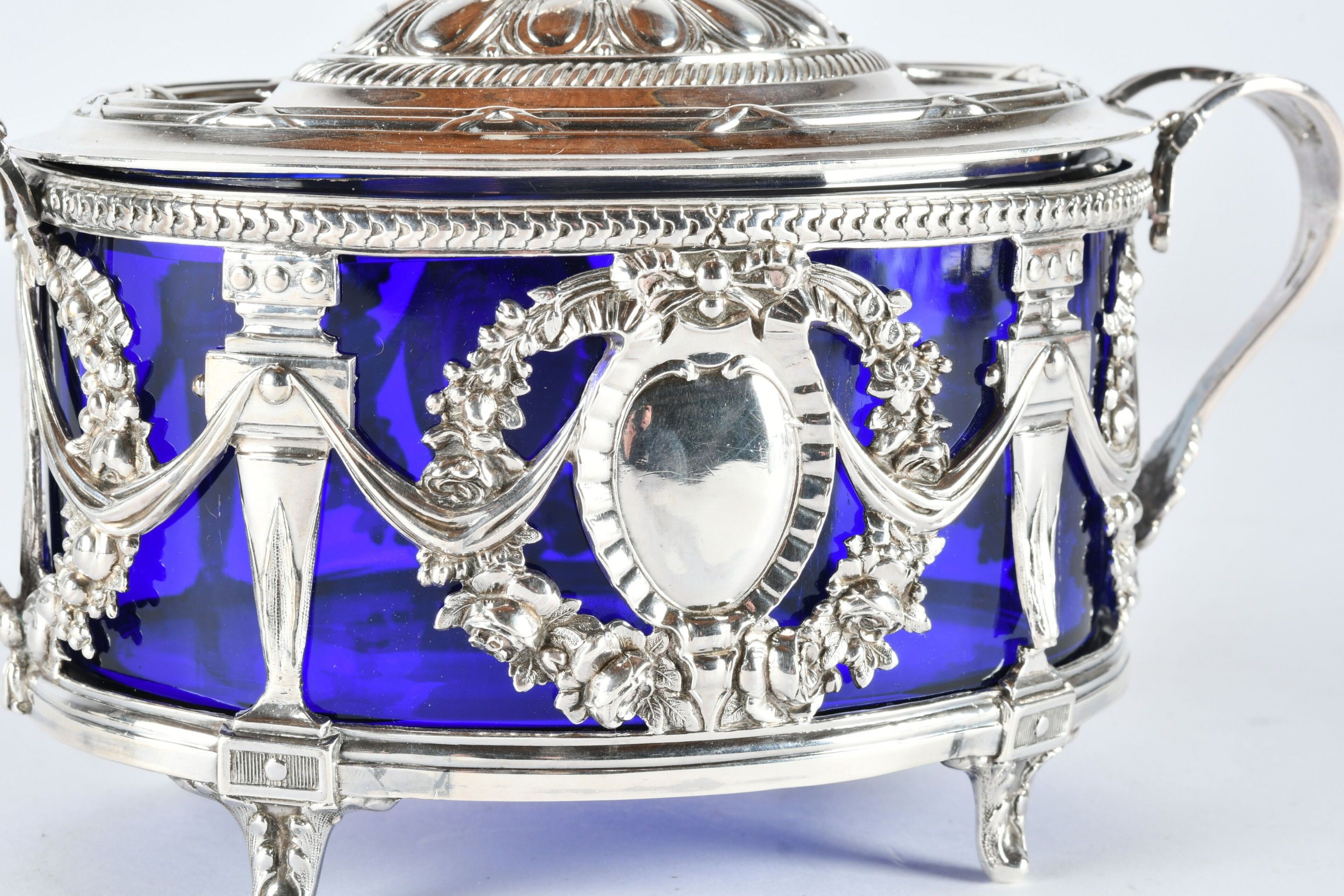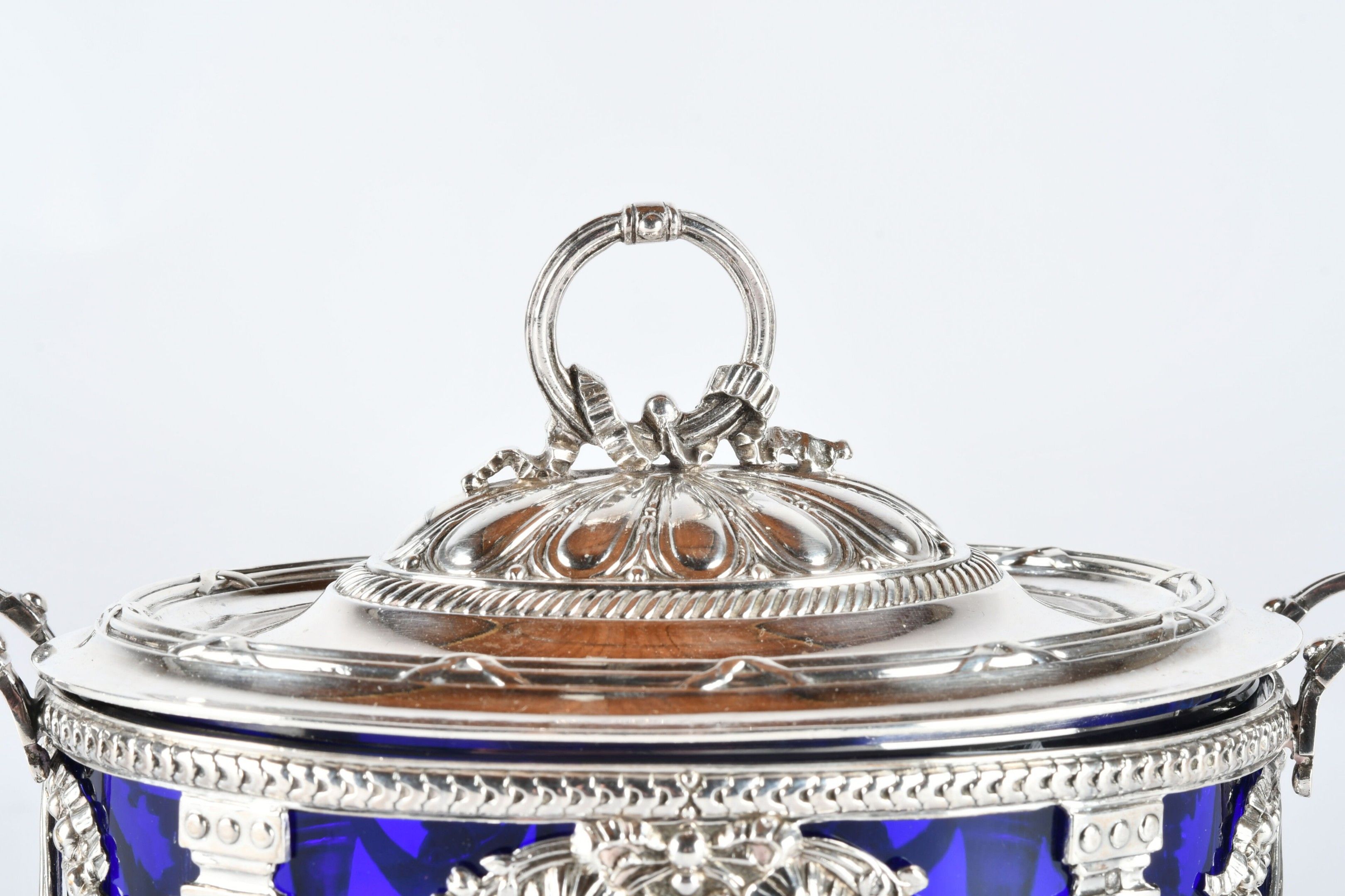 SUCRIER couvert ovale à anses en argent à décor néoclassique ajouré de médaillon et drapé. Intérieur de verre bleu. Poinçon de Boulenger. Style Louis XVI. (petits chocs) H. 14 - L. 21 cm - Poids d'argent : 330 g