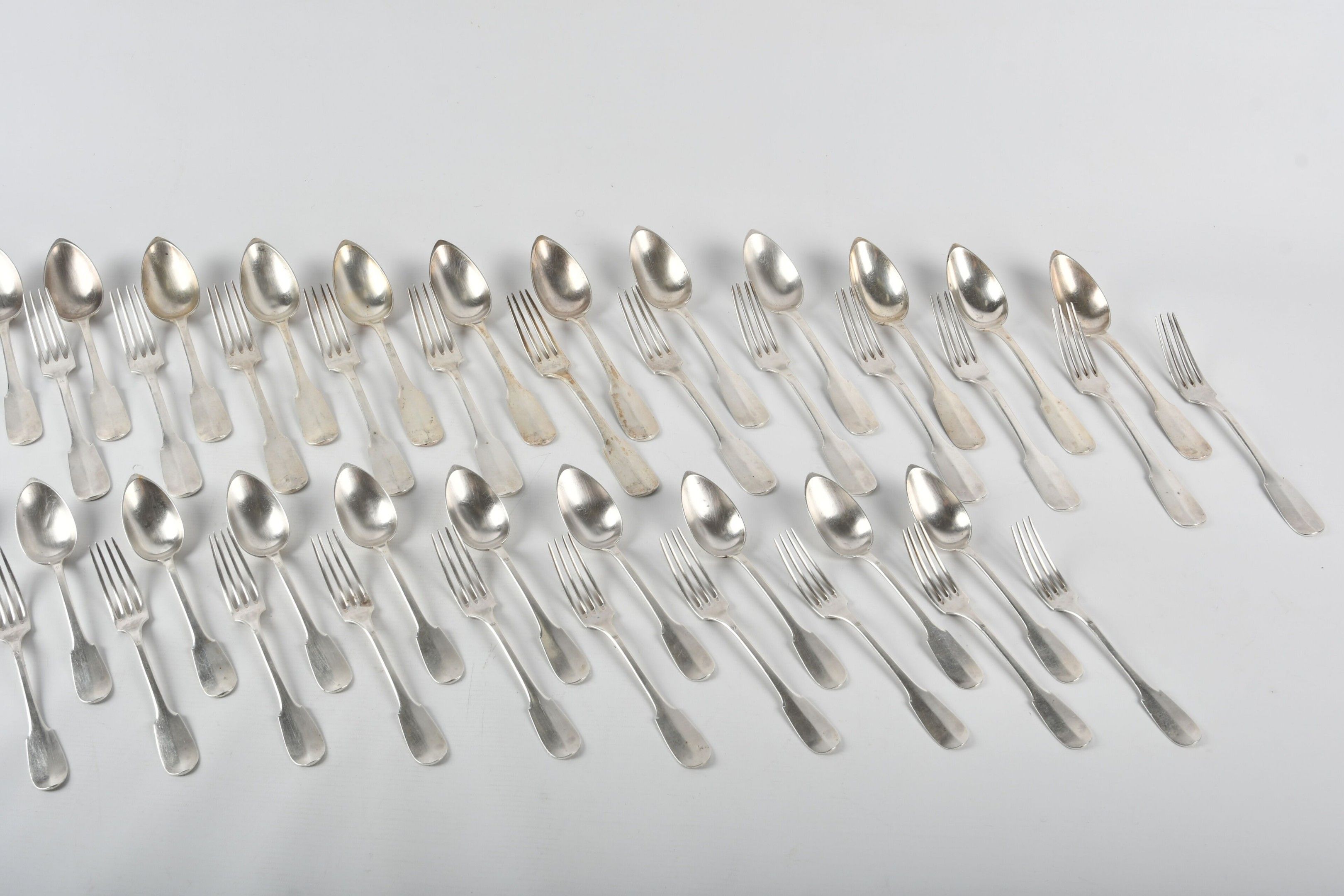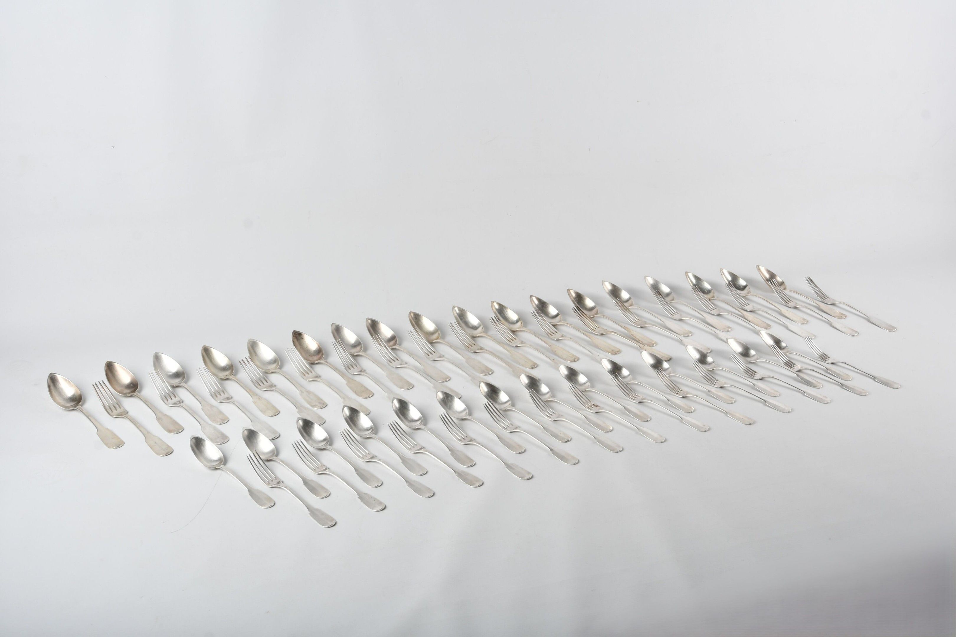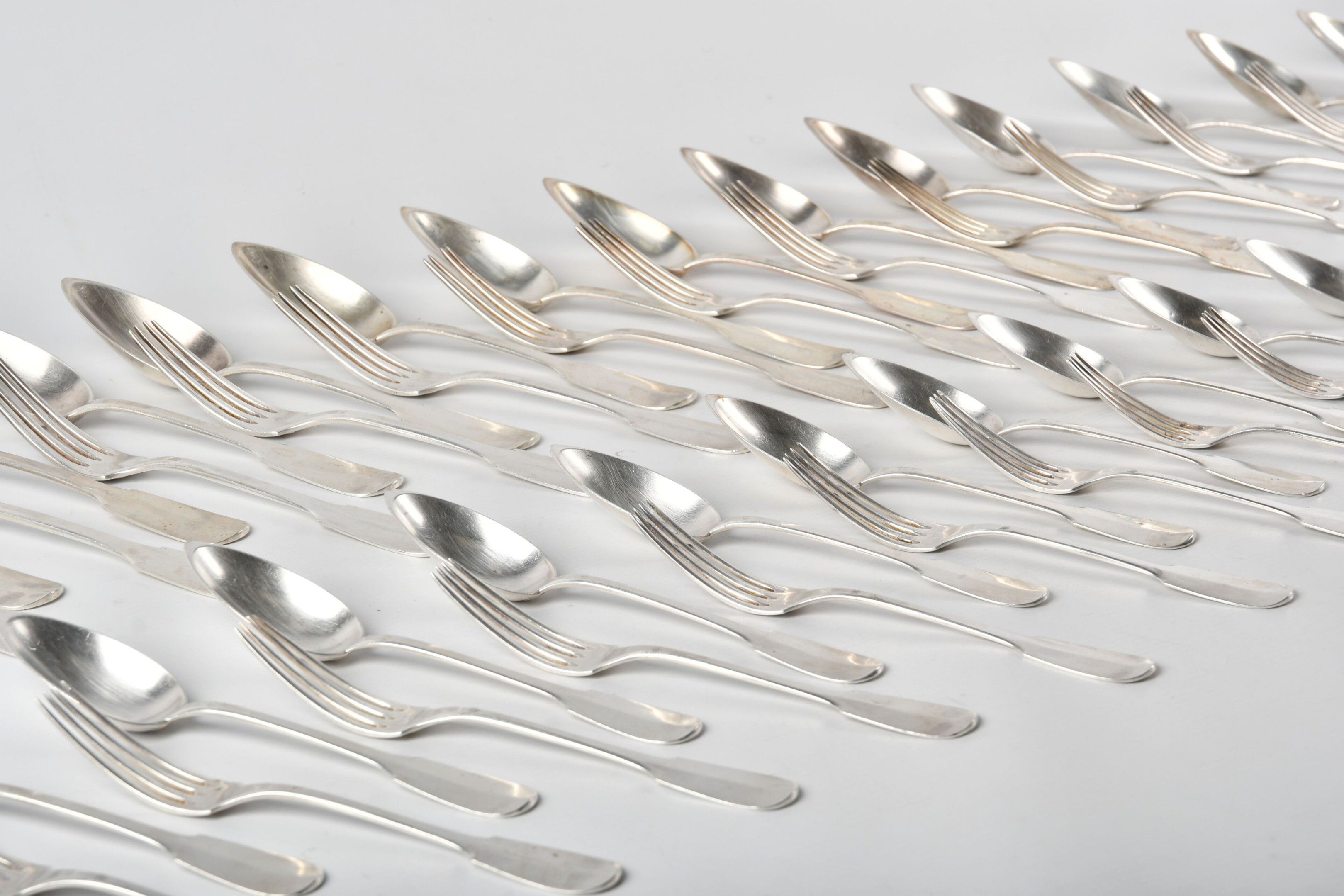 MENAGERE en argent, modèle uniplat, monogrammée PB, comprenant : vingt grands couverts et quatorze couverts à entremets. XIXème siècle. Poids : 4510 g