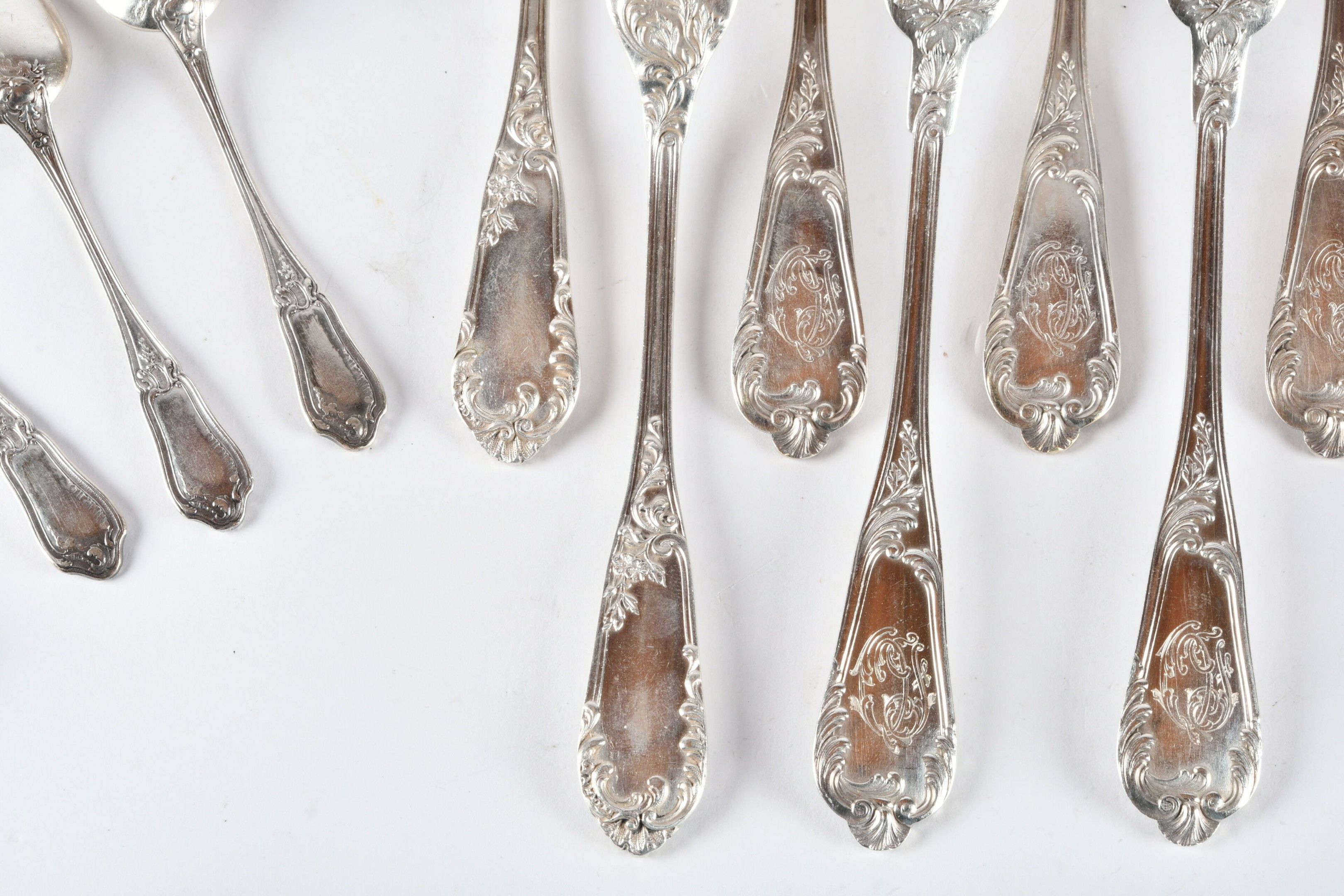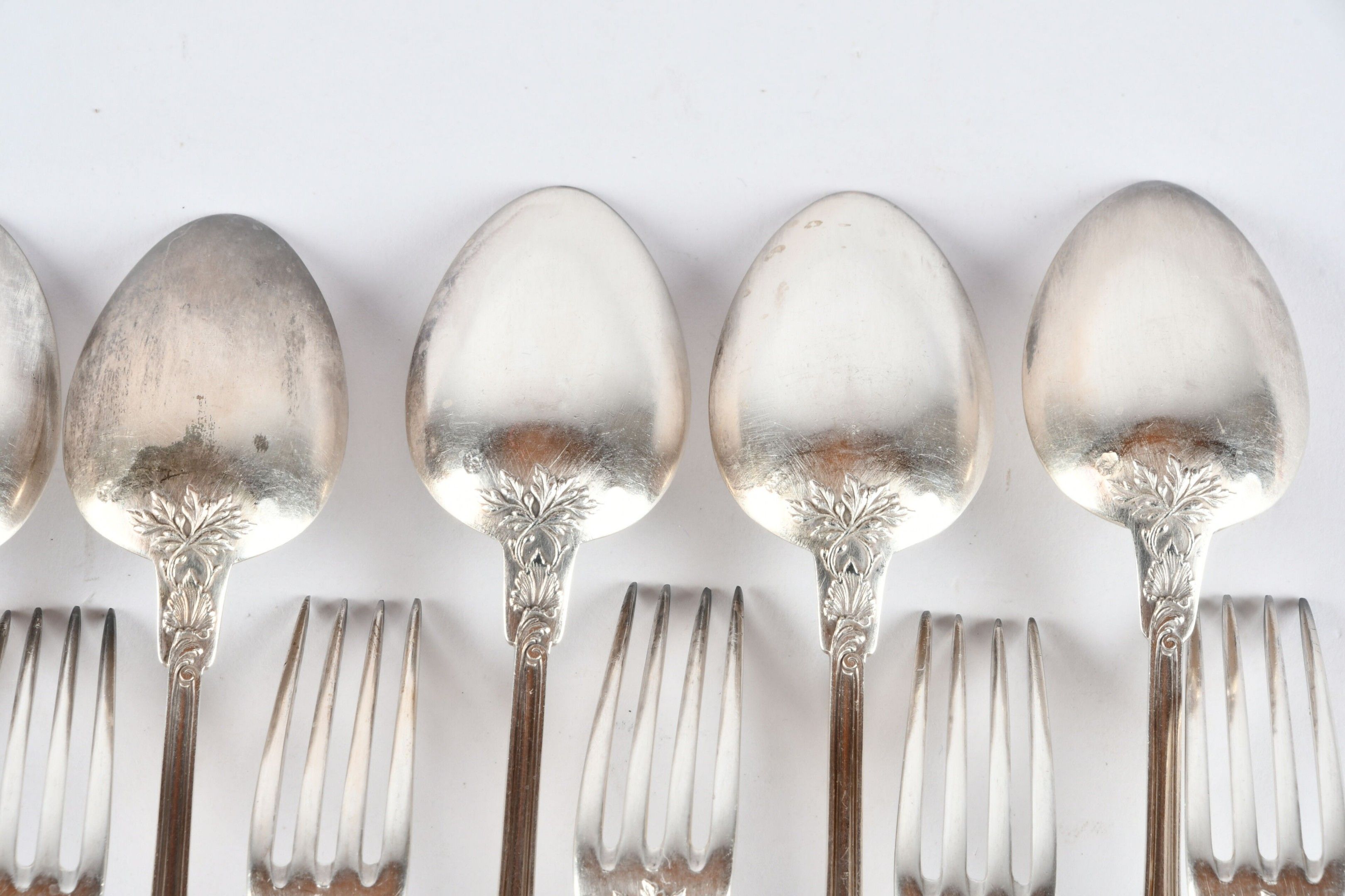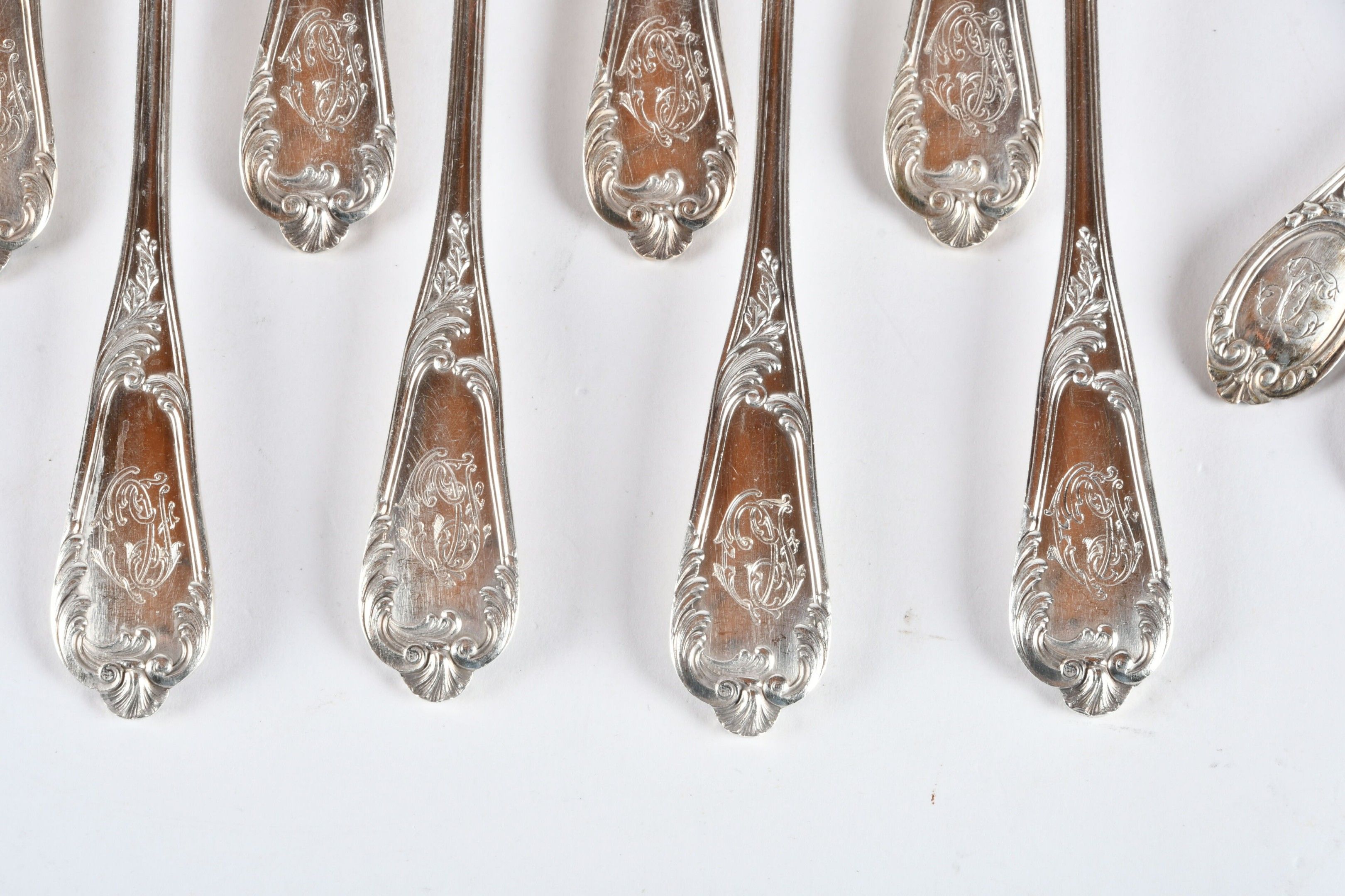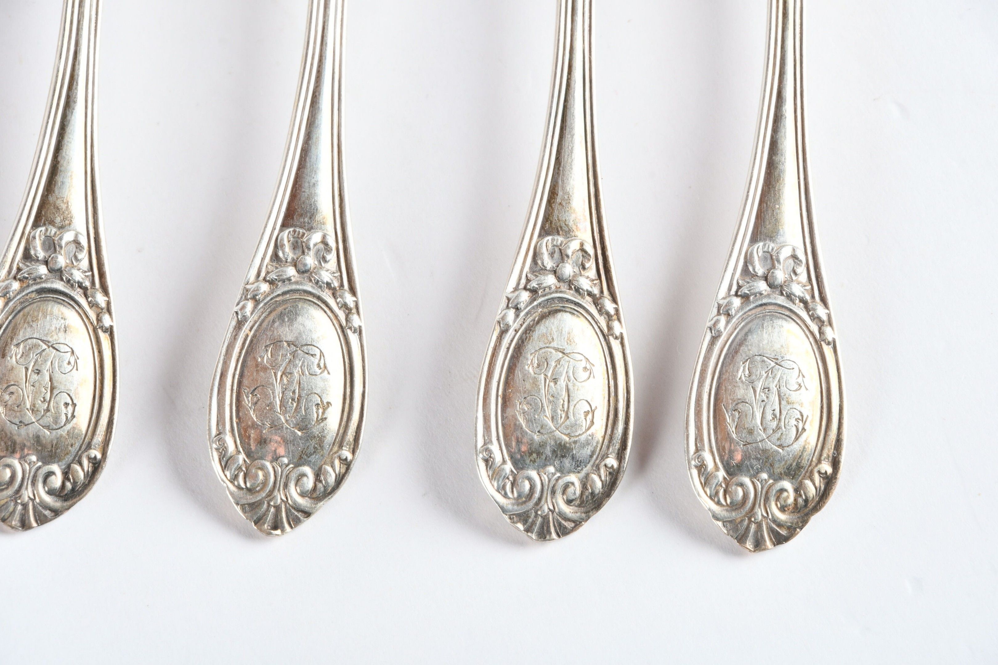 COUVERTS à ENTREMETS (suite de six) en argent, décor feuillagé monogrammé ET une modèle similaire non monogrammé. JOINT une suite de six PETITES CUILLERES argent monogrammées et cinq AUTRES dépareillées. Poids total : 930 g