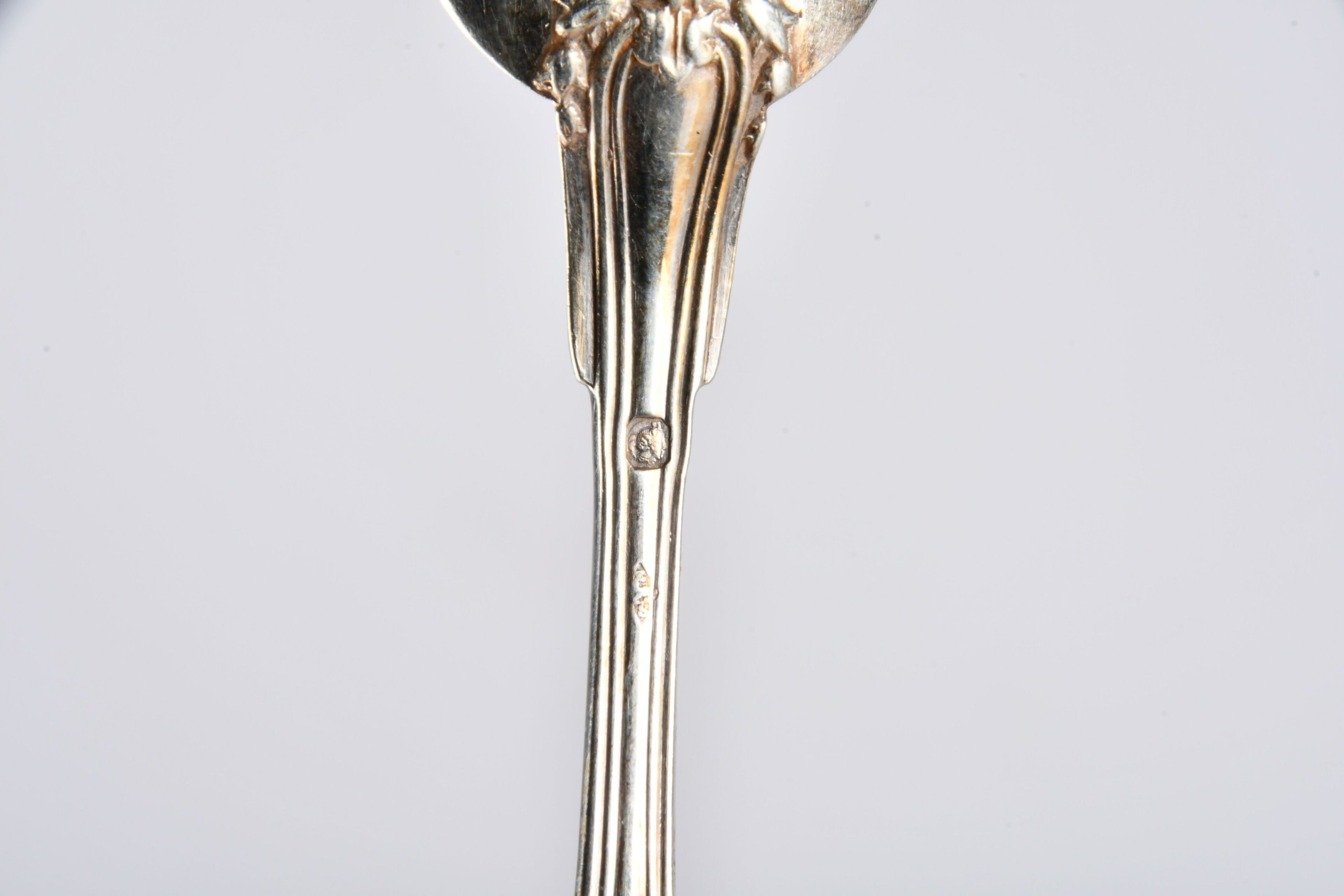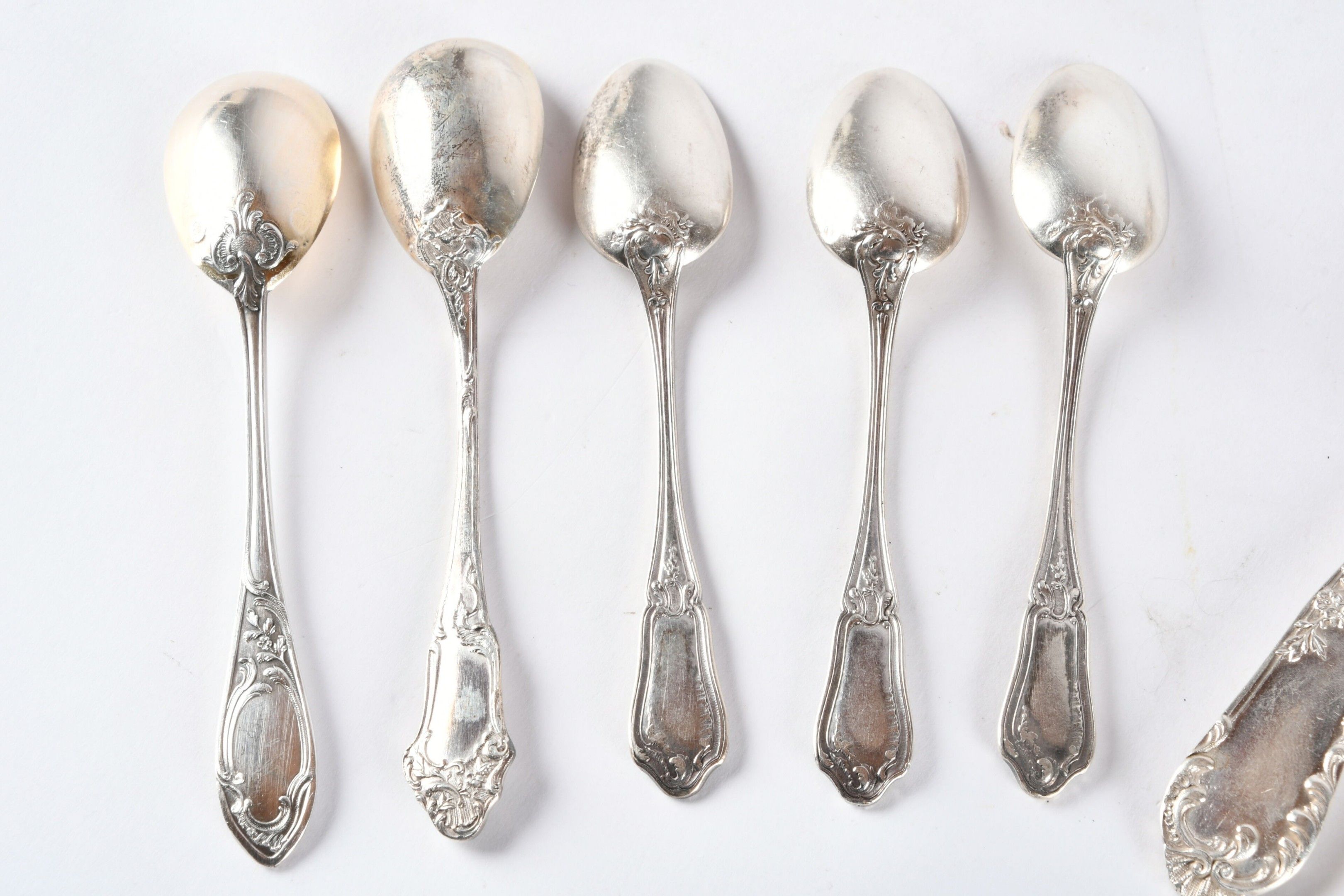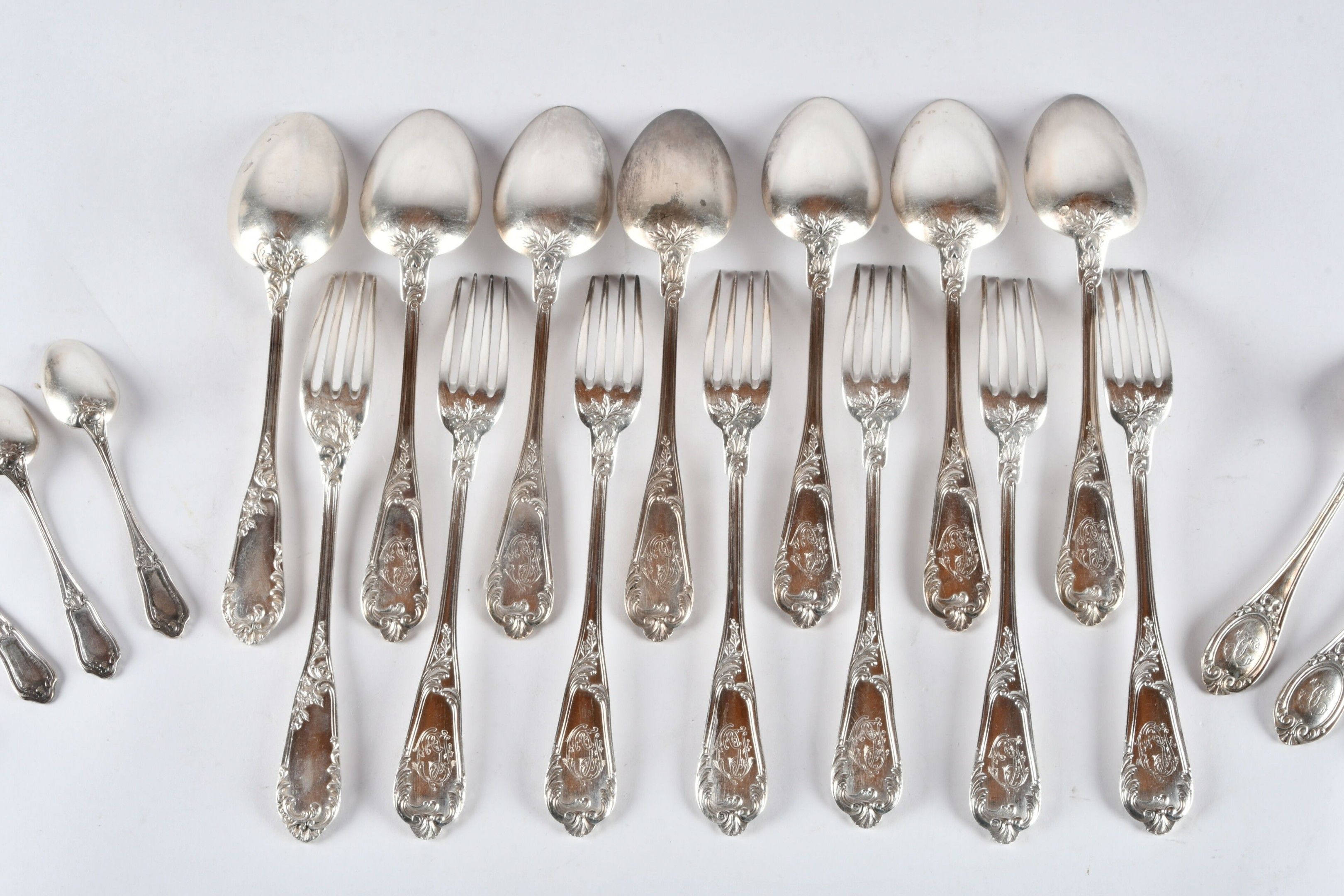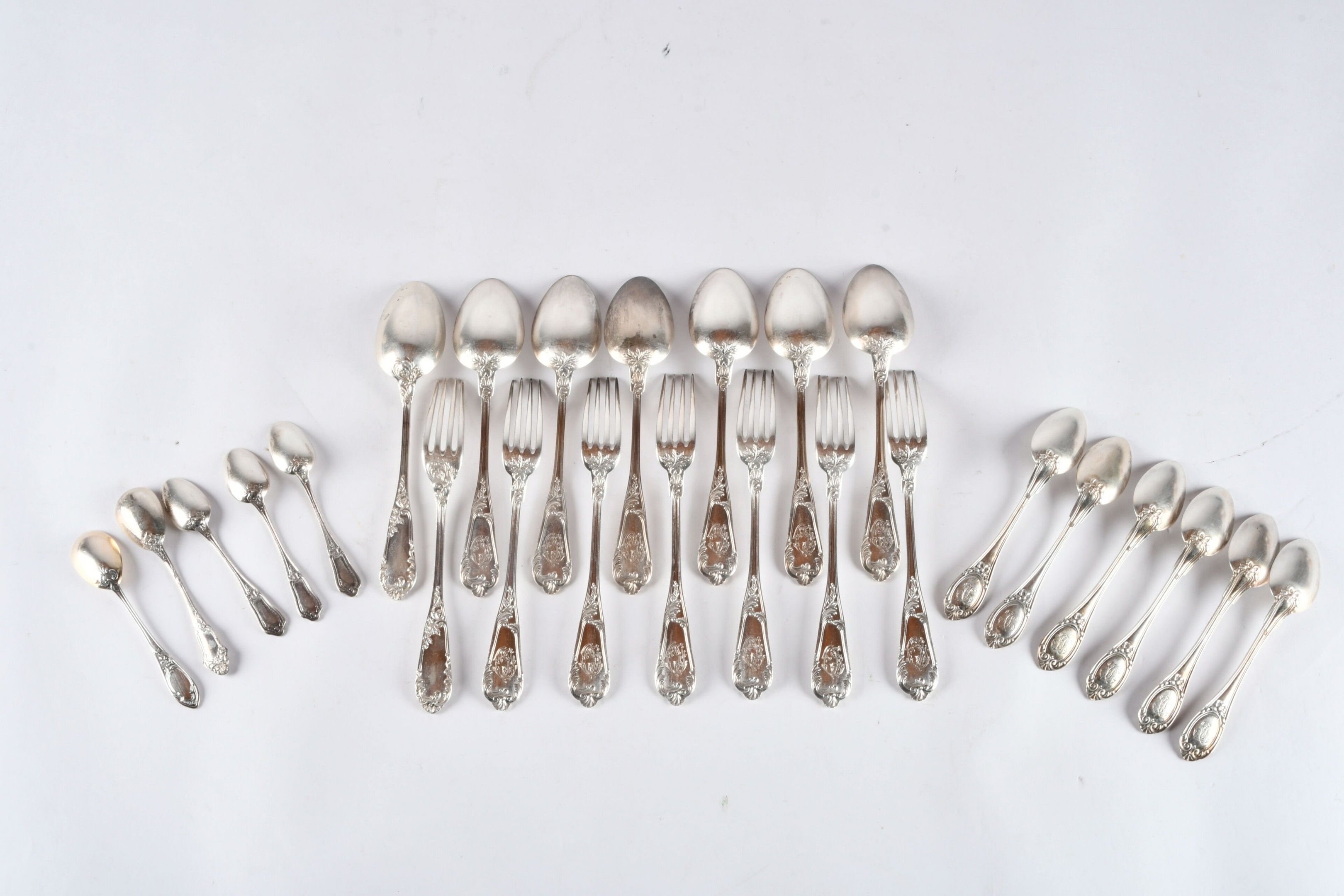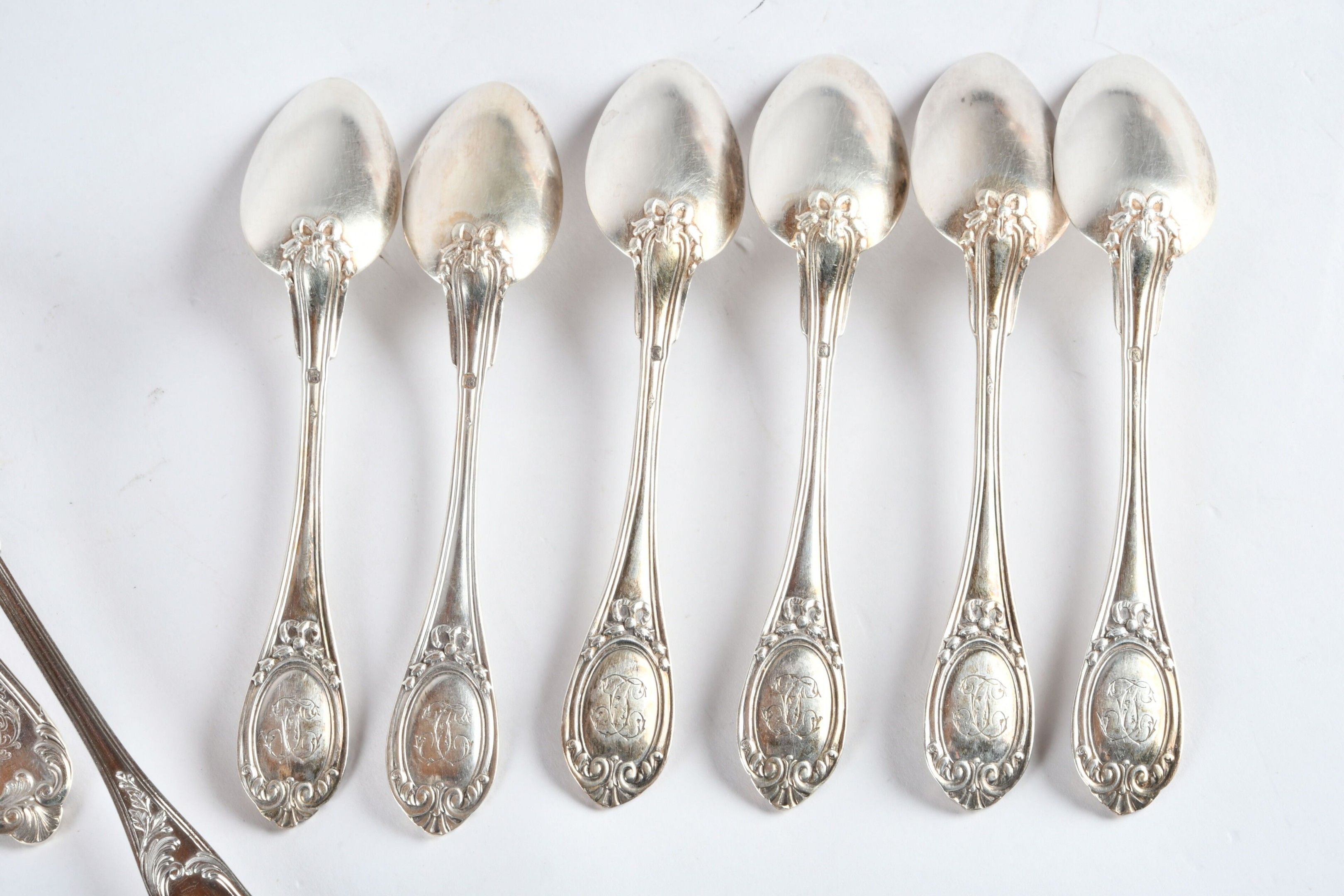 COUVERTS à ENTREMETS (suite de six) en argent, décor feuillagé monogrammé ET une modèle similaire non monogrammé. JOINT une suite de six PETITES CUILLERES argent monogrammées et cinq AUTRES dépareillées. Poids total : 930 g