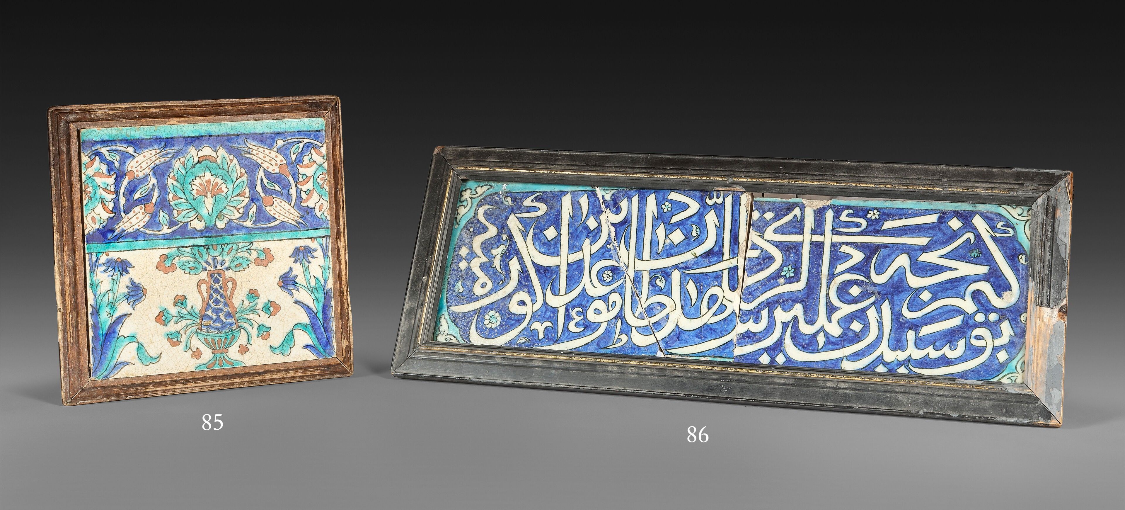 Ces fragments de frises sont à décor de grandes calligraphies ornementales en thuluth blanches sur fond cobalt, inscrites dans des cartouches bordés d'écoinçons à décor de palmettes blanches sur fond turquoise. On pouvait trouver des panneaux architecturaux comparables dans des contextes aussi bien religieux que palatiaux.