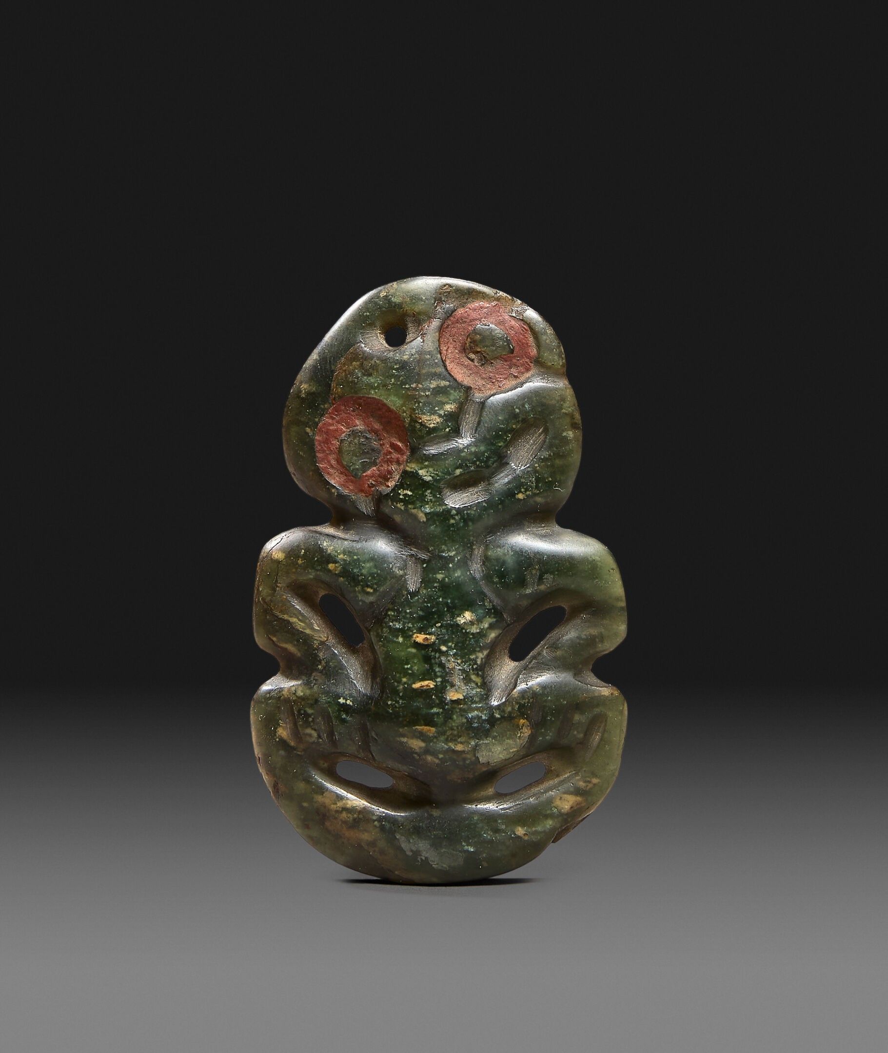 Hei-Tiki, pendentif. Jade néphrite vert, subsistance de cire…