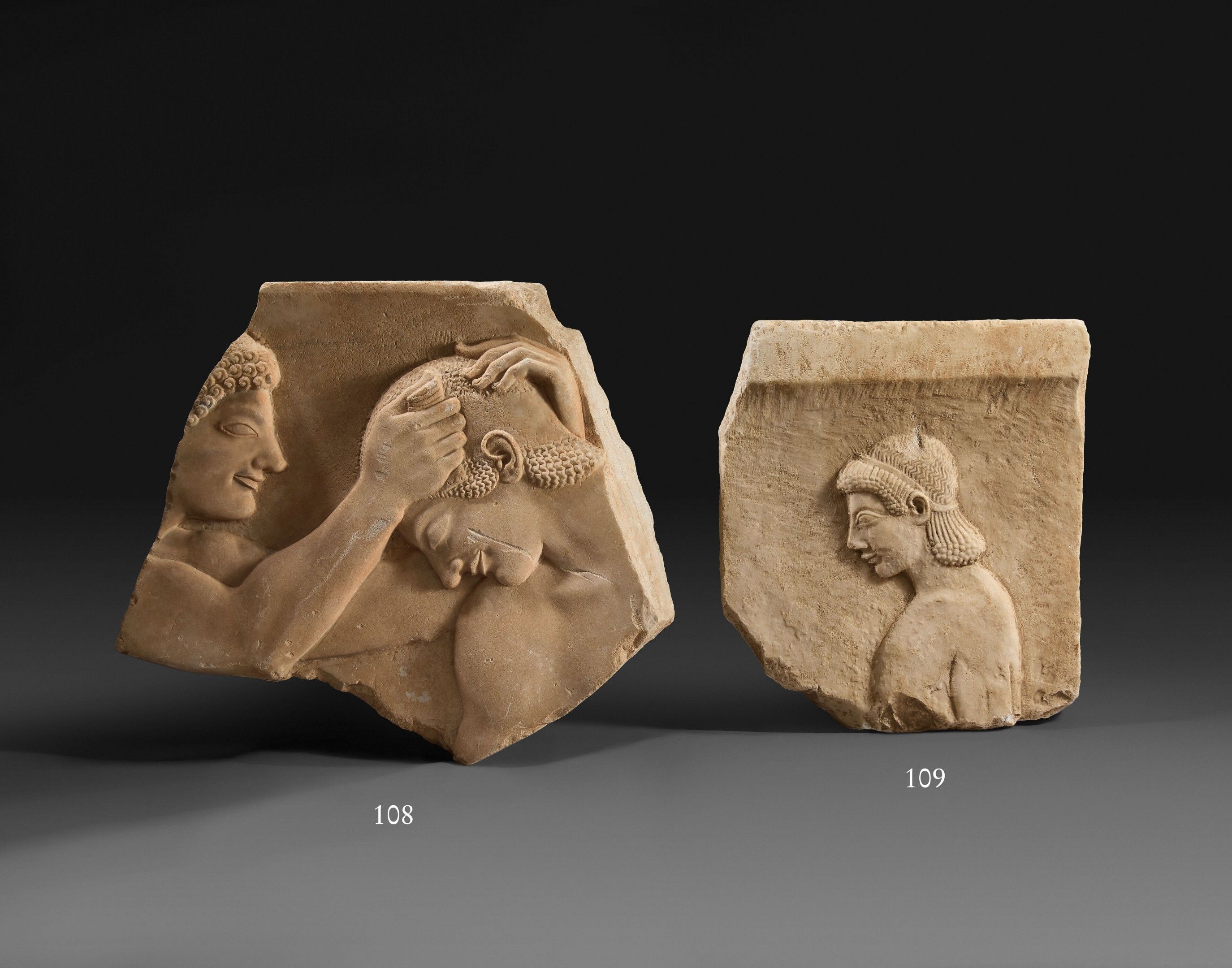 Relief fragmentaire représentant un éphèbe ceignant d'un bandeau la tête d'un athlète.