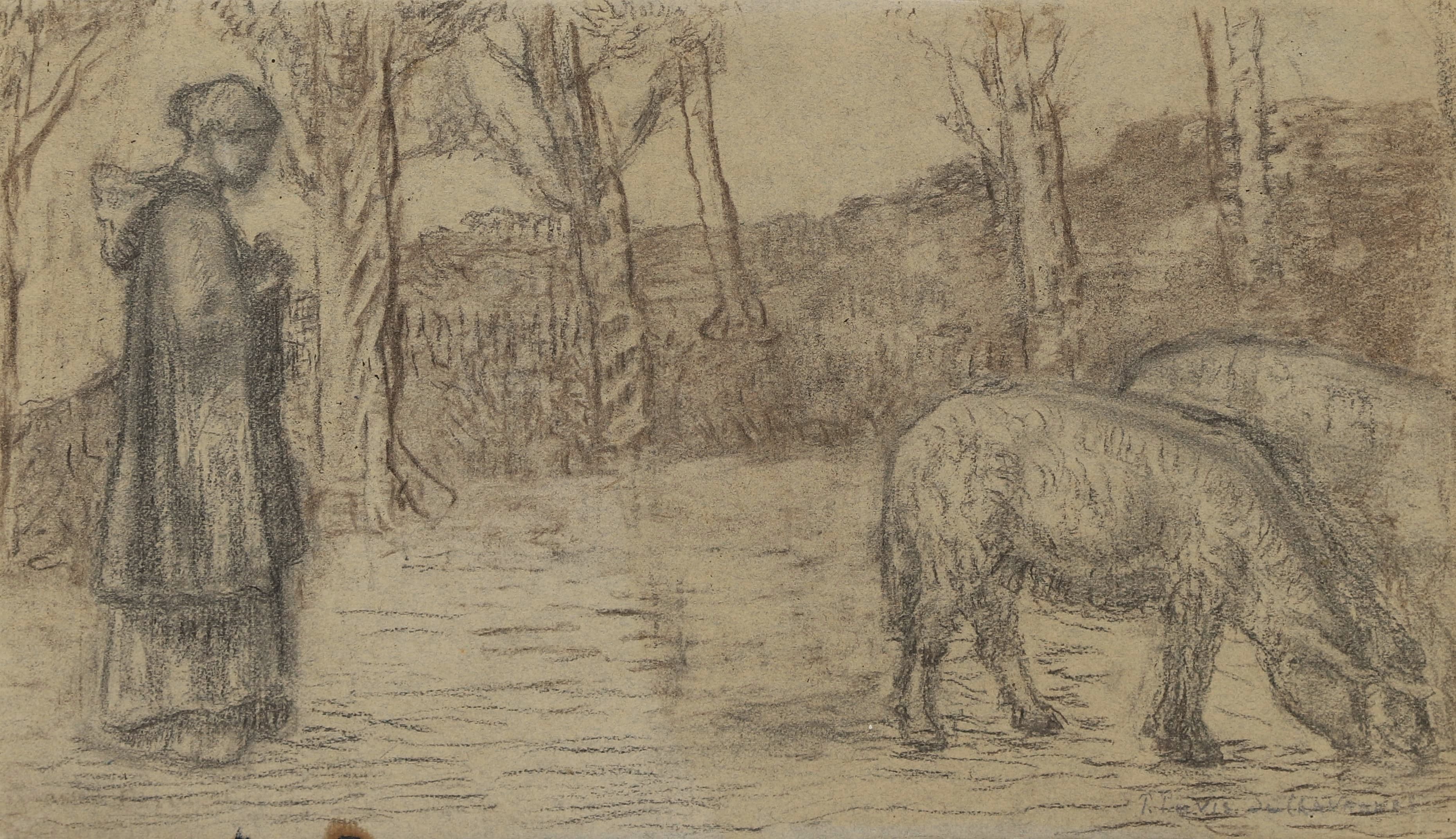 Pierre Puvis de Chavannes (1824-1898) Bergère et son troupeau Fusain sur papier signé en bas à droite 21 x 36 cm Rapport de condition : Tache en bas à gauche