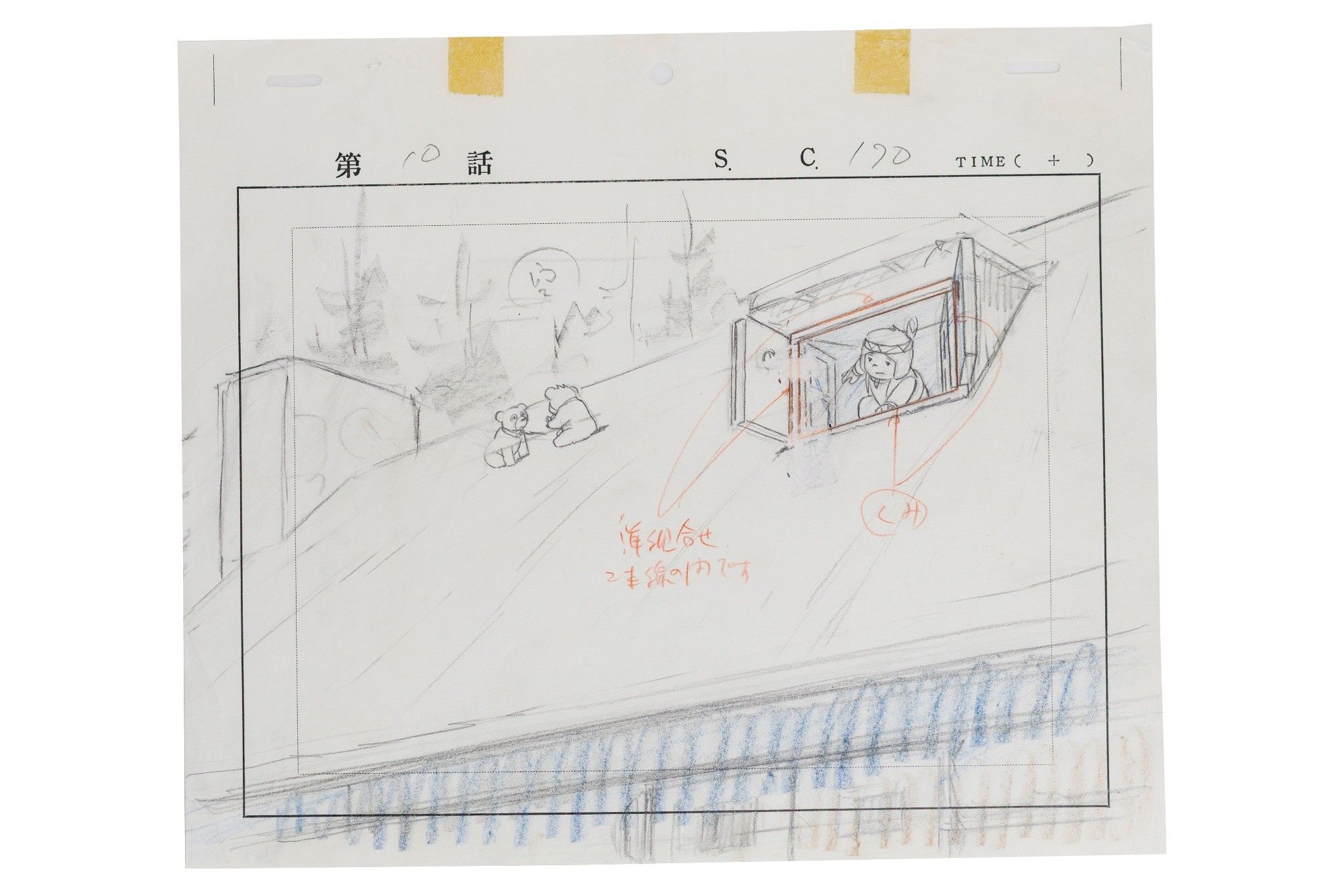 Cellulo triple couches à l’encre et à la gouache sur fond gouaché matching accompagné d’un layout à la mine de plomb et aux crayons de couleur