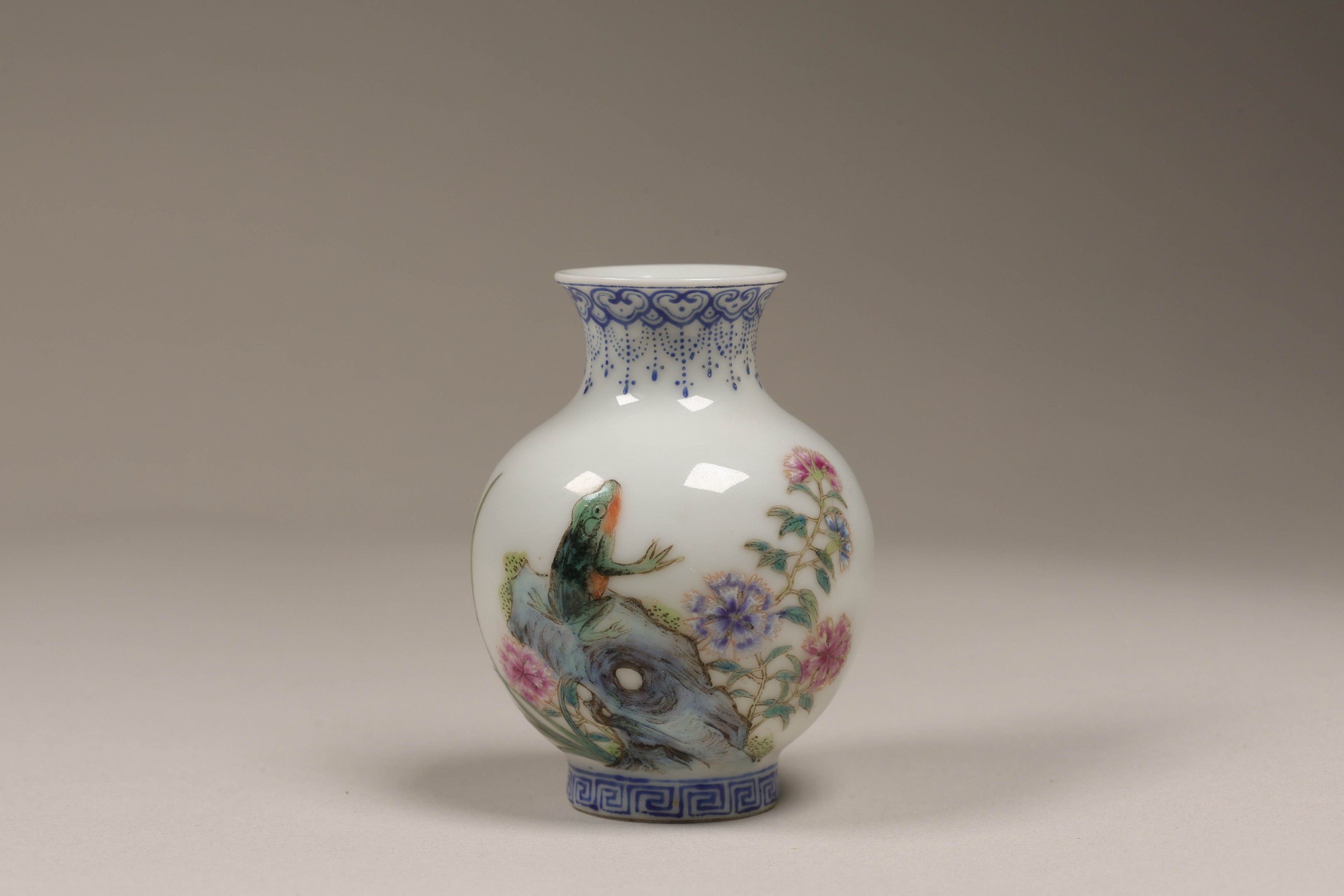 Vase miniature en porcelaine, de forme balustre, à décor en émaux polychromes d’une grenouille sur un rocher, parmi les branches fleuries. Une marque apocryphe Qianlong à quatre caractères sous la base.