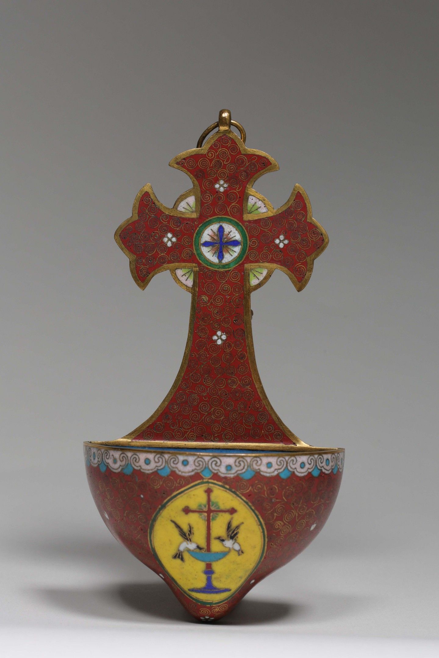 Petit bénitier mural en émaux cloisonnés, le bassin à décor de colombes dans un bénitier dans un cartouche ovale, la partie supérieure prenant la forme d’une croix, l’ensemble émaillé rouge, avec anneaux de suspension.