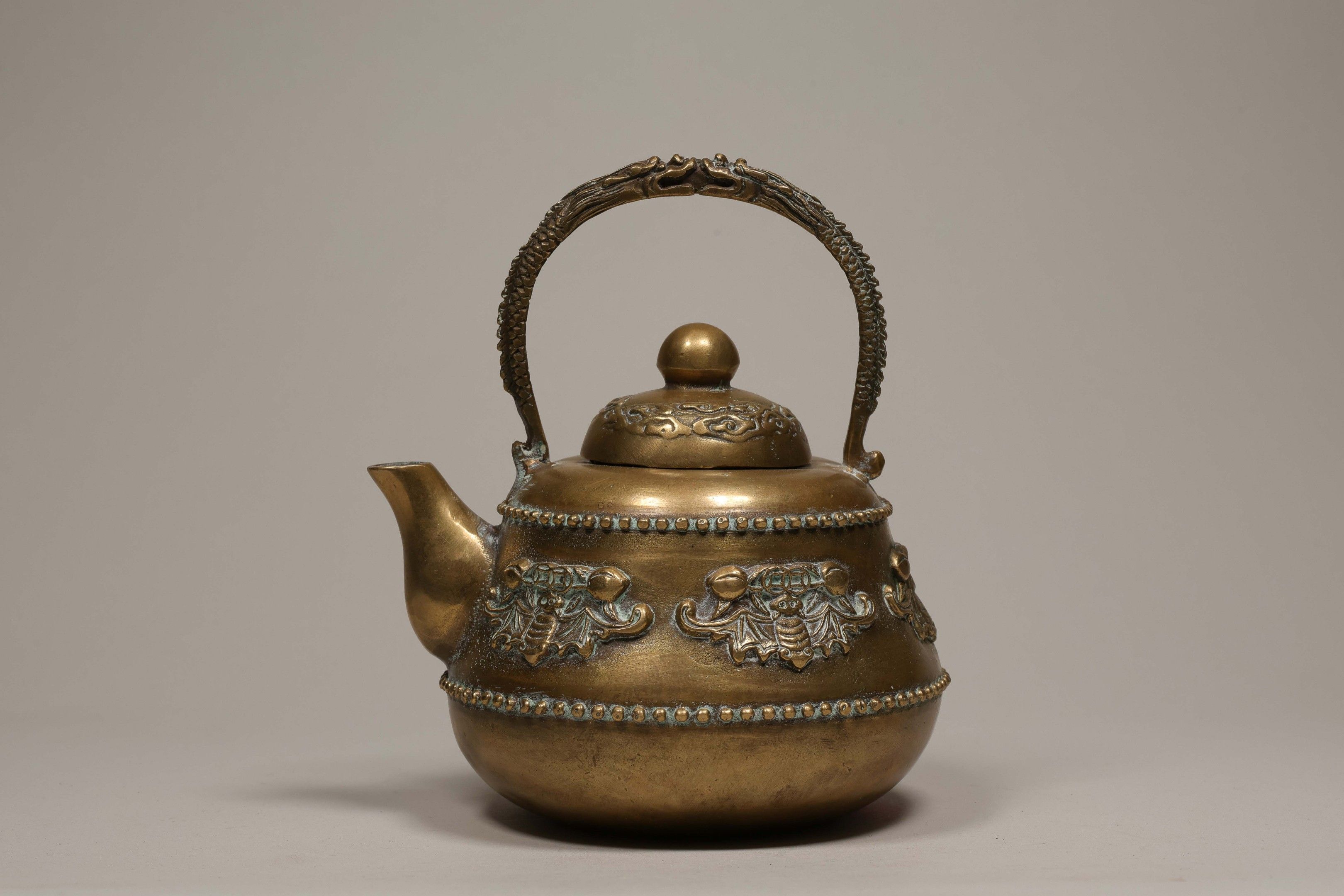 Petite théière en laiton doré à décor de chauve-souris et sapèques.
