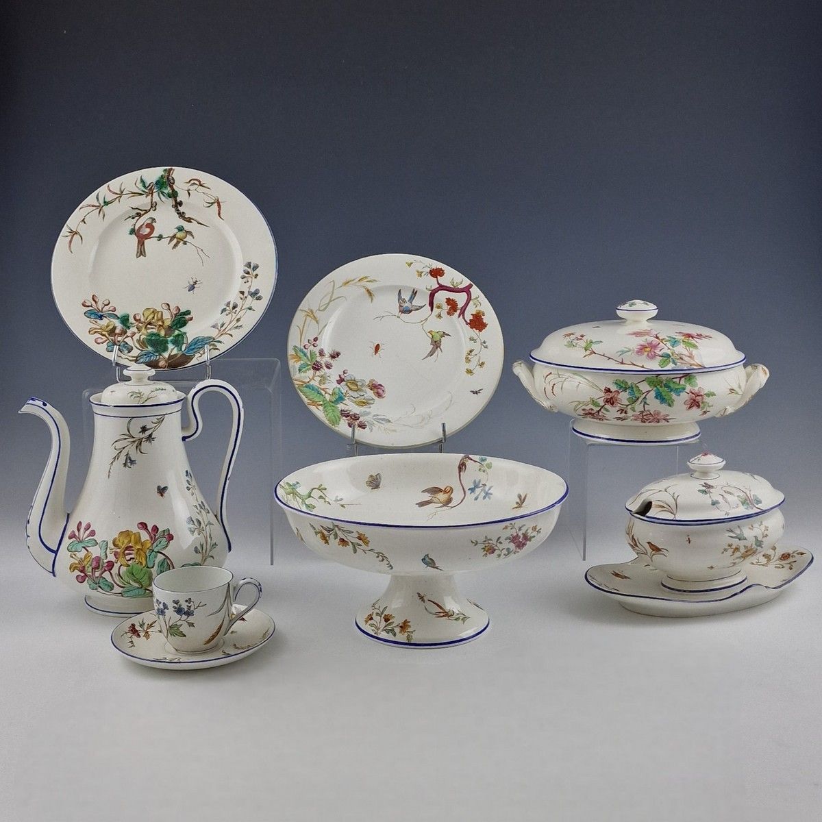 JULES VIEILLARD - BORDEAUX - MODELE NELLA - RARE PARTIE DE SERVICE DE TABLE ET A CAFE 83 PIECES COMPOSITE en faïence fine blanche Circa 1870-1880 à décor polychrome imprimé et pour certaines pièces partiellement moulé d'oiseaux branchés, insectes et fleurs, le bord à filet bleu