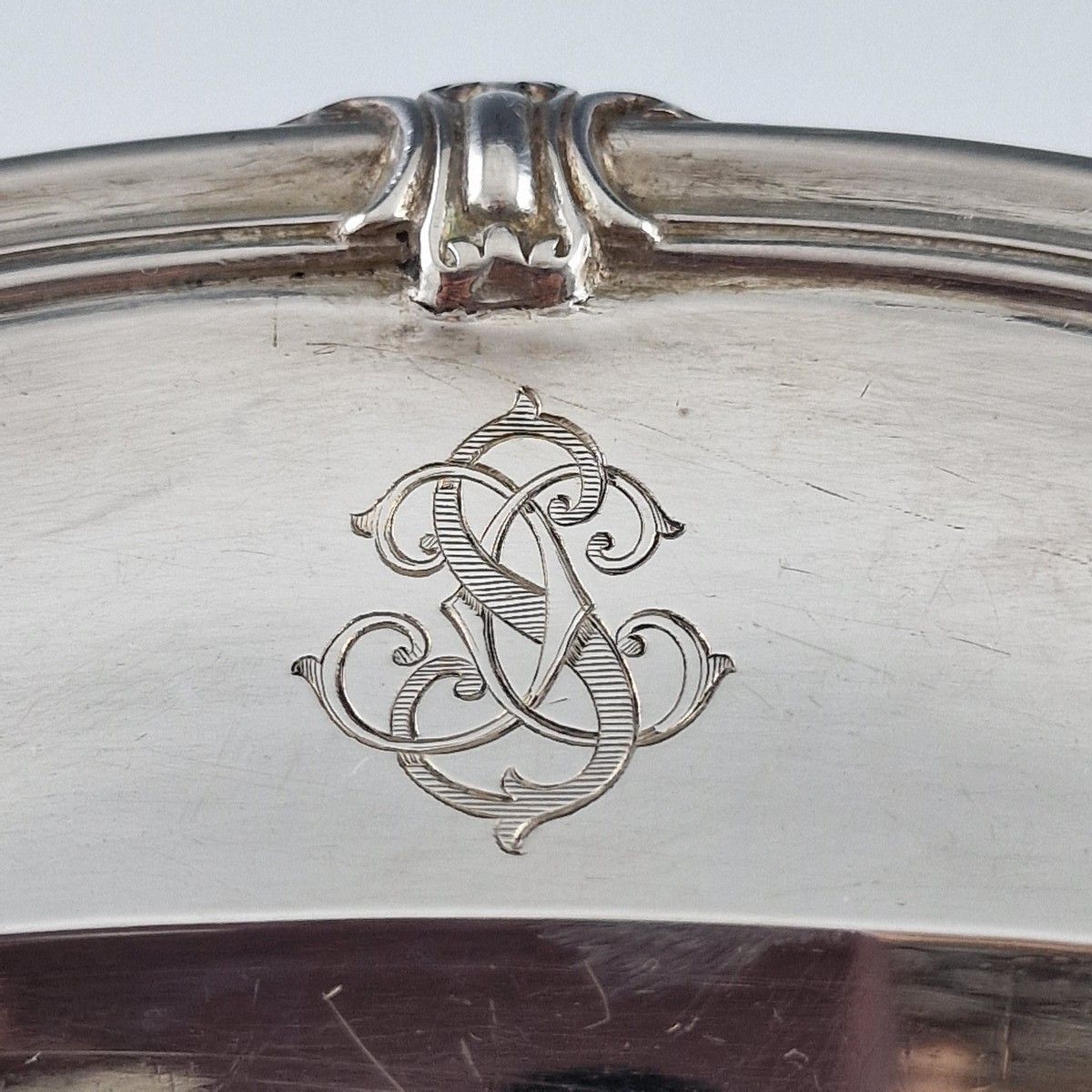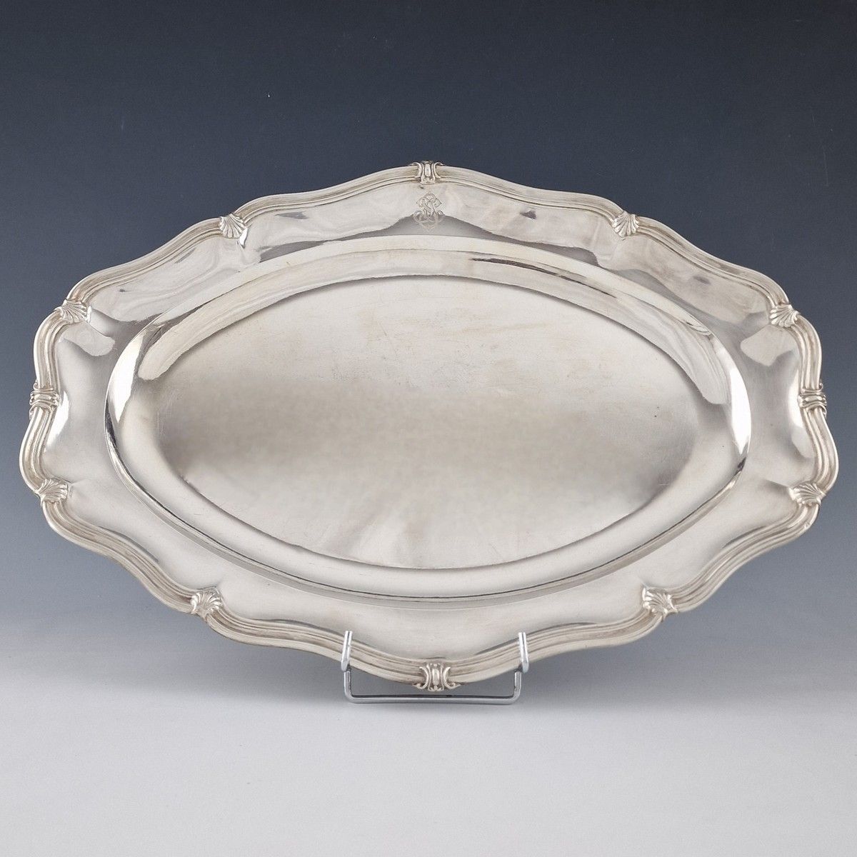 PLAT OVALE à bord mouvementé et côtes pincées en argent Minerve 950 Millièmes de Style Régence -Début du XXème Siècle à décor de coquilles et cartouche et gravé du monogramme XS