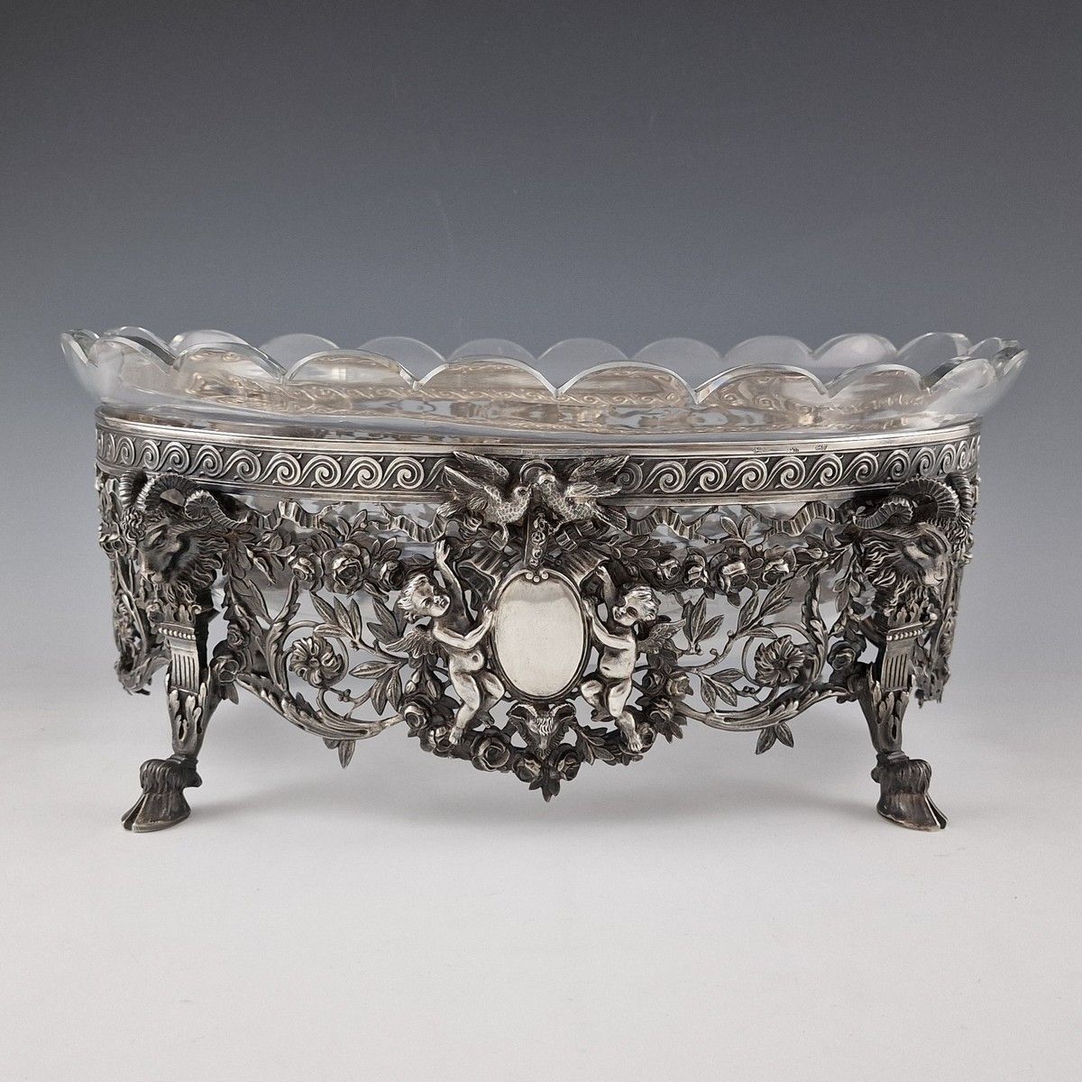 GRANDE ET BELLE JARDINIERE DE TABLE en argent Minerve 950 Millièmes de Style Louis XVI Circa 1900 à riche décor ajouré de cartouches (non gravés) encadrés de deux amours et surmontés d'un couple de colombes dans un encadrement à rinceaux de fleurs et guirlandes de roses, feuilles d'acanthe et de laurier enrubannées